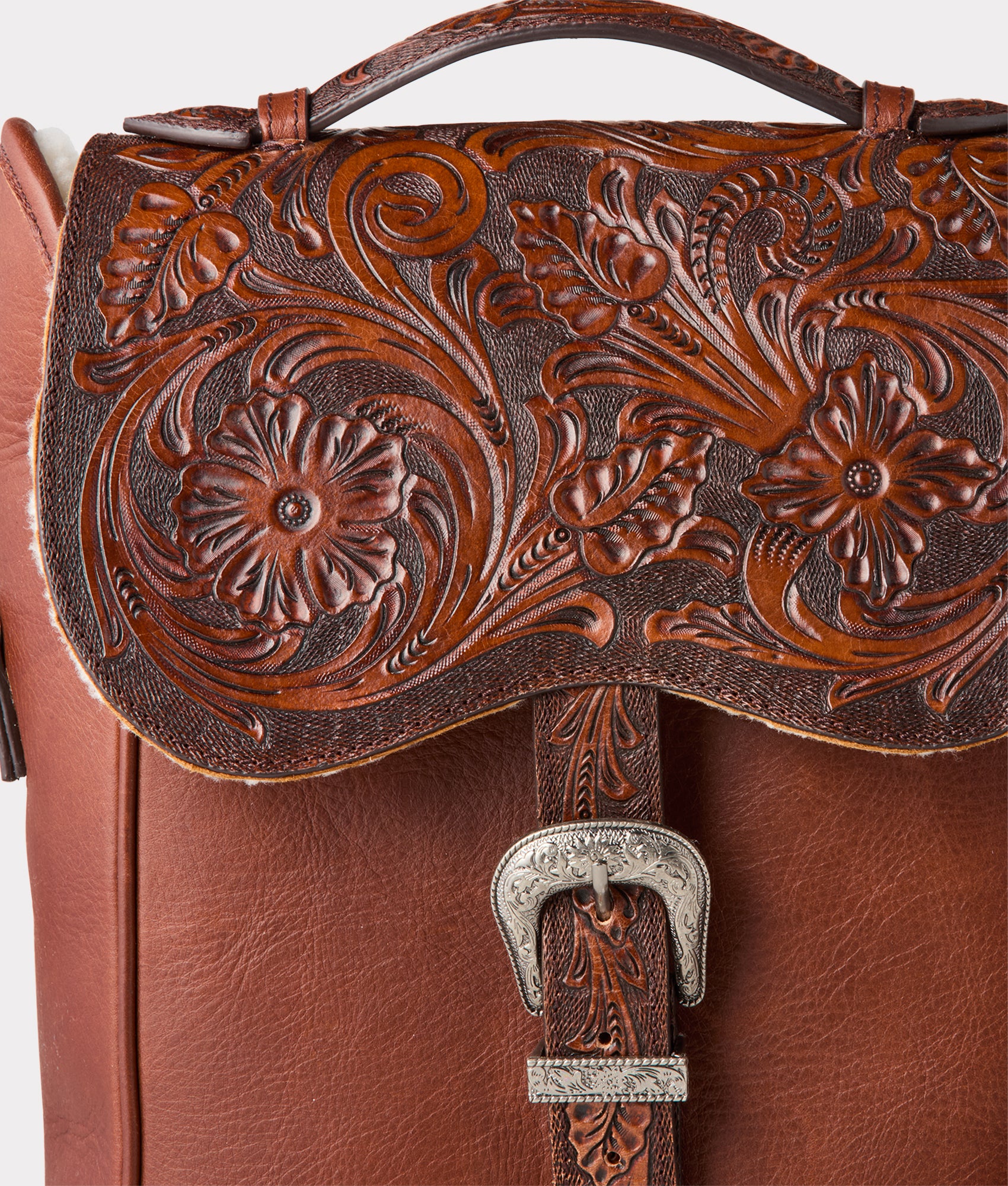 Designed for the discerning sommelier, the Lucchese x Chappellet Wine Bag pairs premium Italian pebble-grain calfskin in Tobacco with a plush Italian curly lamb shearling lining that cushions each bottle. Hand-tooled, hand-painted veg-tanned leather panels in cognac lend an artisan character that deepens with time and use. Finished with antique nickel hardware, it is a carrier that honors the ritual of the pour.