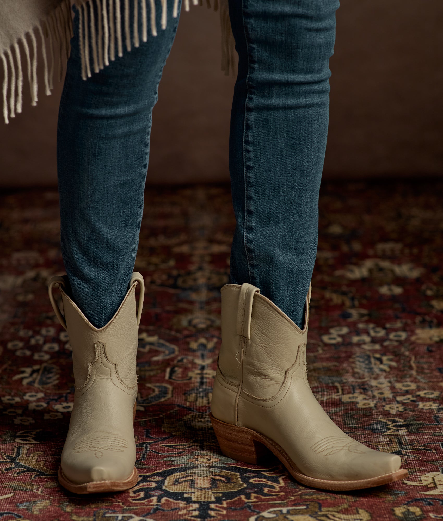 Simple beauty wrapped in a Western bootie silhouette - the Gaby is a shortie that stands tall in the Lucchese lineup. Fashioned from rich Old English goat leather, the Gaby is the blueprint for the quintessential Texas cowgirl. The Gaby is made for memories. Handmade in Texas.