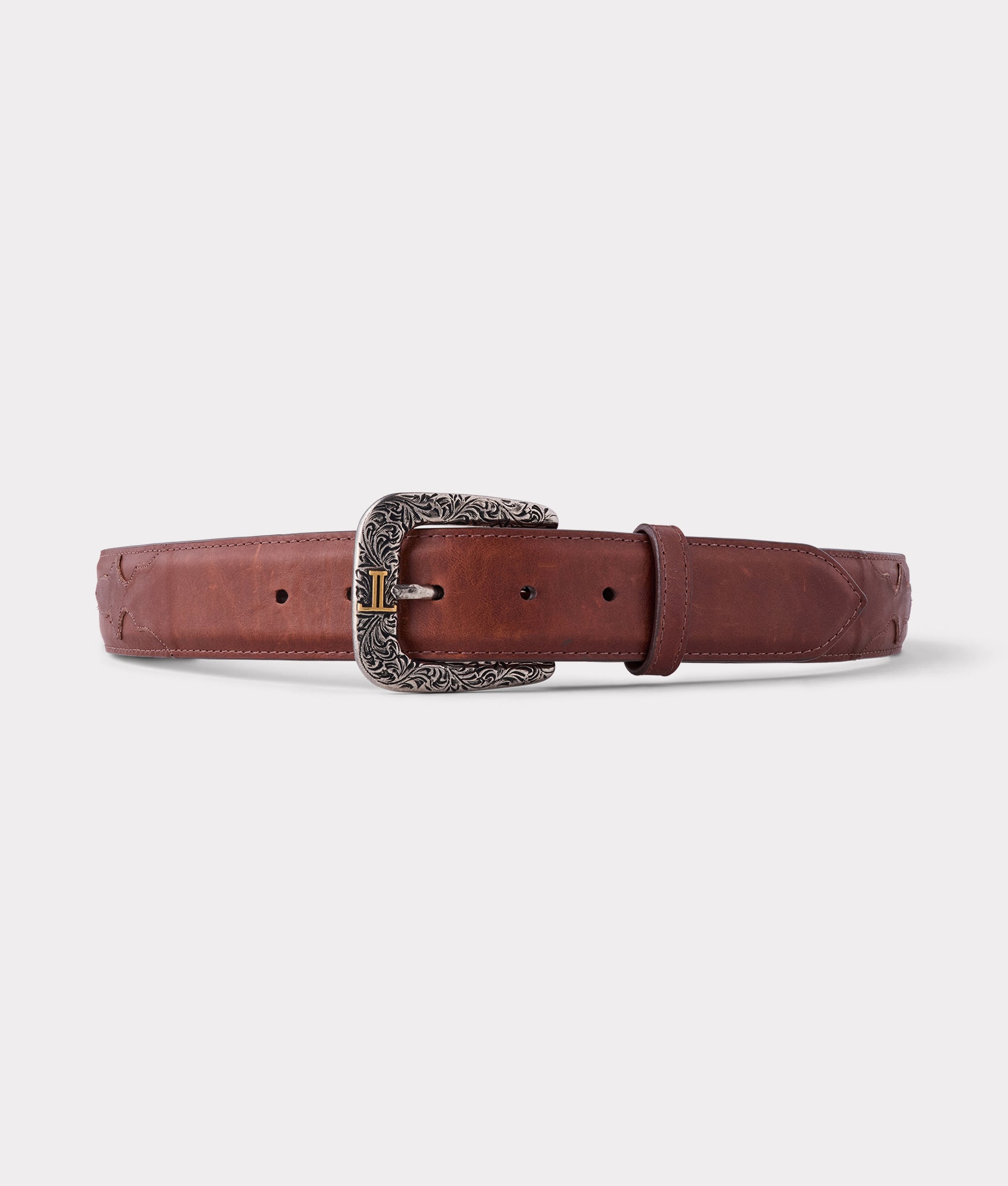 Lucchese men's belt made with ranch hand cowhide leather. Lucchese craftsmen use a unique polish method that create different hues and add texture to the leather, giving it a vintage look. The belt is made with durable cowhide leather and features a silver plated buckle with Western details. Handmade in Texas. 1.5" wide Removable buckle
