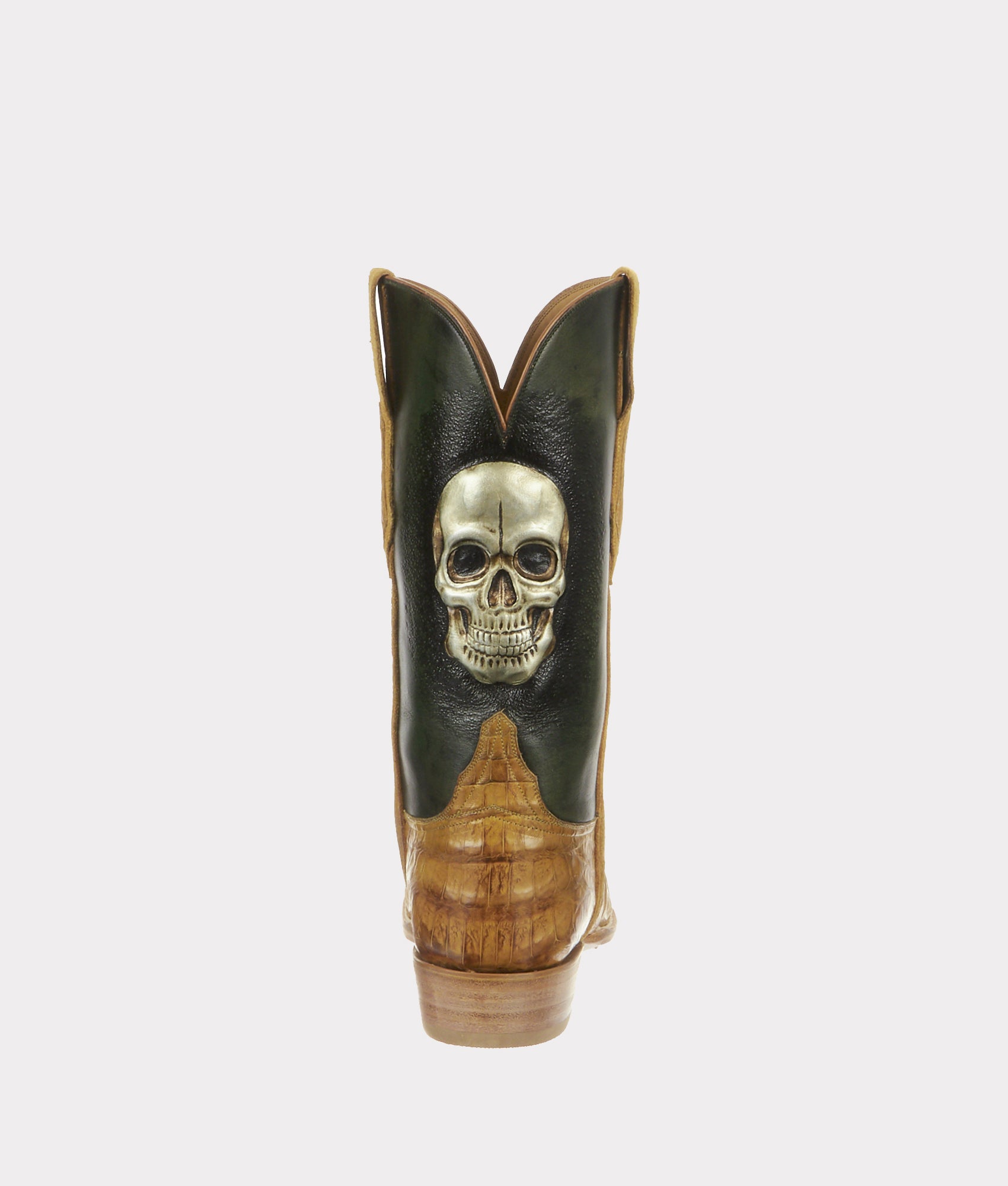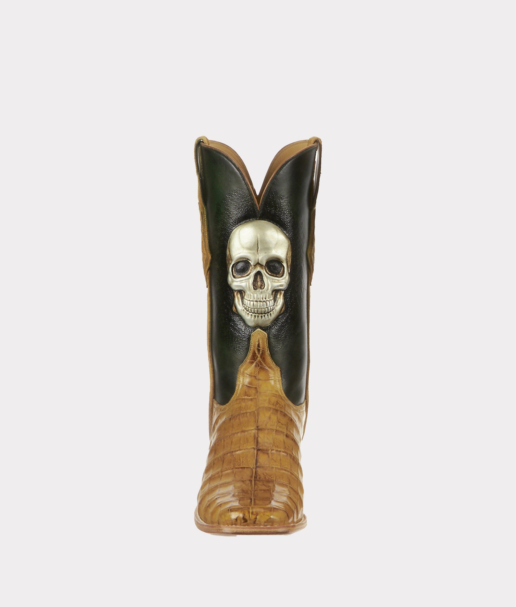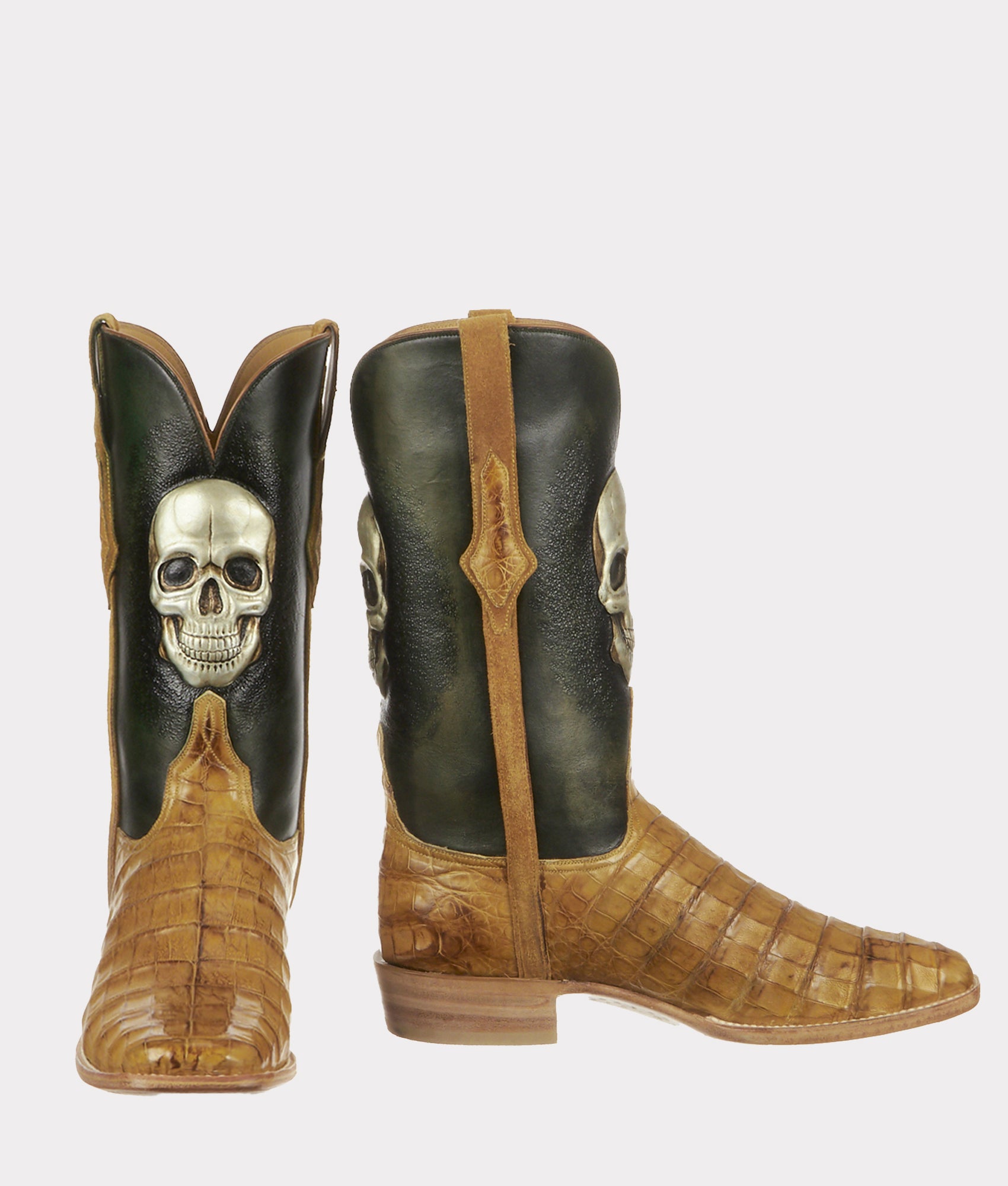 No journey is too long with good company - and Romano is just that. Crafted from Giant Caiman Belly and Goat, this statement-making style has a hand-tooled skull on the quarters adorned with pull straps named after our men's designer. Guaranteed to grab attention, Romano calls ramblers, gamblers, and bikers from the barn or barstool to the open road. Handmade in Texas.