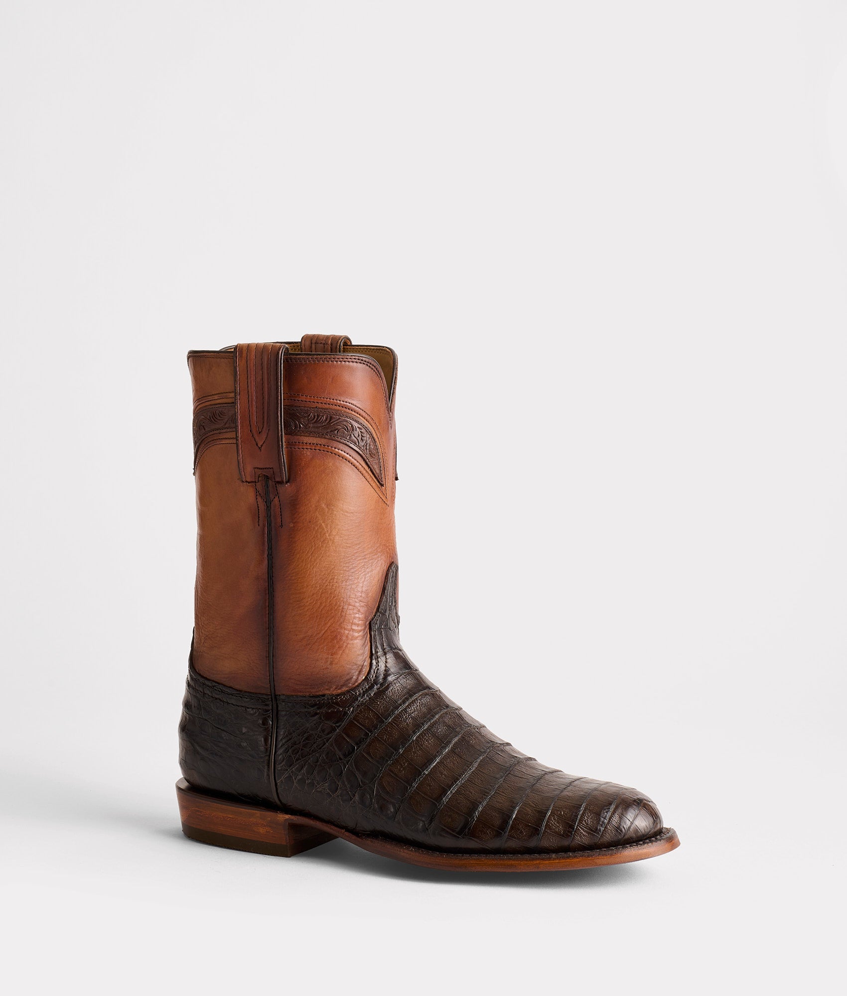 The Wilson is crafted from rich Ultra Belly Caiman hide and beautifully tooled cowhide leather - elite Western sophistication through and through. Premium benchmade components that have resulted in a favored style amongst roper silhouette's. Handmade in Texas.