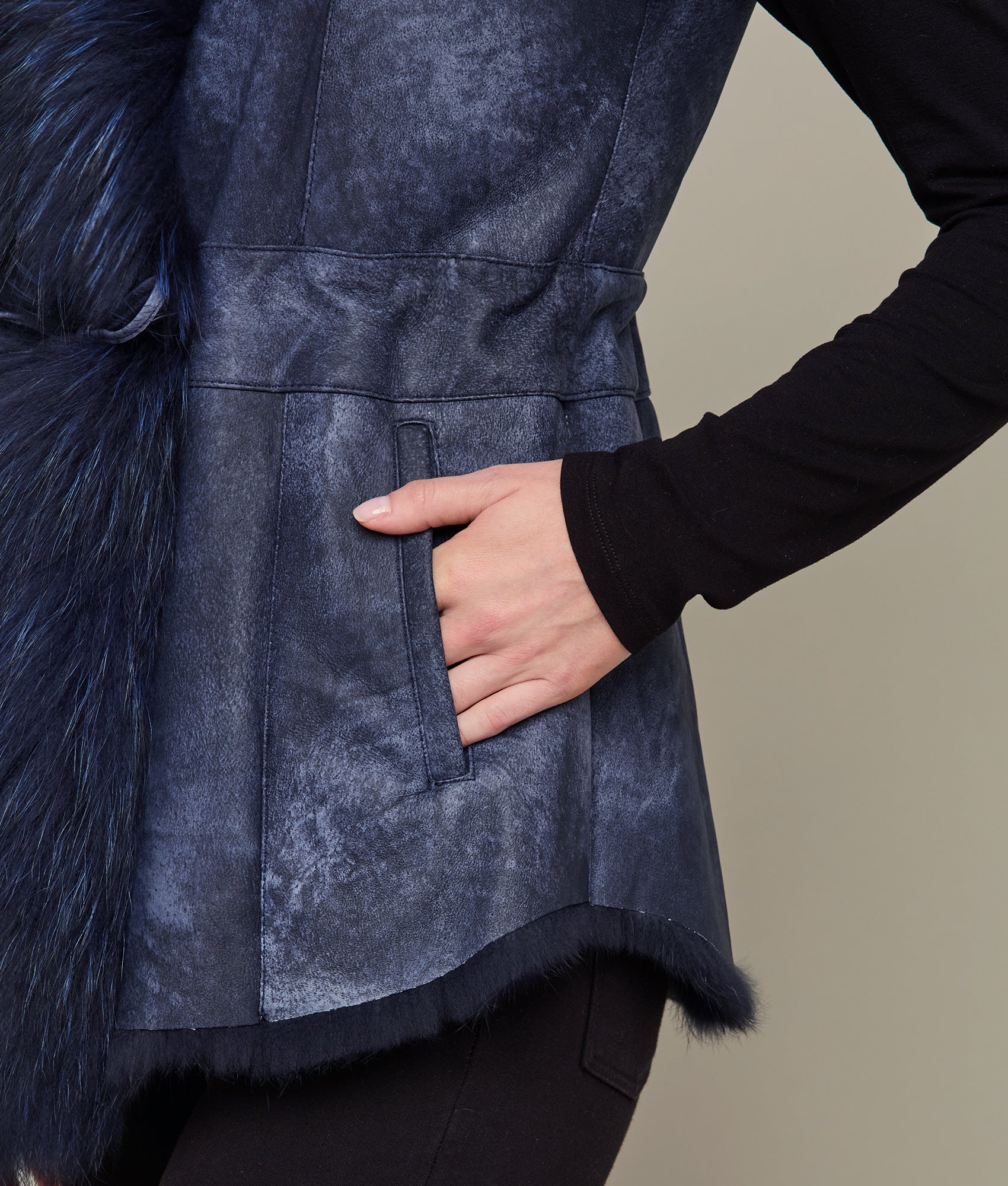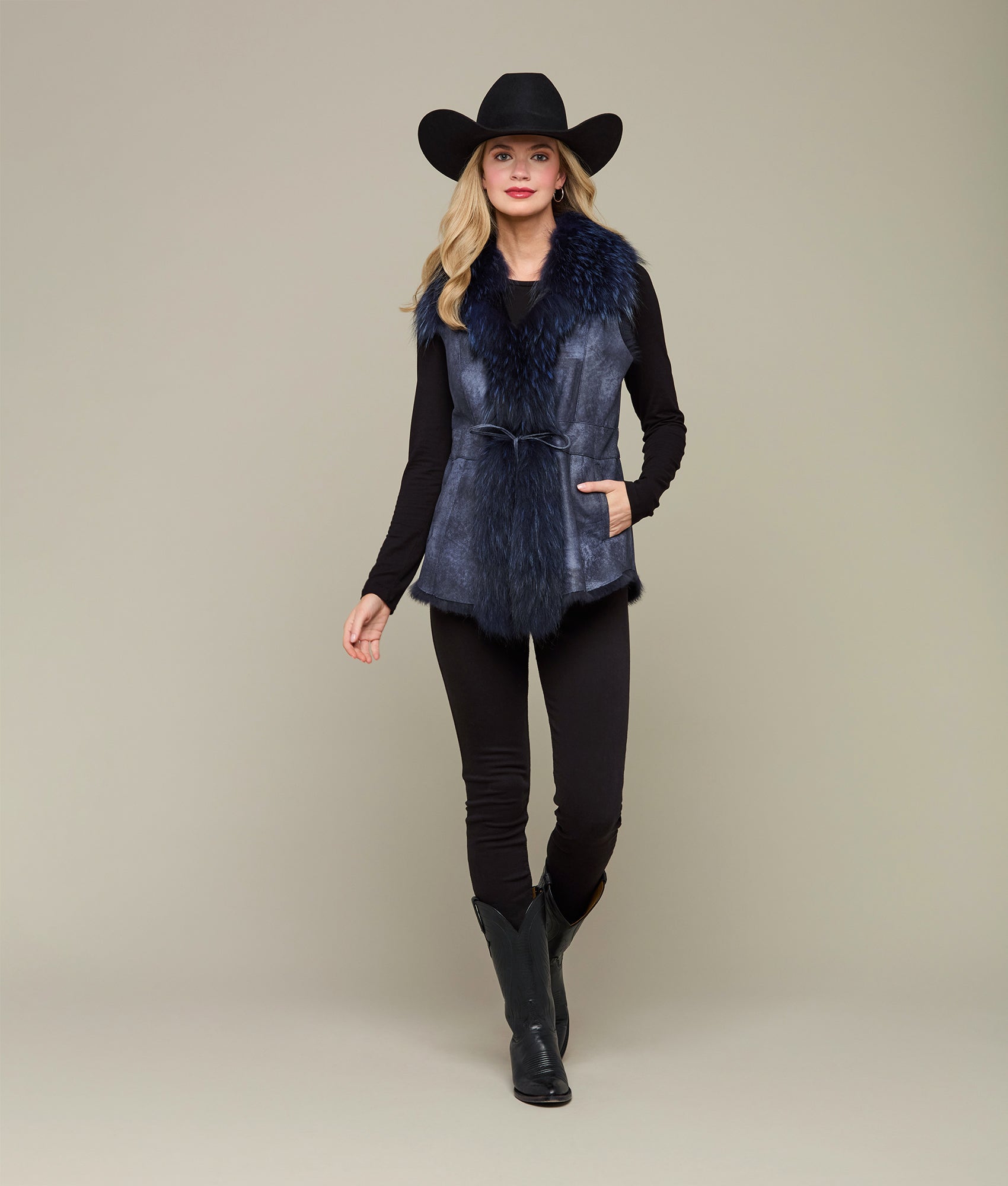 Embrace the effortless fashion with our shearling-lined Serphina Fur Vest. Crafted from soft, high-quality shearling, this vest offers exceptional warmth and a plush texture. The combination of deep navy fox fur, leather, and shearling are the pinnacle of luxury. Model is 5'9.