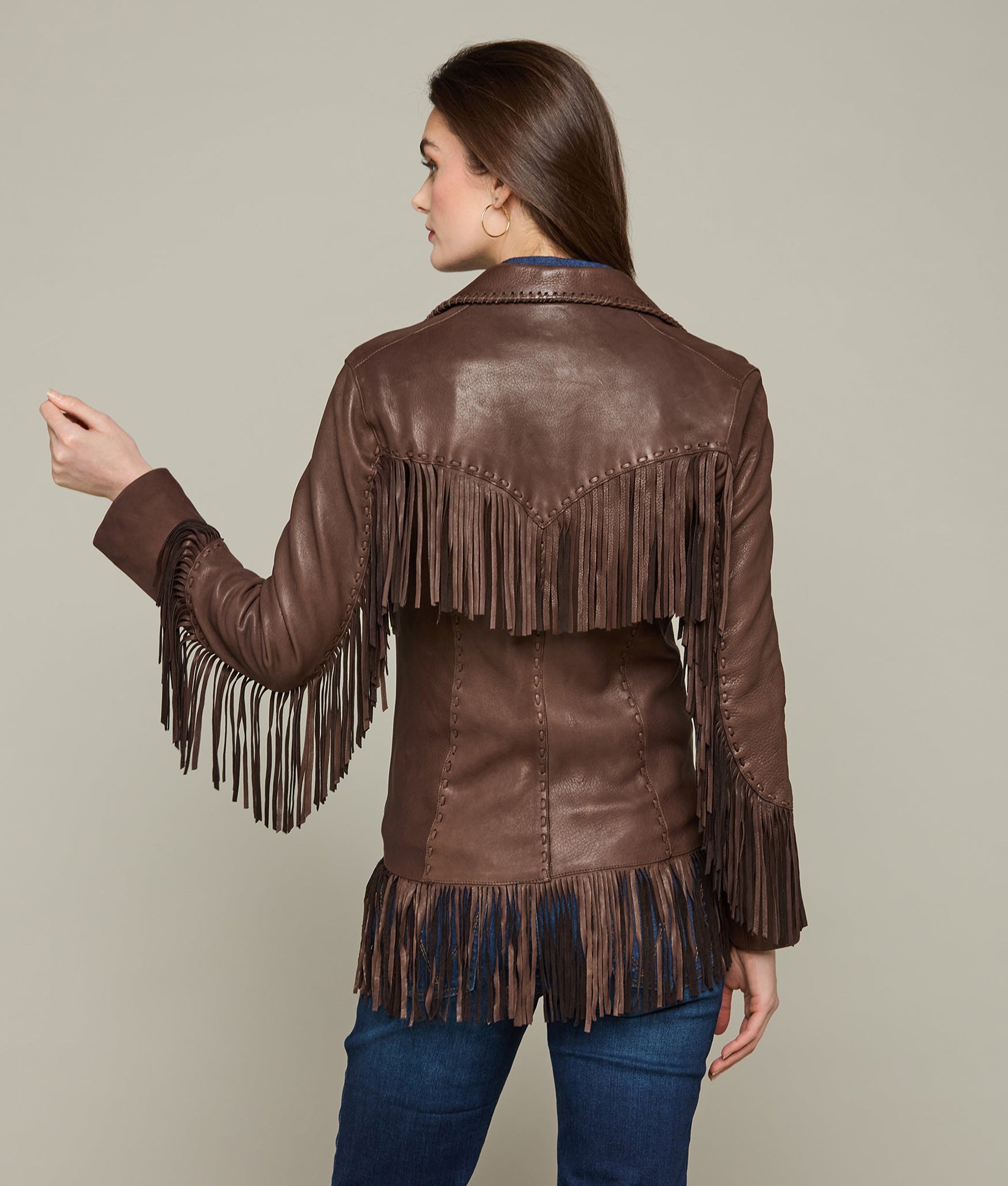 The Tallulah Fringe Jacket is Western chic. Fashioned from 100% leather and 100% style, this whipstitch jacket exudes cowgirl spirit. Two welted-whipstitch side pockets allow you to reach for personal...