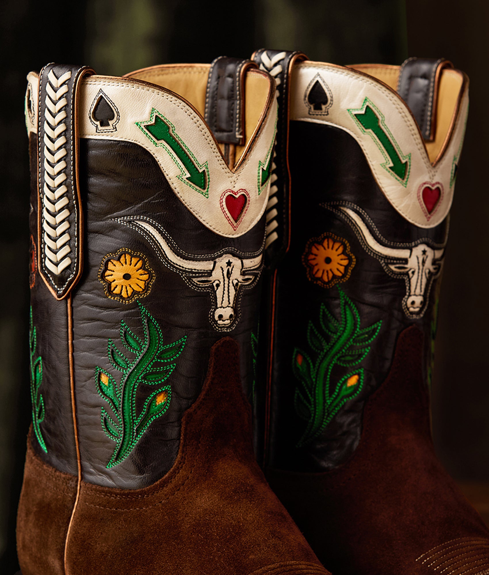 The Watchman is a quiet guardian—a hybrid style that keeps a low profile yet holds your gaze. Its muted base, crafted from smooth Ranch Hand leather and silky Italian Suede, is accented with pops of color in the Victorino inlay. This eclectic contrast reveals itself only when the moment calls. The Watchman merges the shaft height of a roper with the toe and heel of a western boot, creating a thoughtful balance between two classic silhouettes. Traditional cowboy hues anchor the vamp, refined and understated under denim. But cross your legs, and the quarter’s vibrant inlays reveal themselves—subtle, intentional, and quietly confident. This boot doesn’t seek attention but stands guard, protecting, preserving, and enduring the West. Handmade in Texas.
