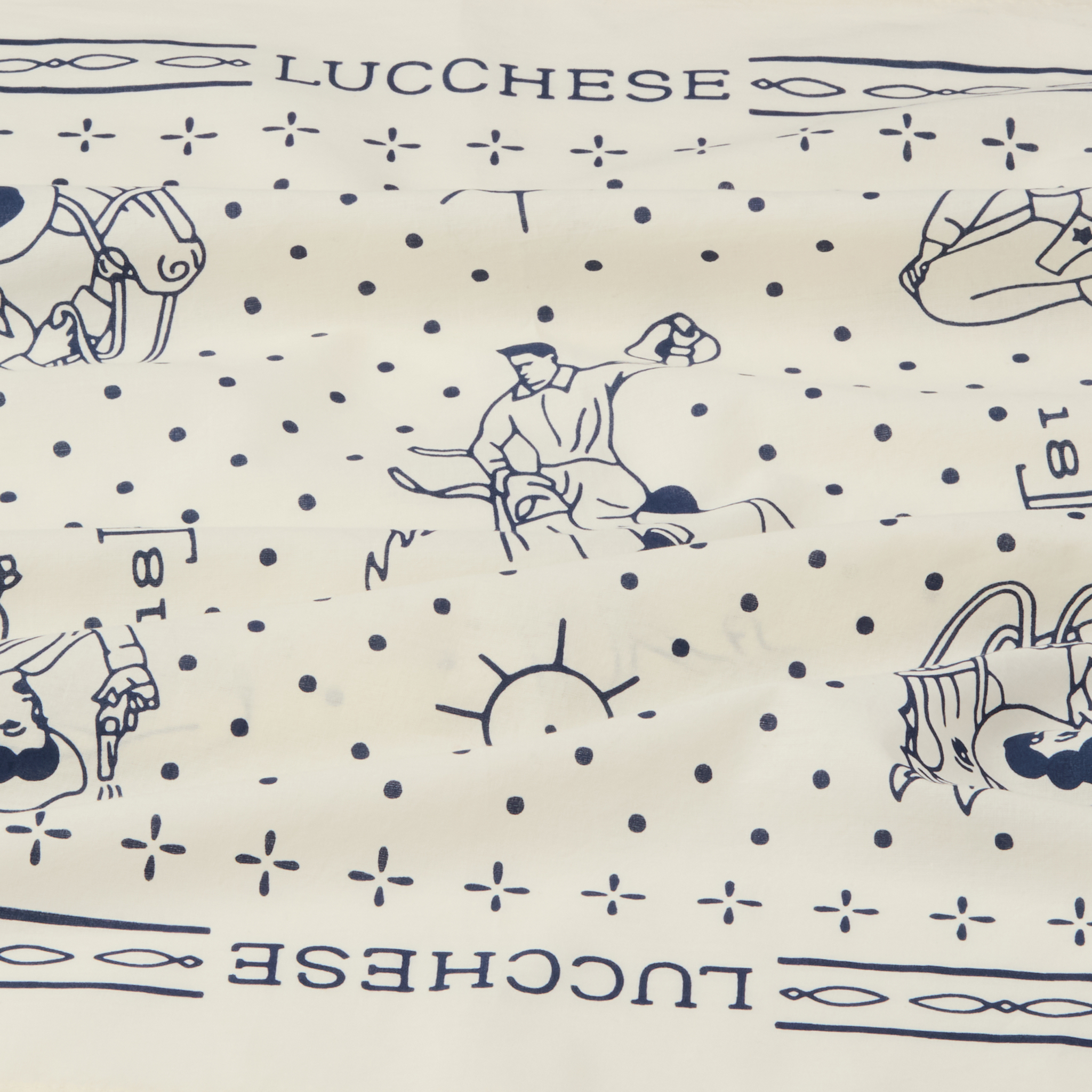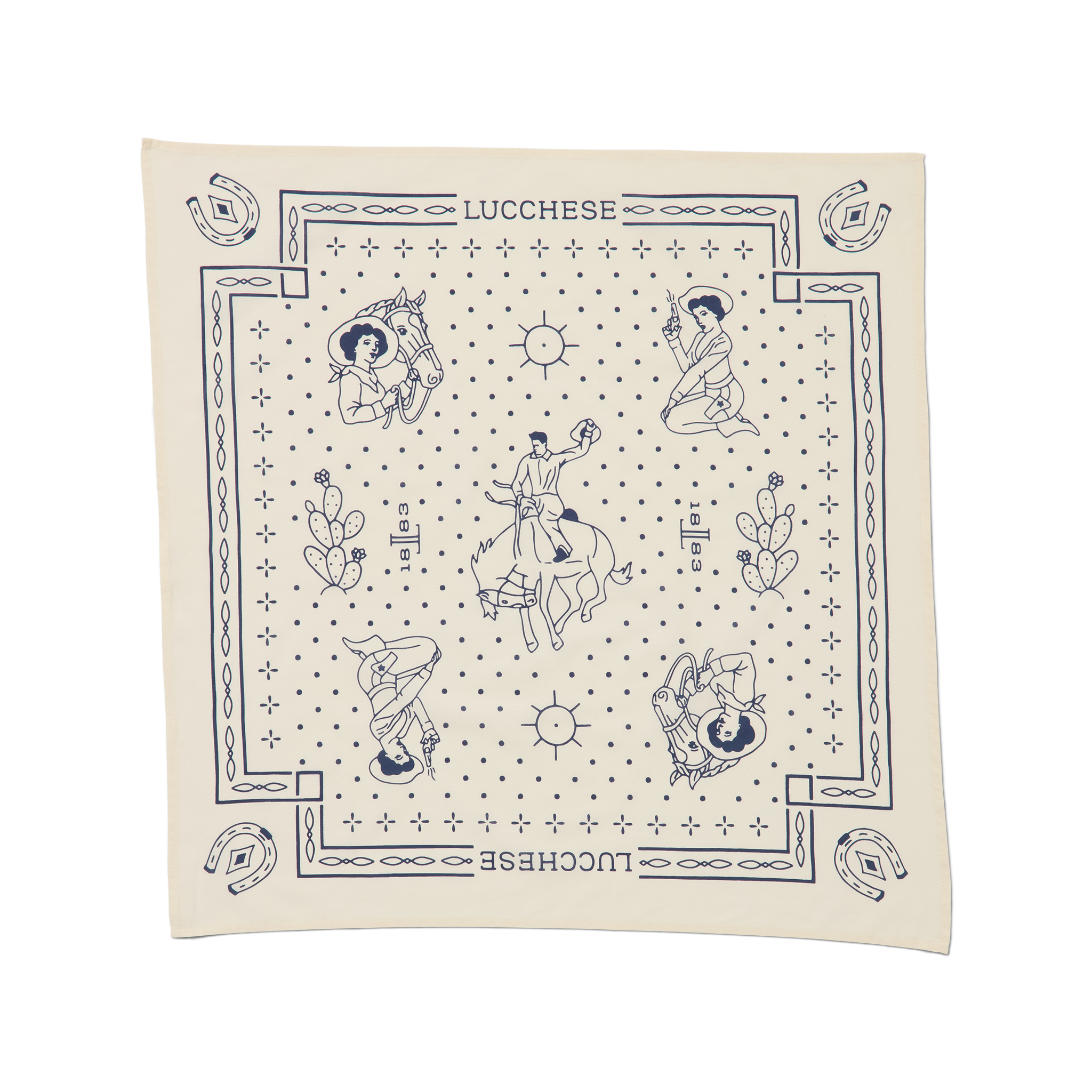 Made in the USA and perfect to make your own protective facemask, our Lucchese bandanas feature a retro western motif, complete with a bucking cowboy and cowgirl, cactus, and horseshoes. 100% cotton. Dimensions: 21.5" x 21.5"