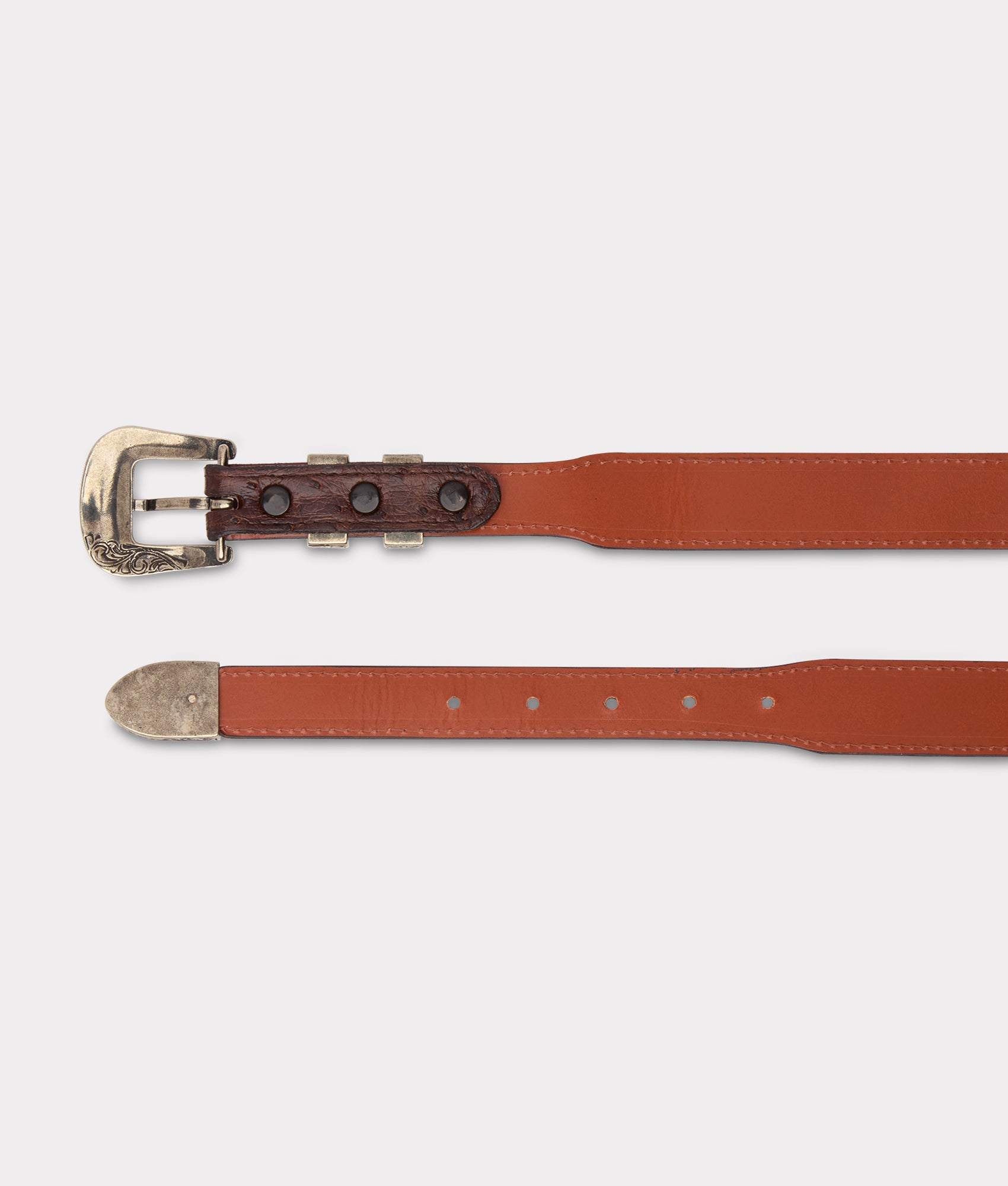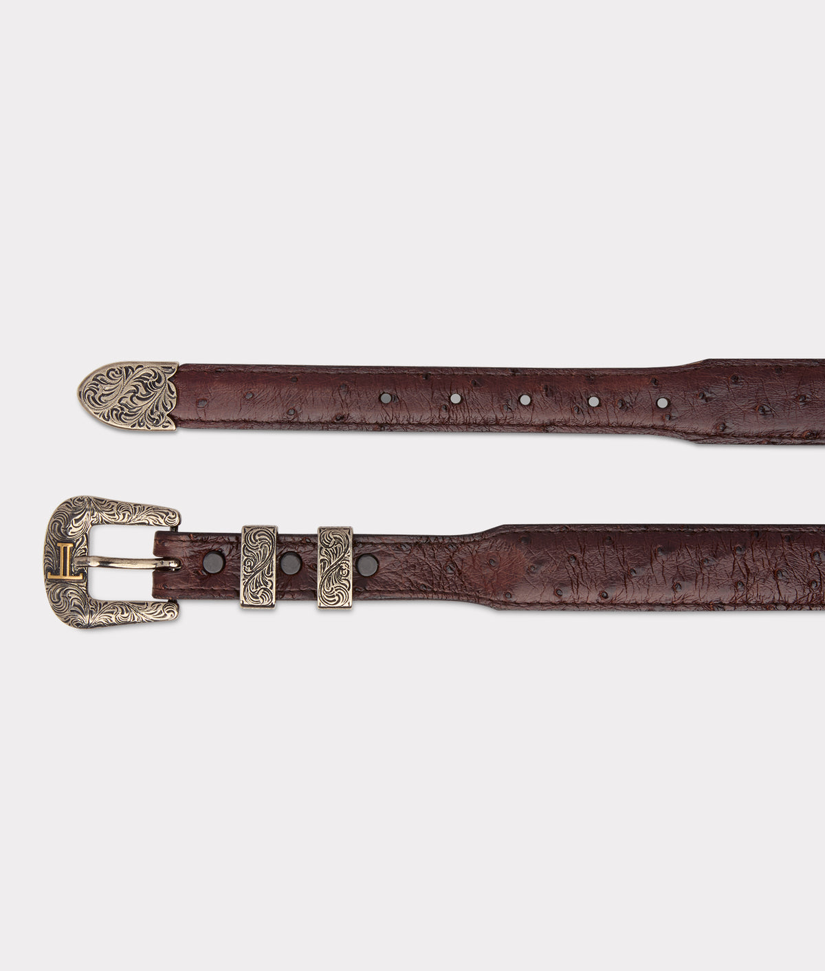 Lucchese’s exotic belt made with full quill ostrich leather. The belt’s full quill ostrich leather is complemented by an ornate silver plated buckle giving it the ultimate Western touch, making it versatile, handsome, and stylish. This belt was designed to be worn with matching full quill ostrich boots, but can also be paired with jeans or a suit. Handmade in Texas. 1.25" tapered down to 1" Silver plated tip Removable buckle