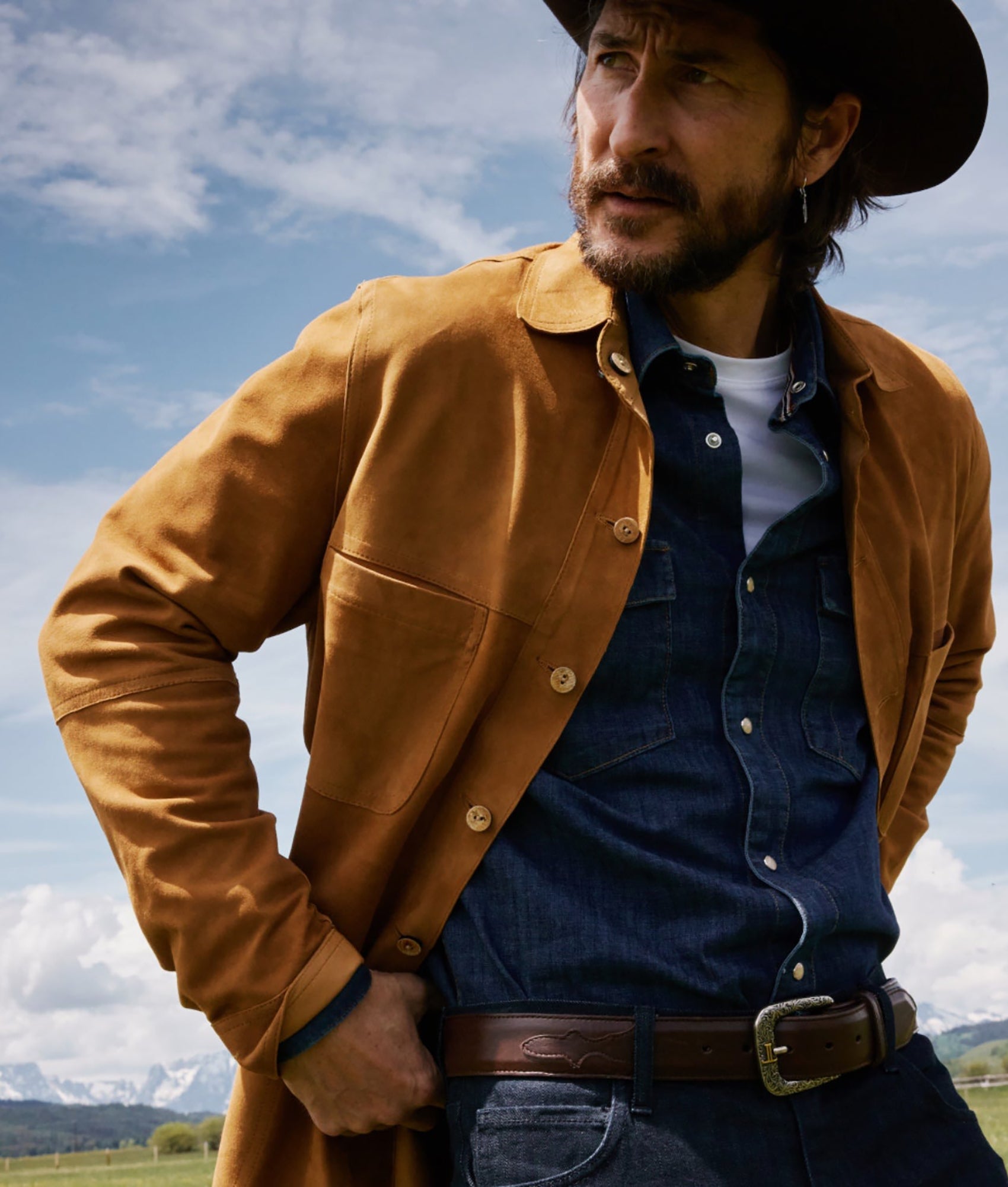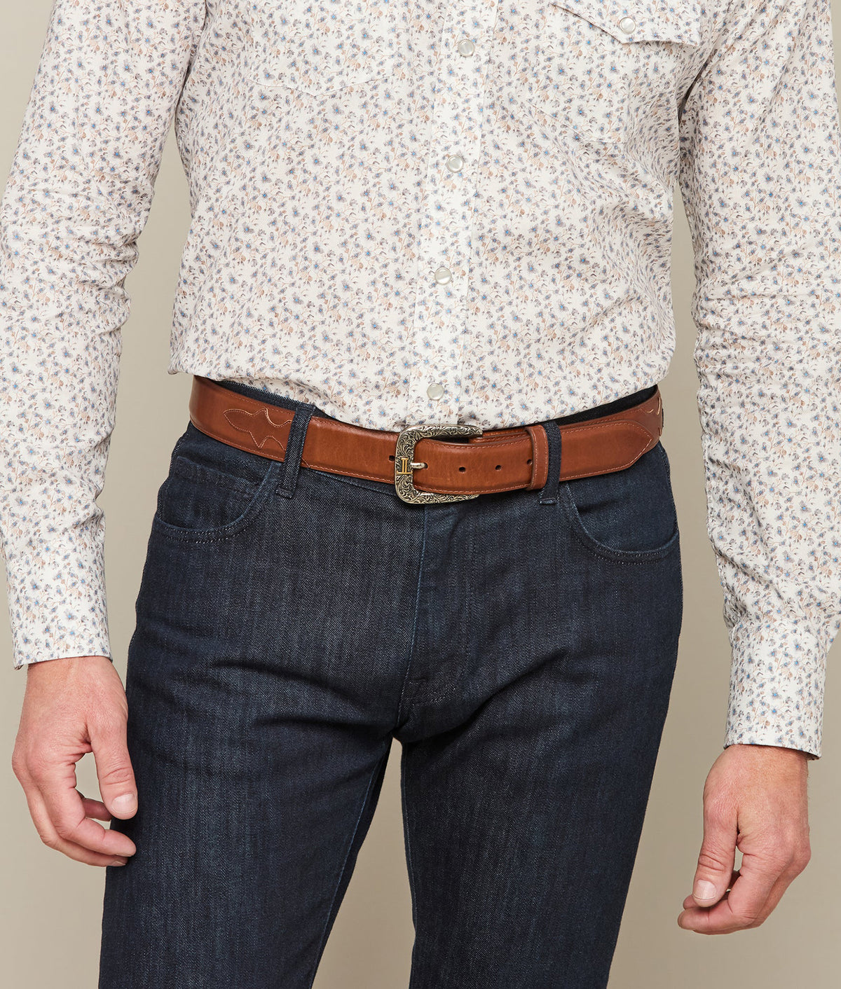 Lucchese men's belt made with ranch hand cowhide leather. Lucchese craftsmen use a unique polish method that create different hues and add texture to the leather, giving it a vintage look. The belt is made with durable cowhide leather and features a silver plated buckle with Western details. Handmade in Texas. 1.5" wide Removable buckle
