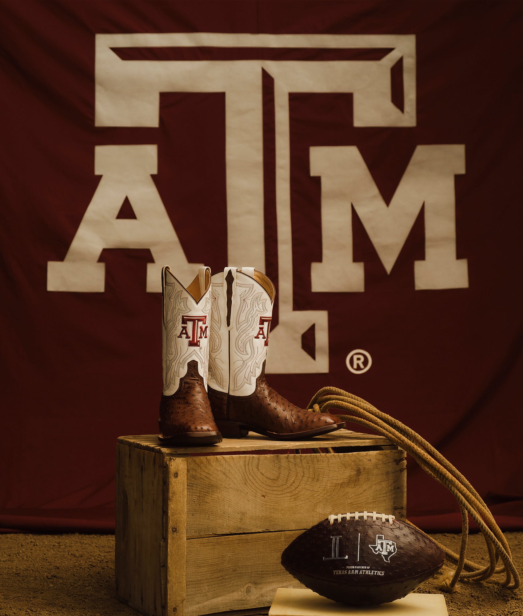 A tribute to the heart of Aggie Baseball since 1978, The Olsen is named after Texas A&M’s beloved baseball field and honors hard work and dedication that define the 12th Man. This handcrafted chocolate Full Quill Ostrich boot embodies tradition and grit. Featuring the iconic Texas A&M Block logo on the quarters, The Olsen pays bold homage to Aggieland’s legacy.