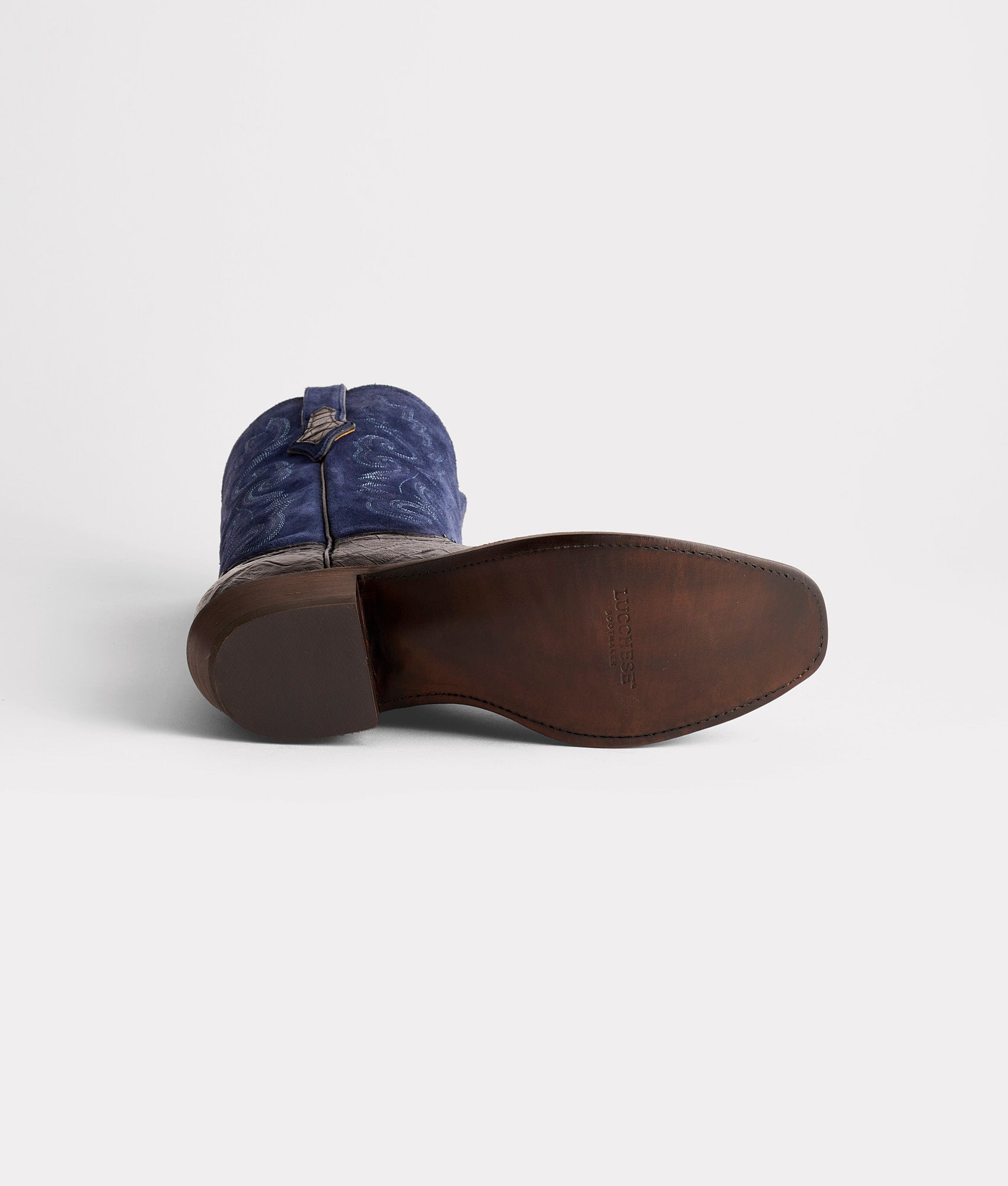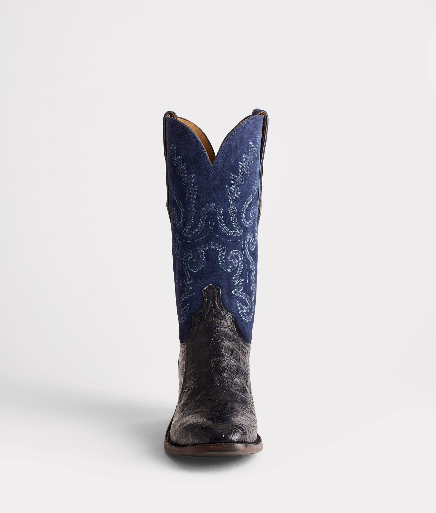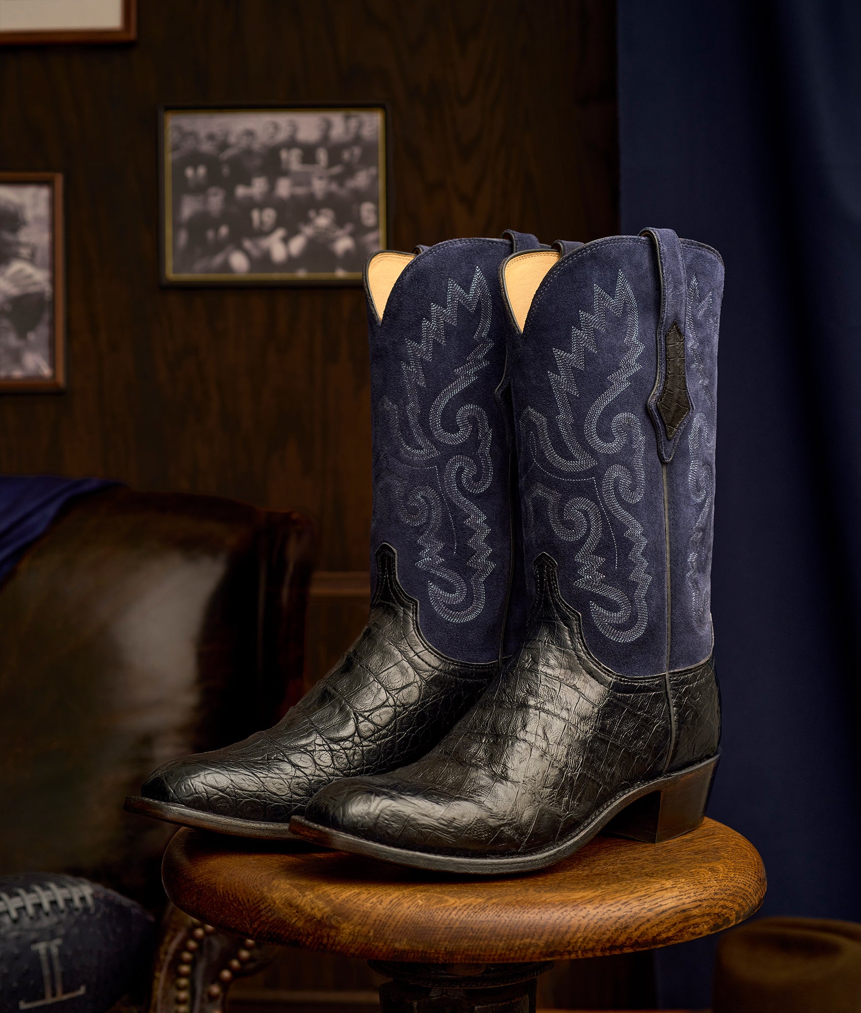 The Signal takes its name from a moment on the range—when a cowboy gives the signal, and the herd moves, the team rides, and the work begins. It’s a gesture of trust, instinct, and unspoken authority. Just like the cowboy’s cue, this boot speaks without saying a word—sharp, intentional, and ready to lead. Black Giant Caiman Belly meets deep blue Italian suede in a bold, unexpected pairing. While these two colors might traditionally clash, their contrasting textures tell us something different. The smooth, glossy finish of the Giant Caiman Belly plays perfectly against the soft, matte richness of the Italian Suede. Handmade in Texas.