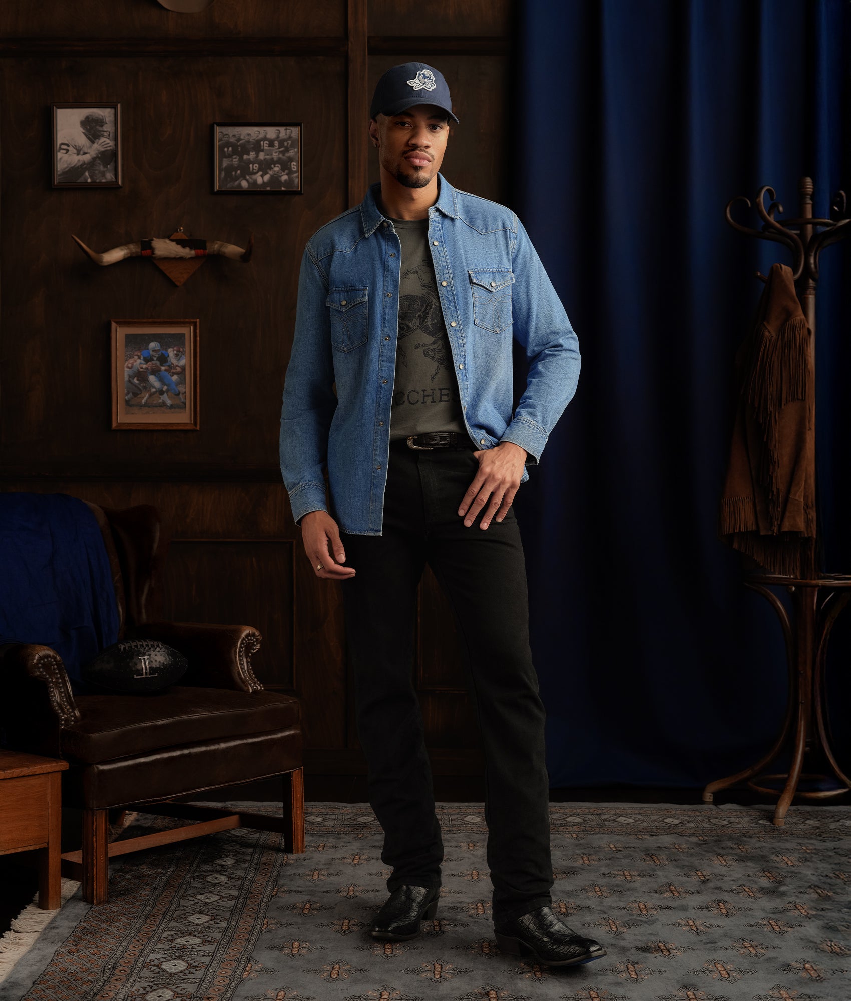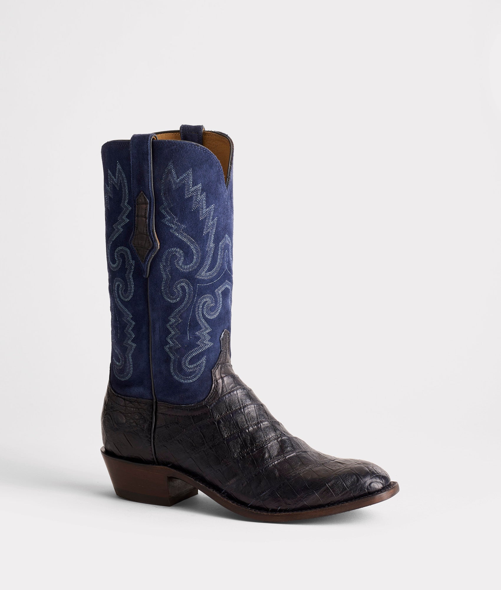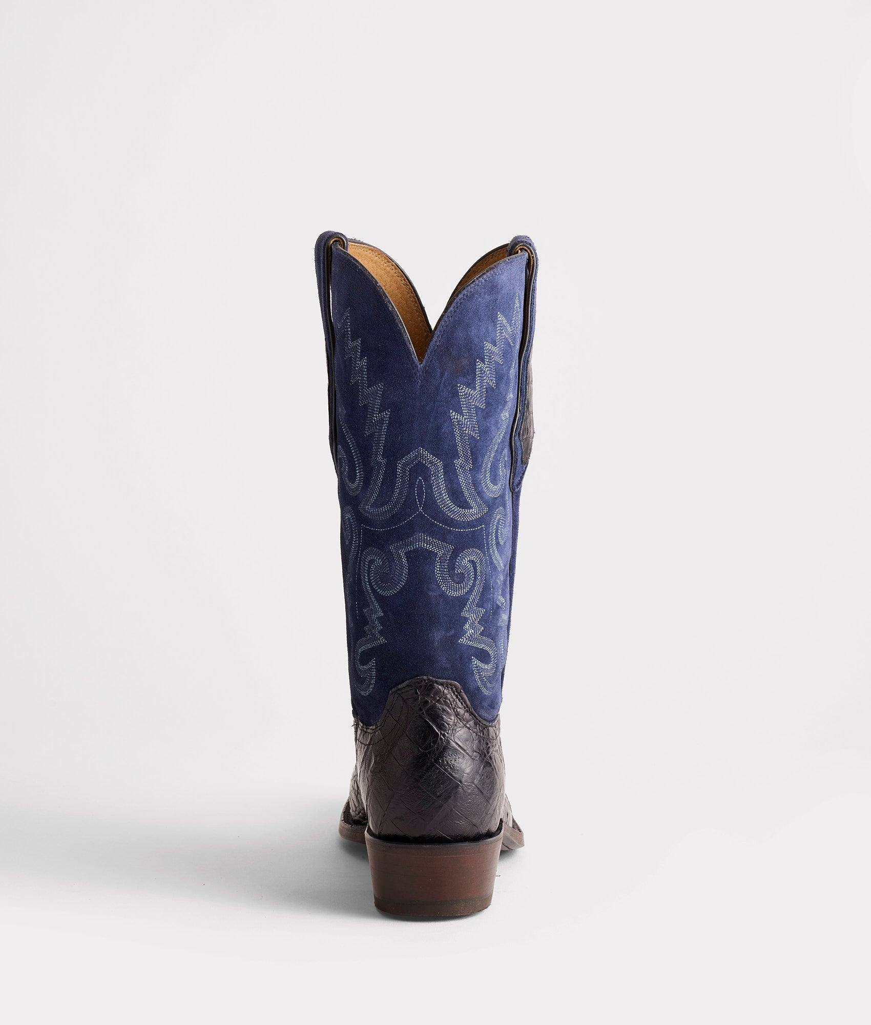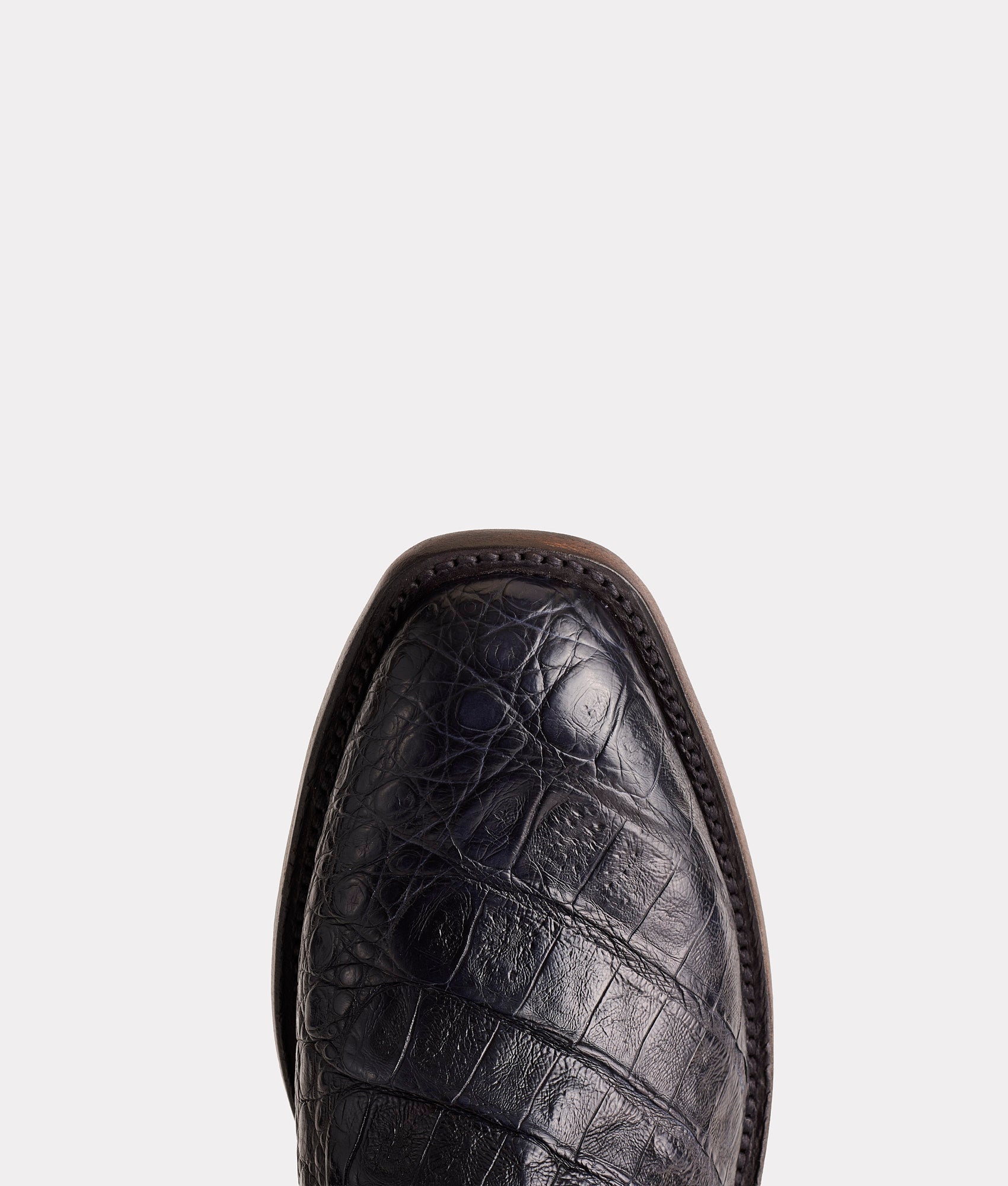 The Signal takes its name from a moment on the range—when a cowboy gives the signal, and the herd moves, the team rides, and the work begins. It’s a gesture of trust, instinct, and unspoken authority. Just like the cowboy’s cue, this boot speaks without saying a word—sharp, intentional, and ready to lead. Black Giant Caiman Belly meets deep blue Italian suede in a bold, unexpected pairing. While these two colors might traditionally clash, their contrasting textures tell us something different. The smooth, glossy finish of the Giant Caiman Belly plays perfectly against the soft, matte richness of the Italian Suede. Handmade in Texas.