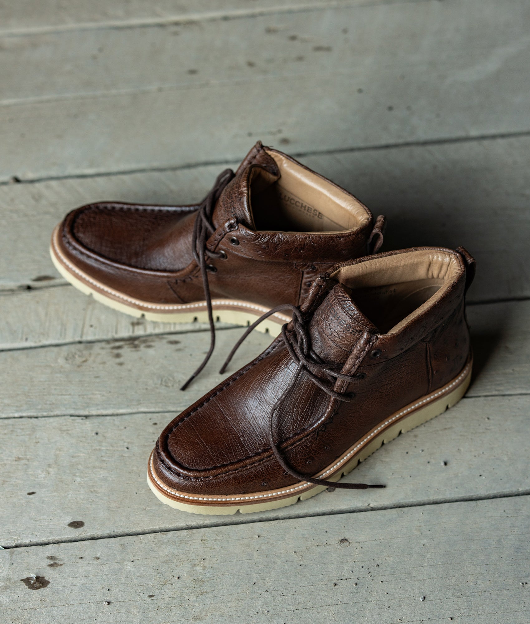 One outsole. Endless versatility. Named after the outdoor-inspired Ridgeline outsole, the collection was designed with the adventurer in mind – rugged and ready for action, but simultaneously subdued for casual occasions. Since 1883, Lucchese has abided by the unyielding principle, “Fashion Follows Function” – Smooth Ostrich all over and grit throughout. Lace up and slip on this rugged 3-eye tie made from the most rugged materials. But rugged doesn’t always mean rough… internally, that is. Whether it’s muddy trails or slippery sidewalks, our team prioritizes comfort by utilizing the softest, most durable components – curated to a lifestyle that bridges the gap of mild and wild. The wedge Ridgeline outsole offers maximum anti-slip grip from the aggressive tread pattern. Get and go where boots have never tread before. Impromptu expeditions and planned excursions are why our team developed this collection. Summit your Ridgeline!