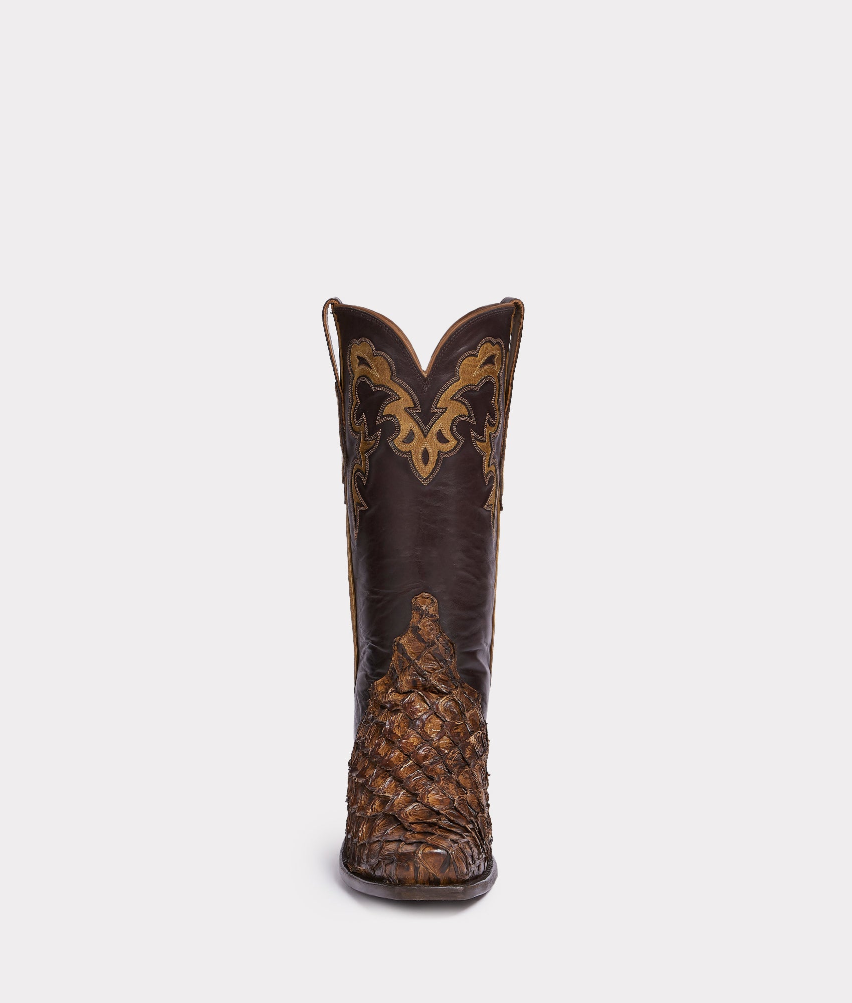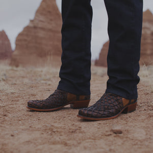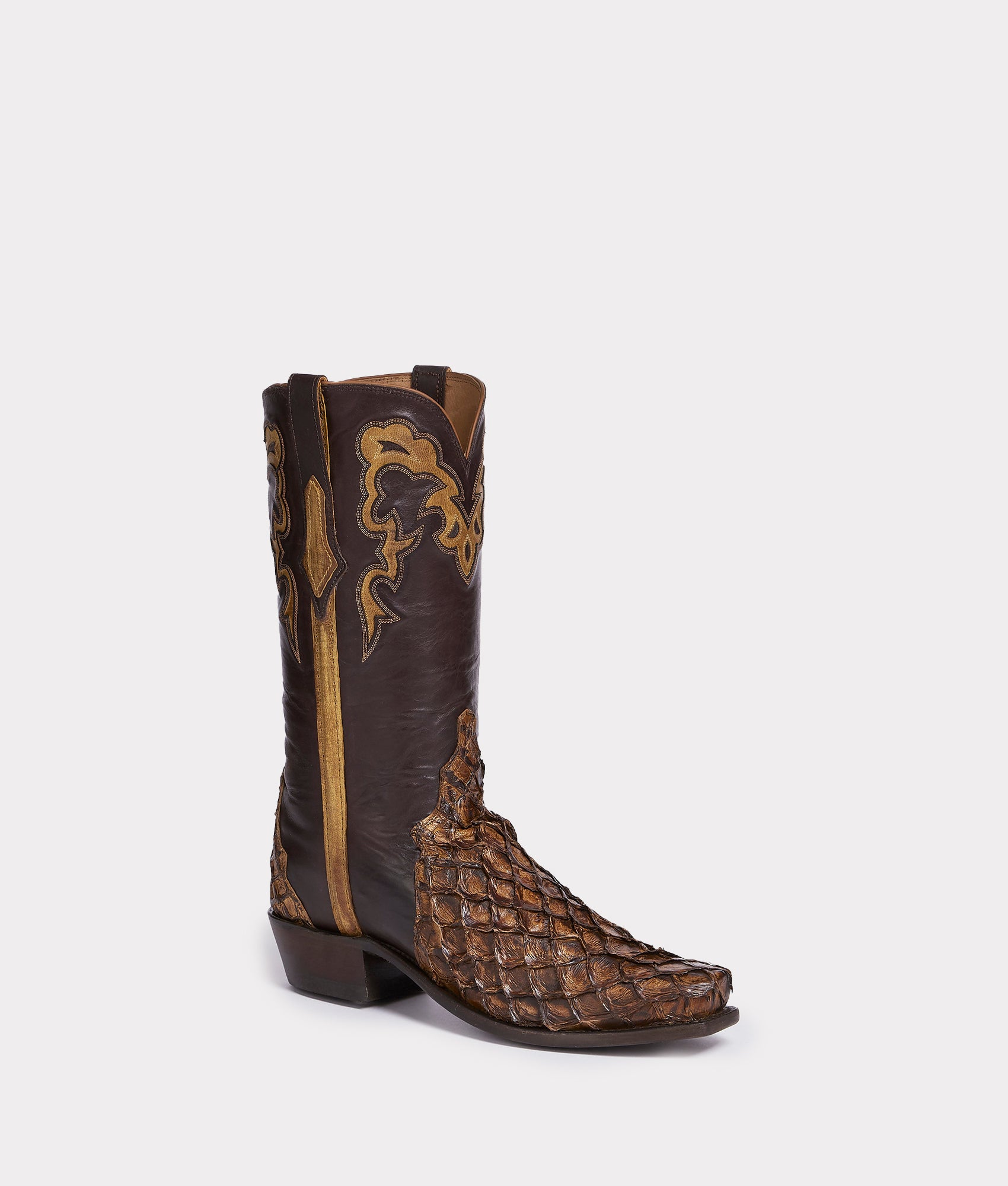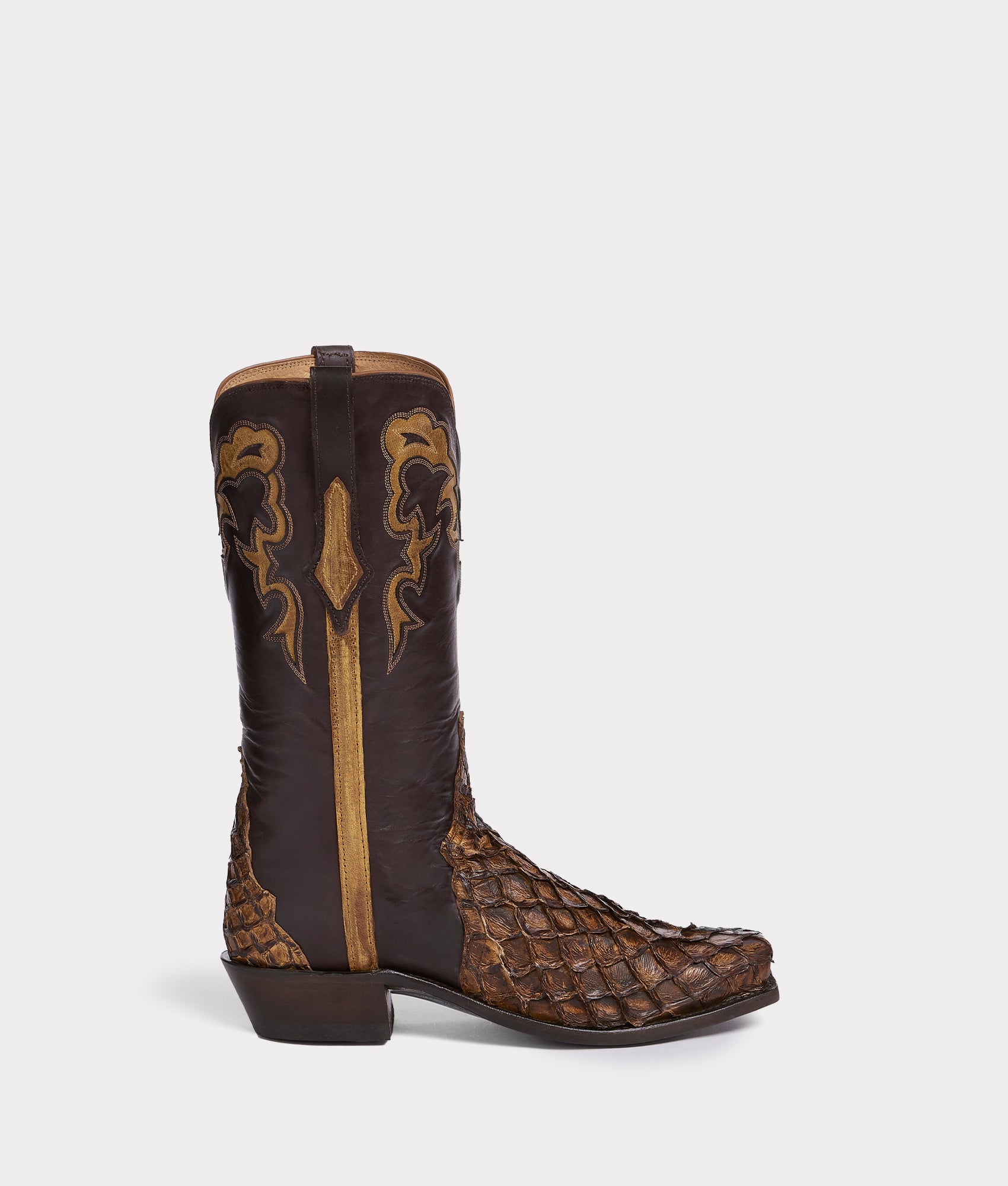 New-World style meets Old-World techniques. Bearing the name and legacy of an early 19th-century homestead pioneered by Lee Clary, the Narcisso pays homage to the American West and the Texas cowboy. Handcrafted from Mini Pirarucu fish skin and Ranch Hand leather, Narcisso is saturated by Texas Panhandle hues - coming in three natural colorways. From clean lines to smooth edges, the vintage Matador silhouette is rendered to perfection. Family values and traditional cowboy principles are rooted in Narcisso's core. Handmade in Texas.