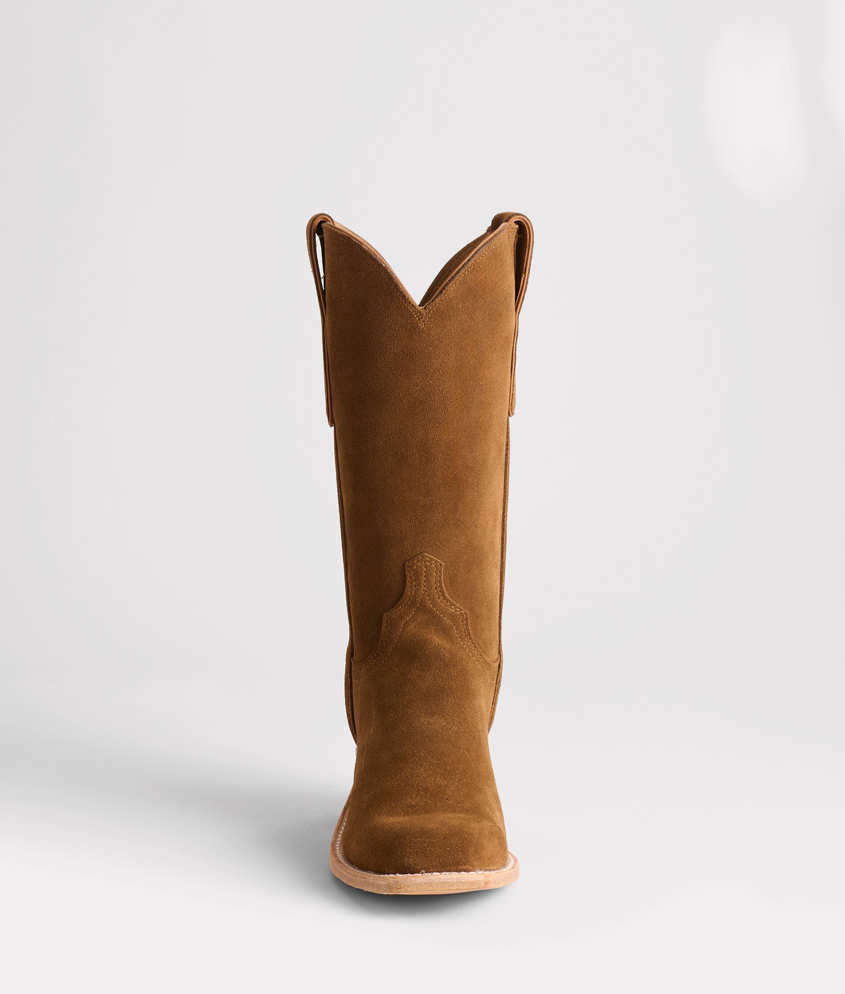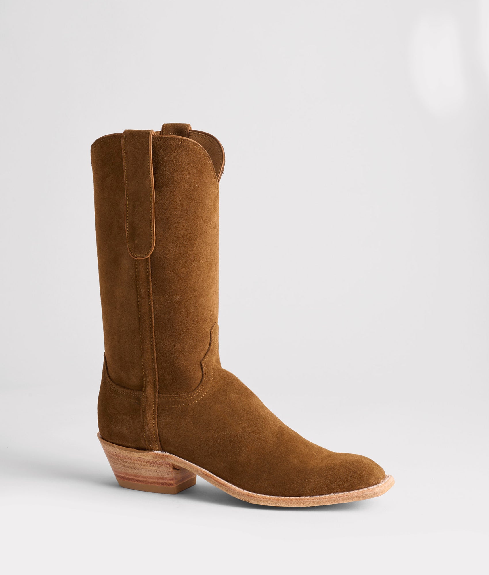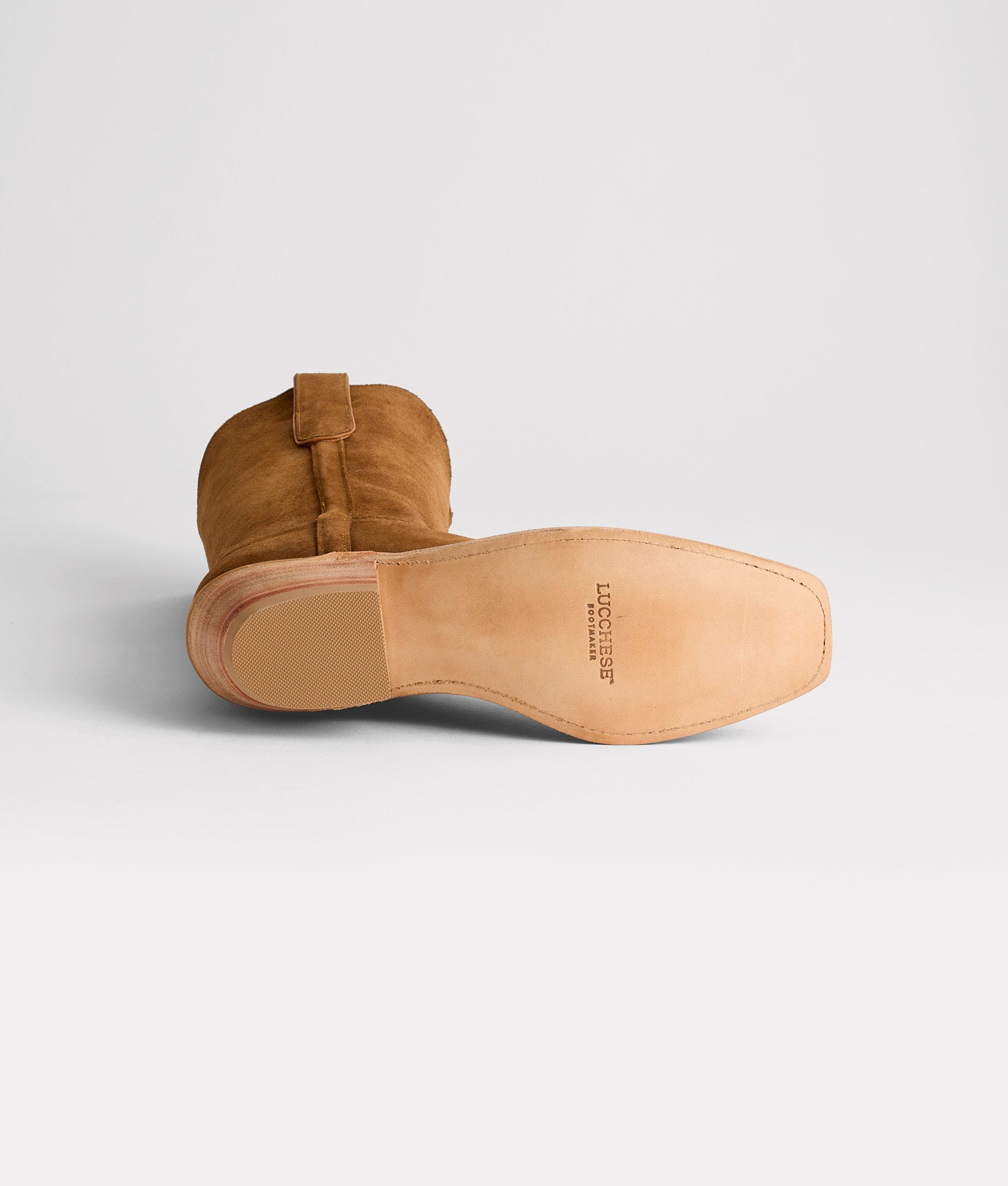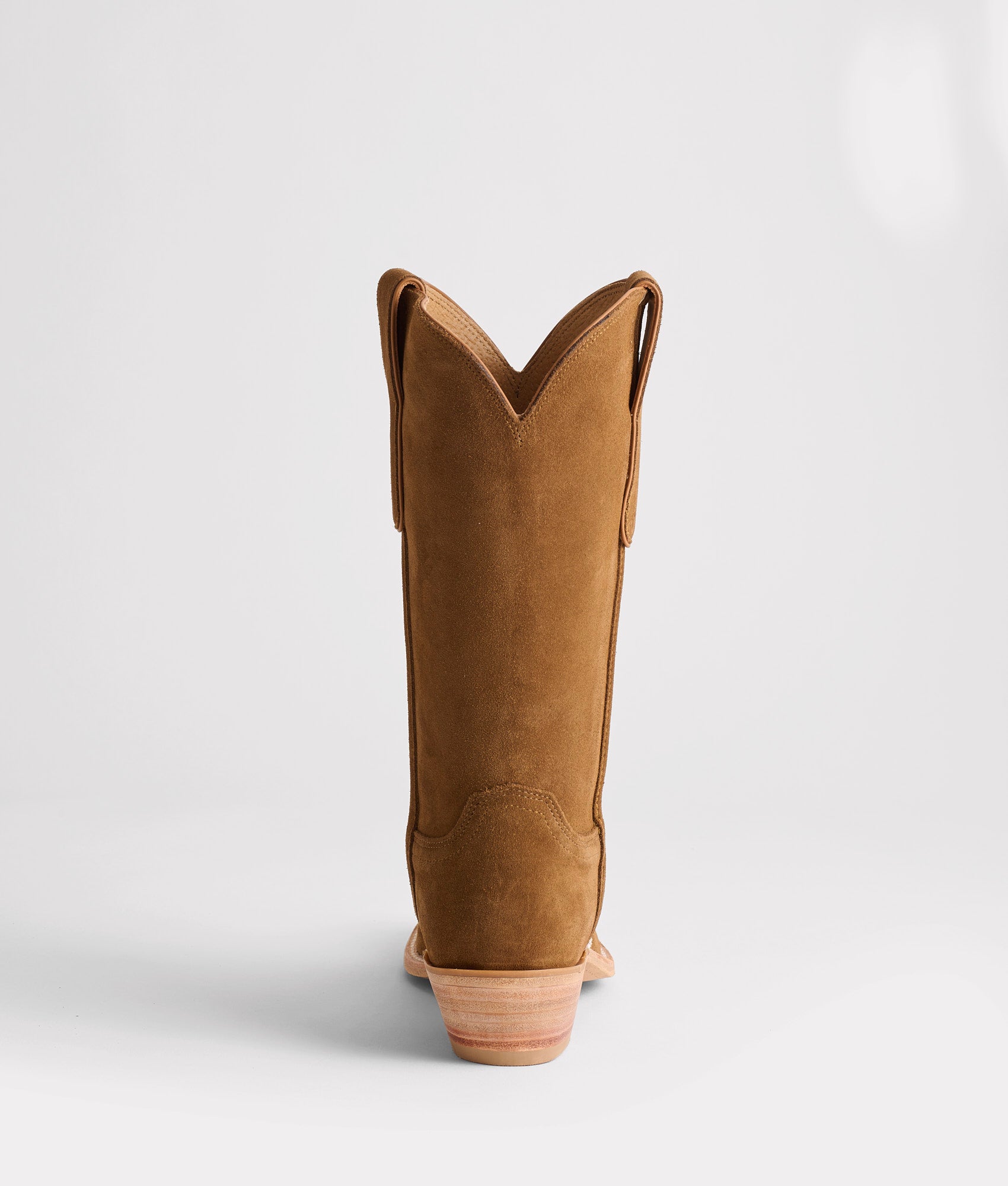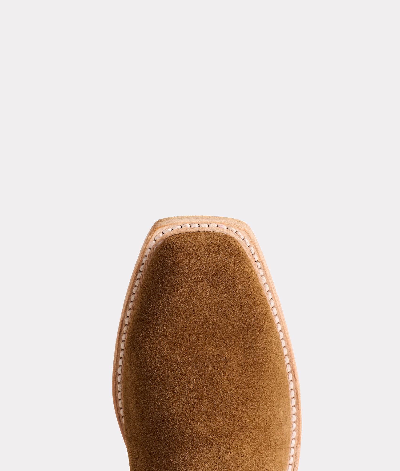 Part of the Chris Stapleton collection, the Old Friend pays homage to Chris' heroes. Rugged in nature and vintage in design, the Old Friend is a piece of the "songwriters’ uniform". This Western silhouette bridges the gap between grit and traditionalism with silky Italian suede and classic Mule Ear pull straps - a Torero side seam lends visual texture to a timeless boot. Handmade in Texas.
