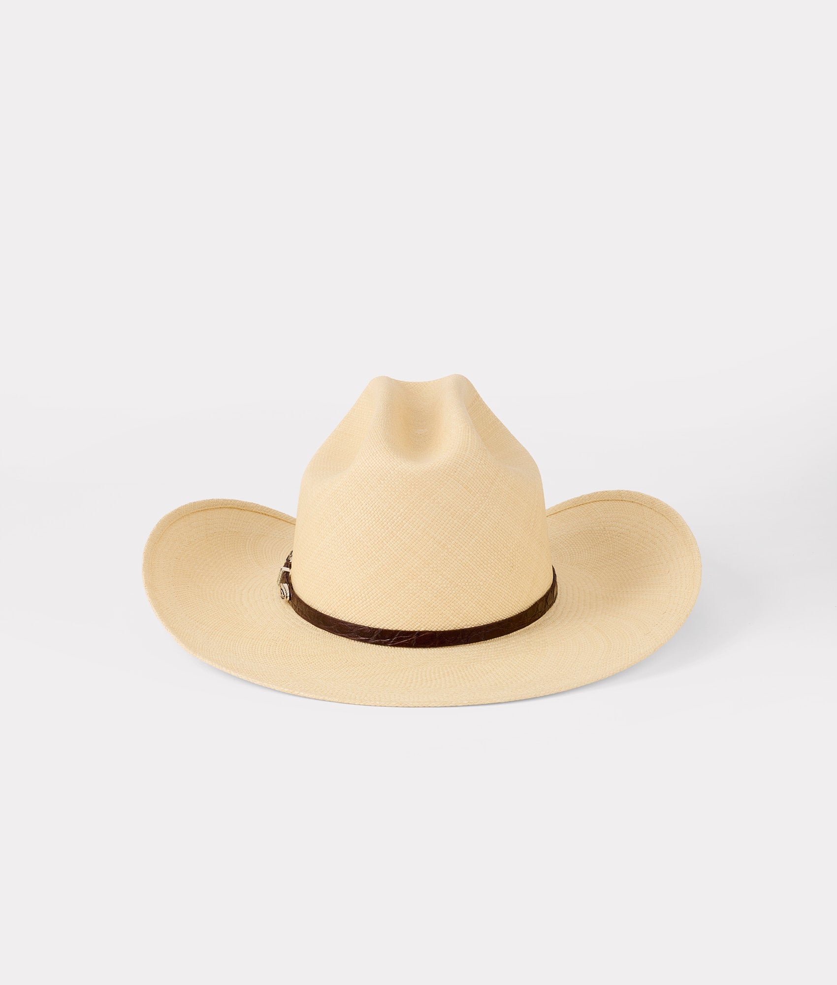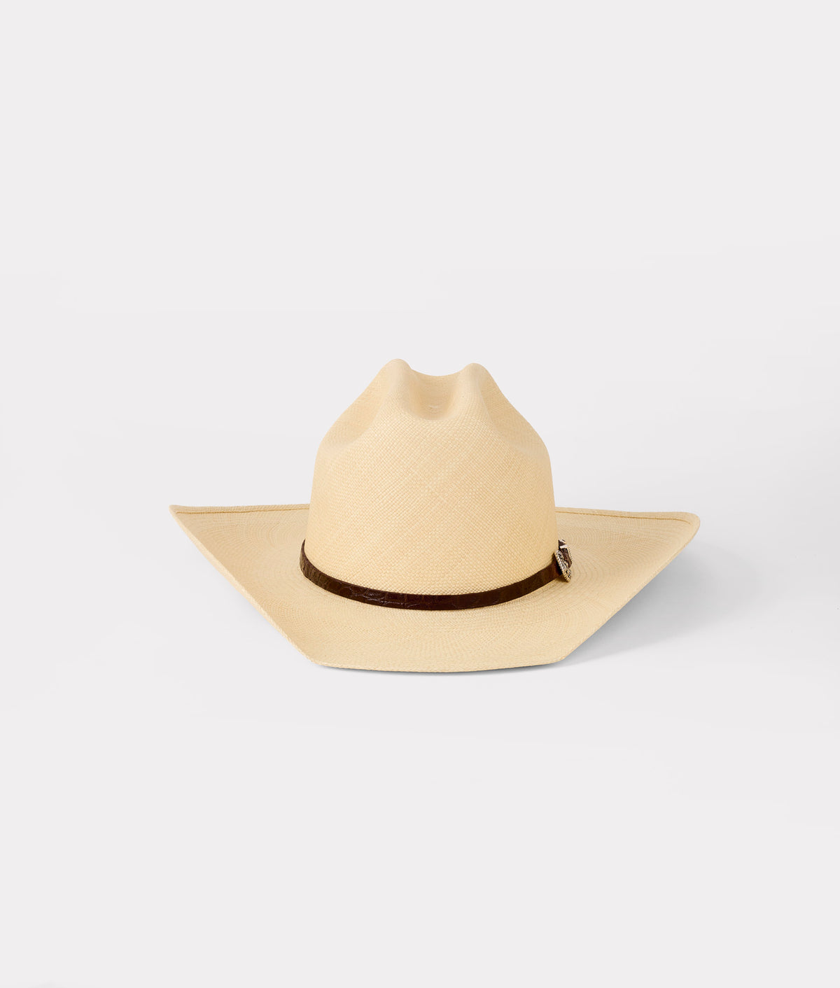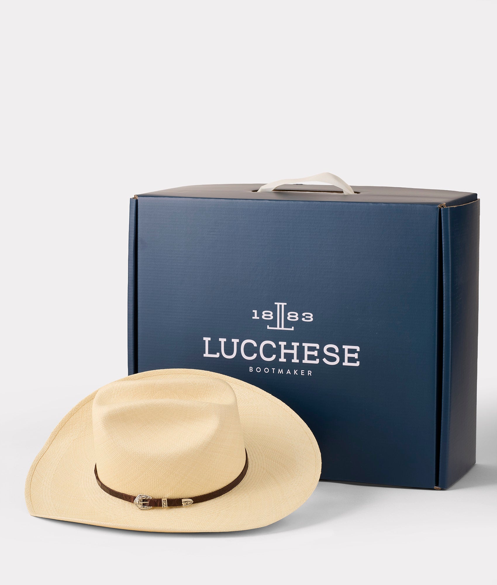 Named after the historic Texas Nueces River, this hat embodies the artistry of traditional craftsmanship. Made from 100% handwoven Toquilla straw, its distinct, natural pigment reflects the rich texture and subtle variations of the material itself, while the ultra-fine grade weave highlights the skill and precision of the artisan who created it. The weave not only serves as a testament to the hat’s durability but also allows for breathability, ensuring comfort under the sun. The hat features a classic cattleman crown and a wide western flange brim. The Alligator hat band adds a signature Lucchese element to a fresh piece. Its finishing touch—a 3-piece silver buckle set adorned with two real diamonds—elevates the hat to a work of art.