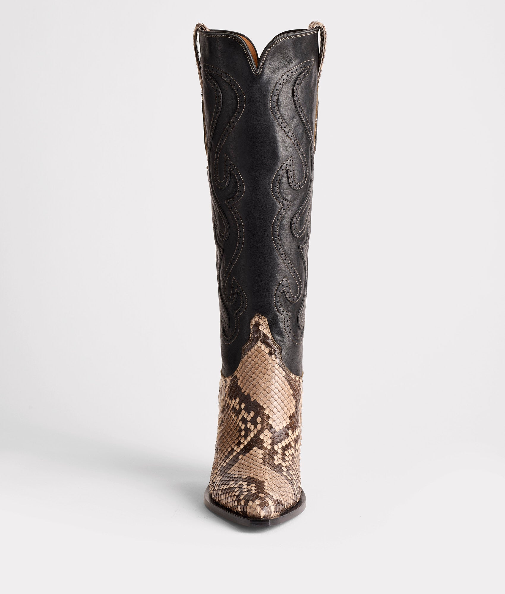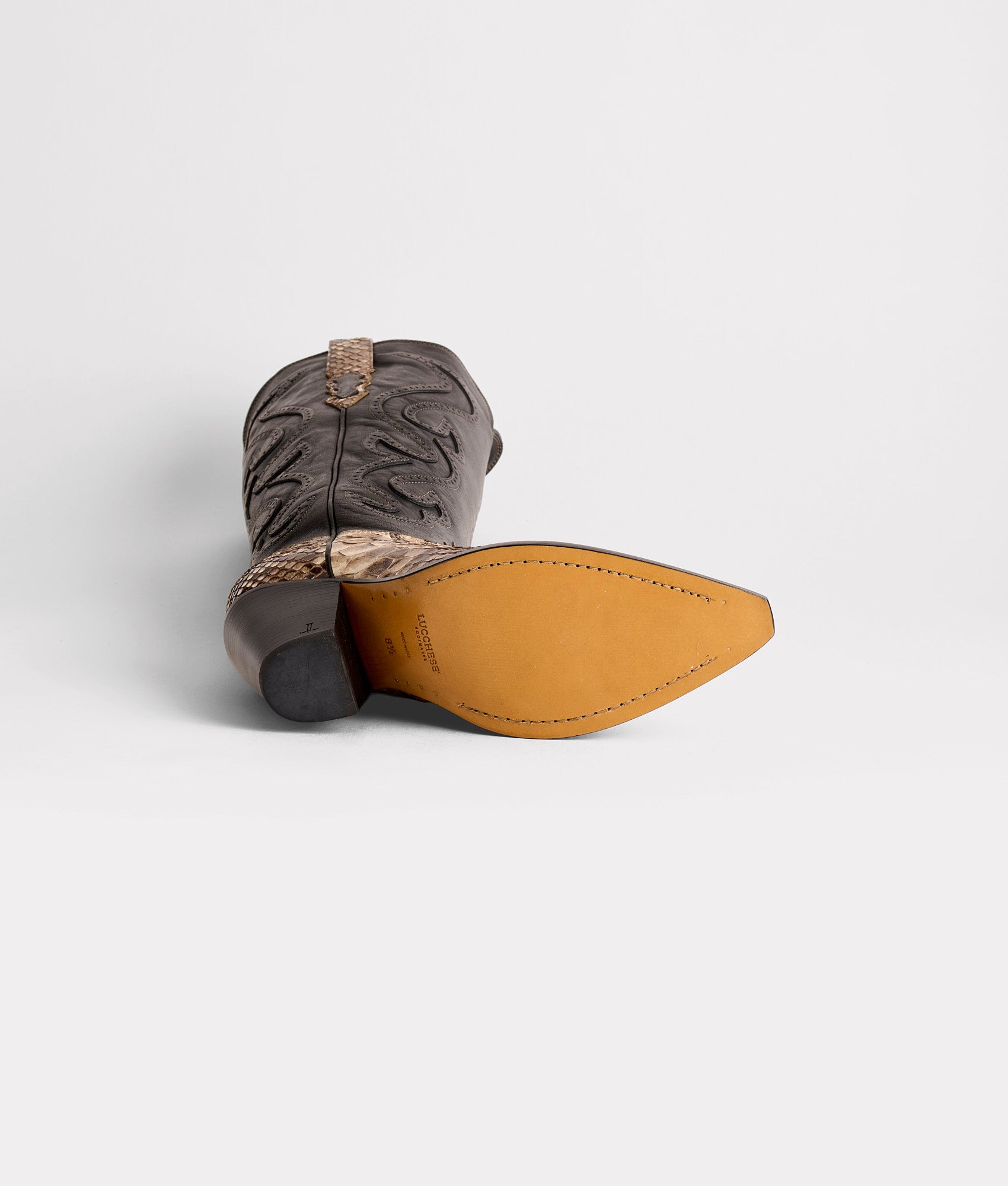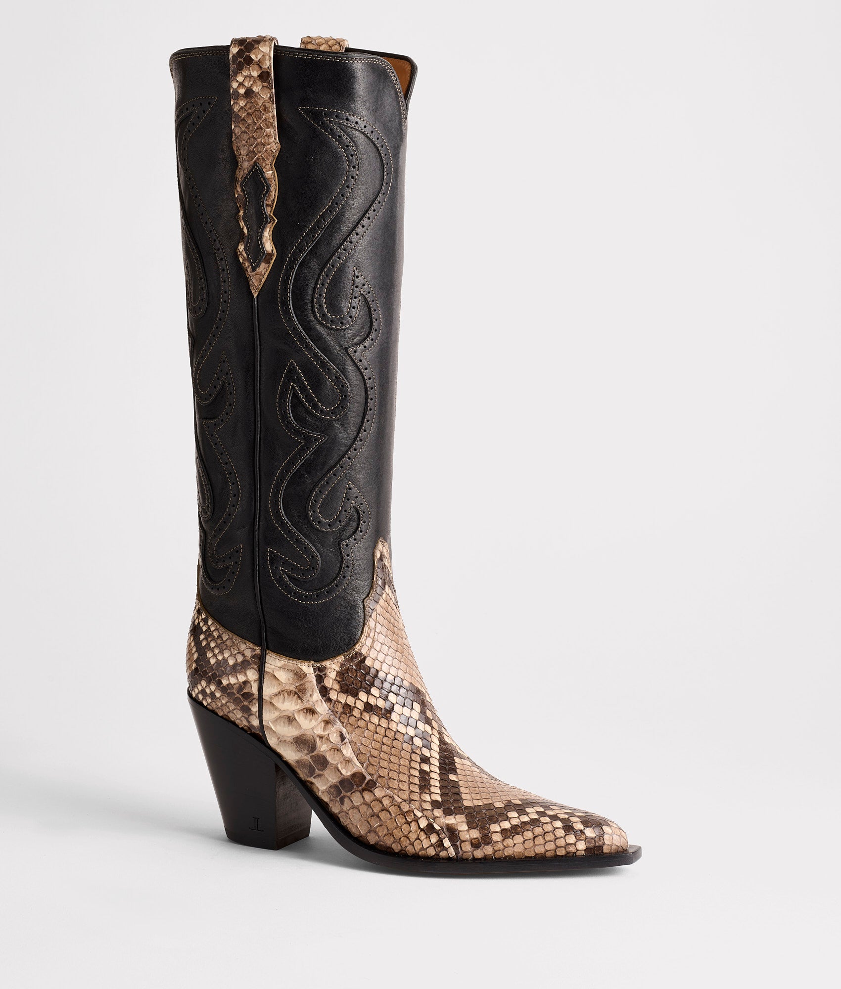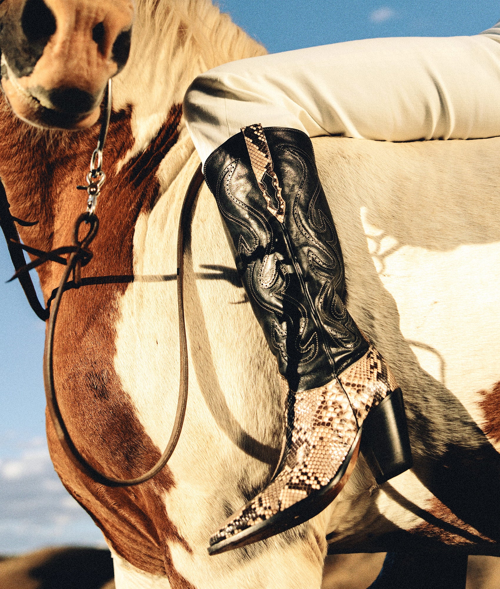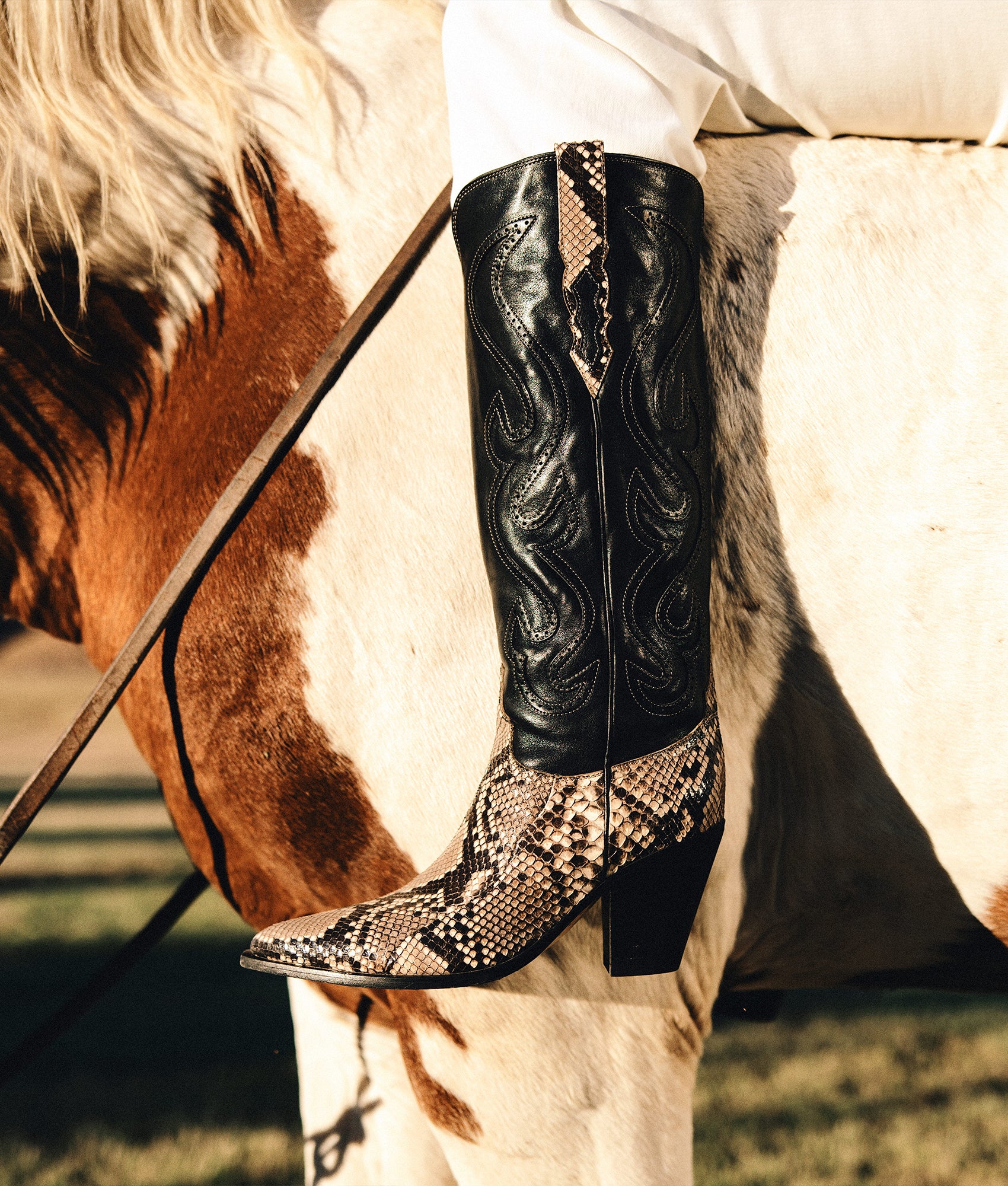 Named for the Italian word meaning ‘victory,’ the Vittoria stands as a testament to the dialogue between European artisanship and the culture of the American West. Rendered in two colorways and crafted from the world’s finest materials, Vittoria appears in rich espresso Italian suede with inlay work reminiscent of Renaissance detailing, or in vogue black calfskin tops paired with muralled python vamps. She carries a bold presence, not only through her 90 millimeter fashion heel, celebrated in the world of shoemaking, and her 15” quarter, but in every hand-finished detail. Handmade in Italy.