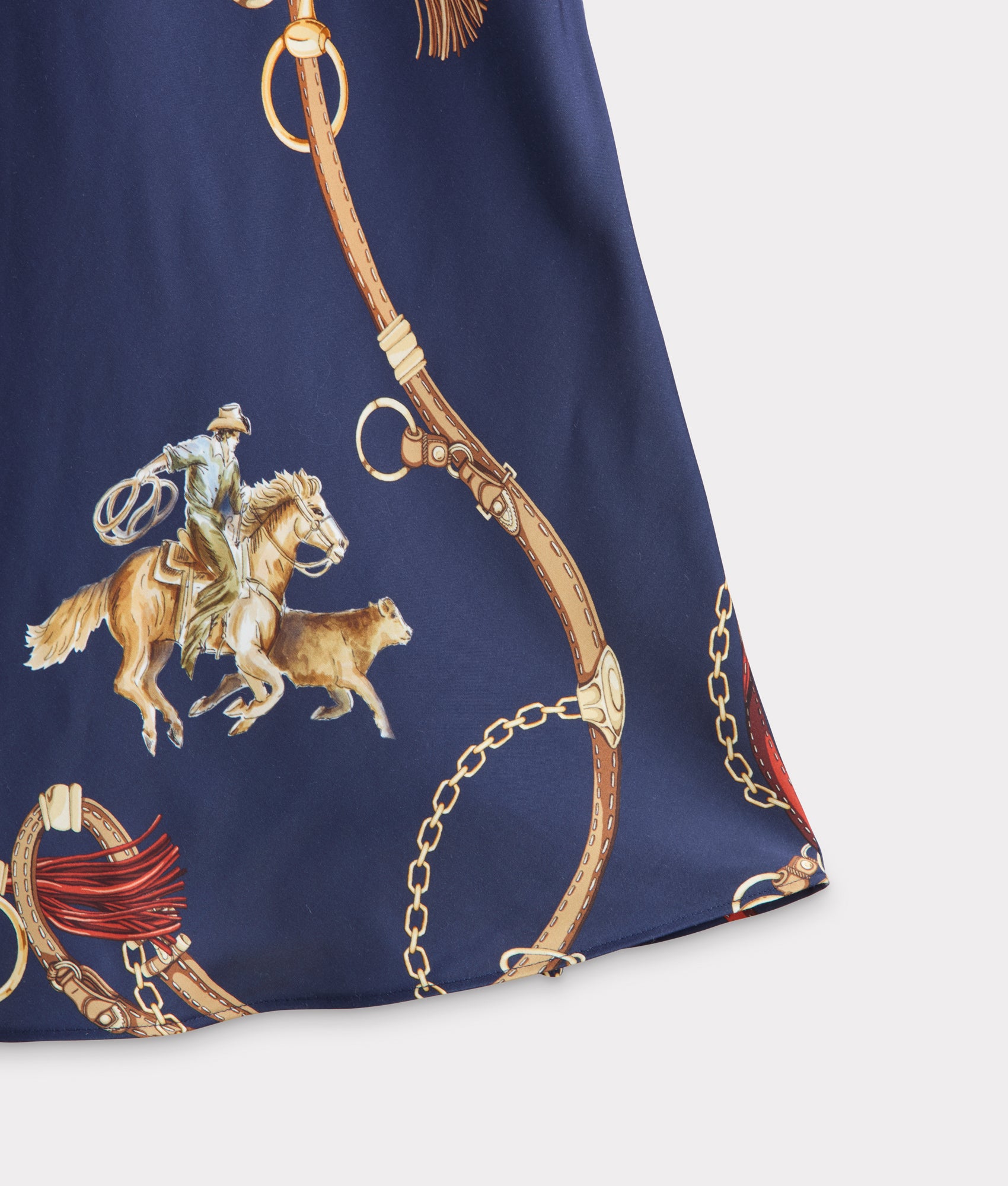 The Caroline Skirt showcases a distinctive Western-inspired design with a vibrant print featuring bucking horses, tassels, and lassos. The pattern is rendered in natural tones, blending earthy browns, soft beiges, tans, and blues to create a visually striking yet versatile piece. The Caroline Skirt offers an adventurous spirit to any repertoire.