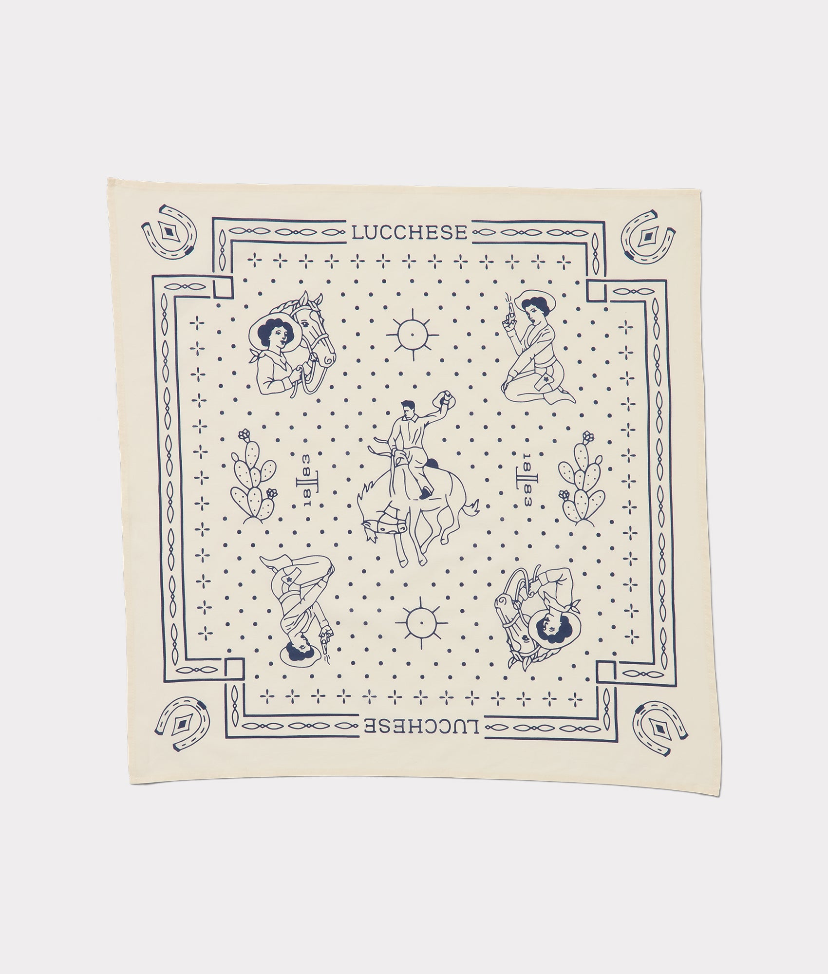 Made in the USA and perfect to make your own protective facemask, our Lucchese bandanas feature a retro western motif, complete with a bucking cowboy and cowgirl, cactus, and horseshoes. 100% cotton. Dimensions: 21.5" x 21.5"