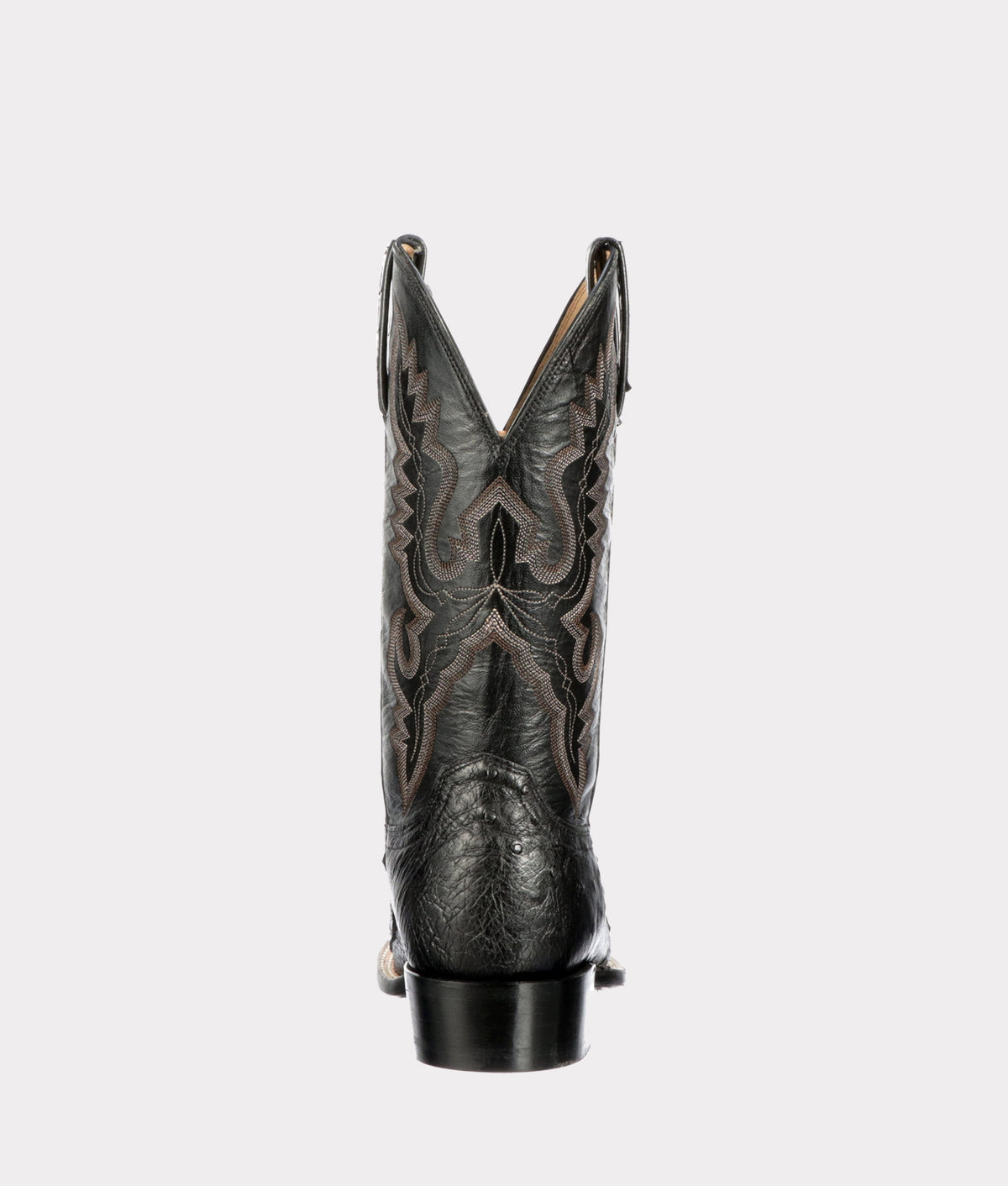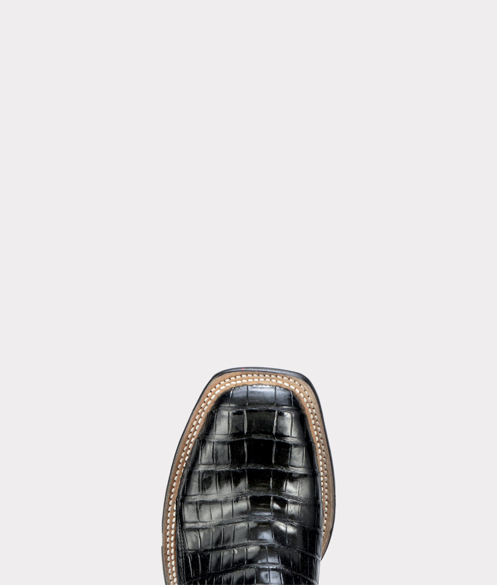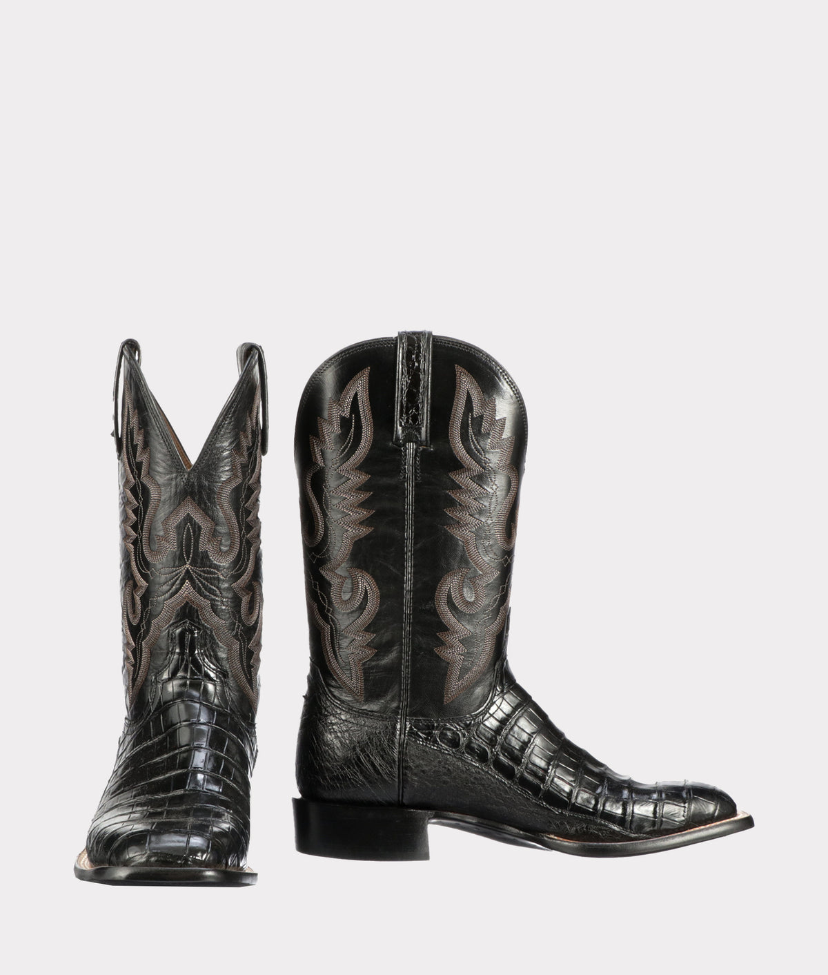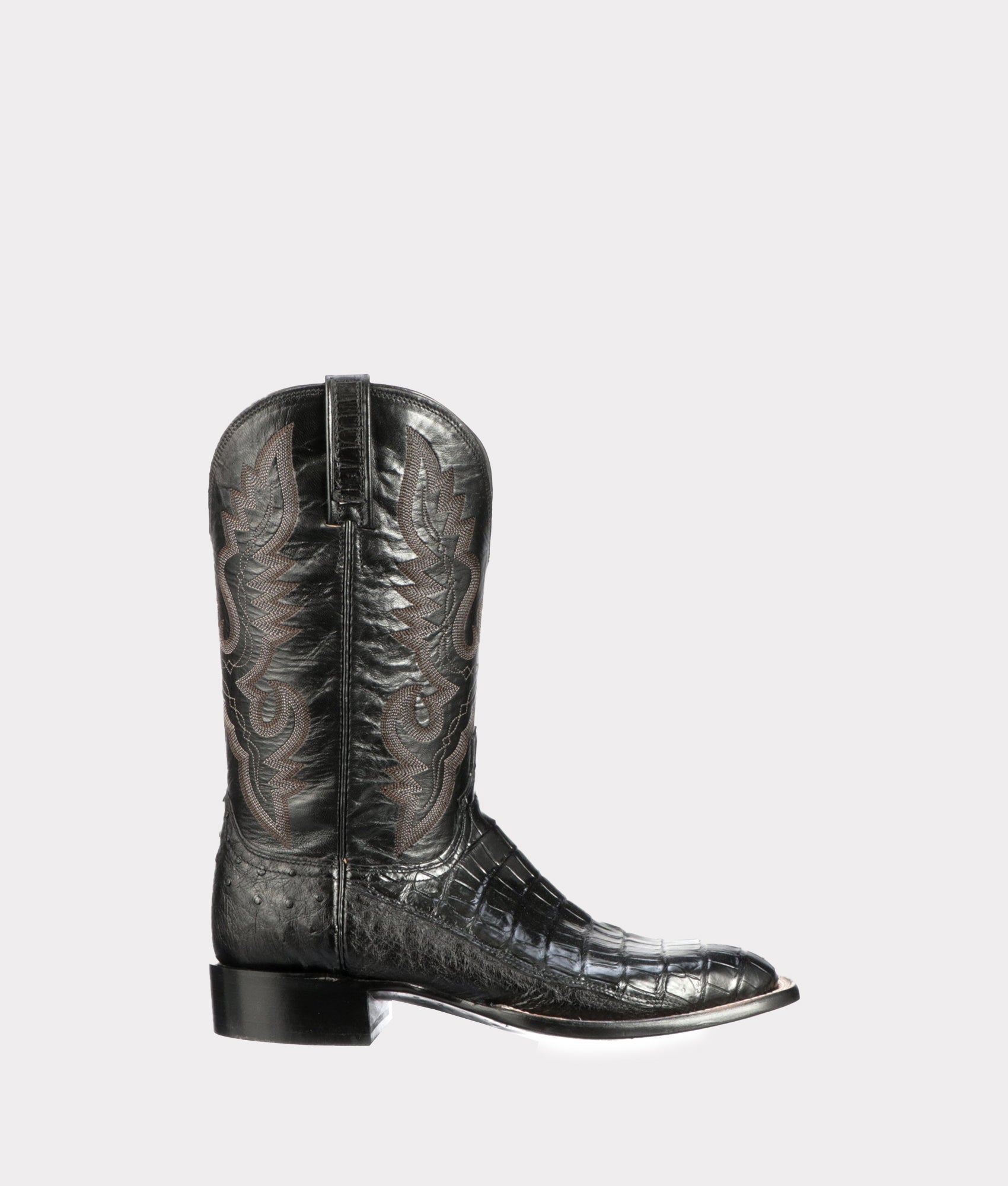 We craft boots from several cuts of this crocodilian: belly, ultra belly, and hornback. Ultra belly is ultra smooth; belly is only slightly less so. Abrasion-resistant hornback is heavily textured, with deep, tall ridges. The most recent caiman in the Lucchese family, giant caiman has larger tiles than the other varieties. All these crocodilians hold firm around the foot, even after repeated wear.