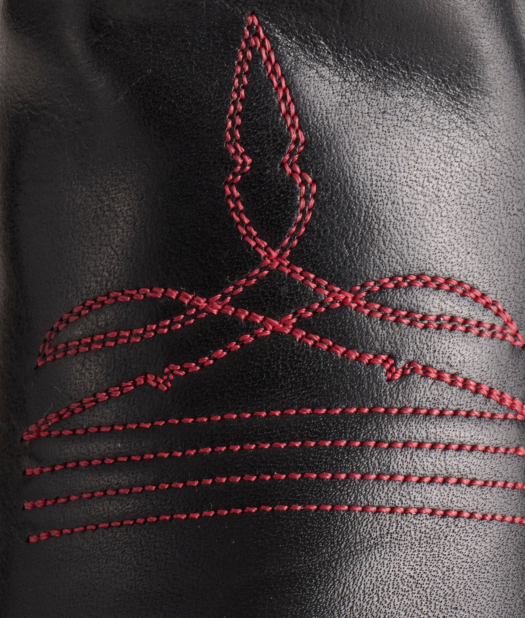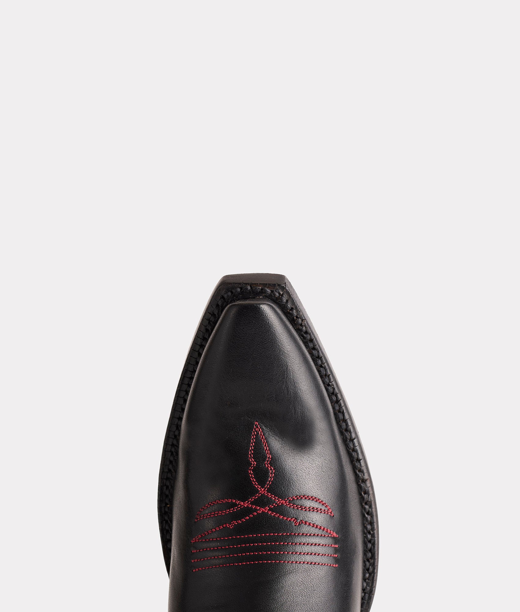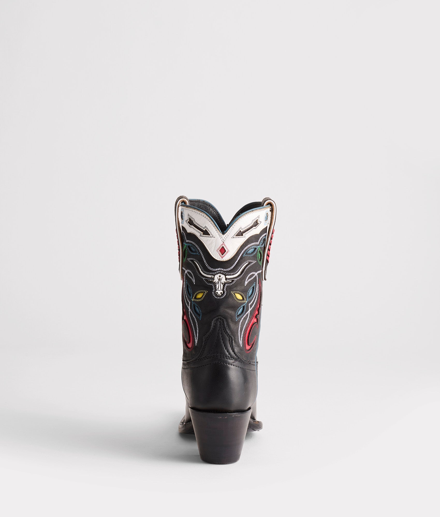 Don’t let her 9-inch quarters fool you—she may be short up top, but she stands tall with a 2-inch Fashion heel down low. Not Your Darlin’ is a spitfire, brimming with grit and crafted by the skilled hands of our artisans. She’s designed in bold tones and carries a hidden vibrancy, with reds, blues, and greens woven into the quarters. The May inlay on the upper and collar boasts a longhorn crest, an abstract interpretation of a spur and flowers, suits of cards, and a flying arrow—each motif striking a chord between hell-raising edge and high-brow sophistication. The vamps are dialed in to match the energy of the quarters. Available in two colorways of Bovine leather and one in exotic Caiman leather, each pair turns heads—she’s not for the faint of heart. Handmade in Texas.