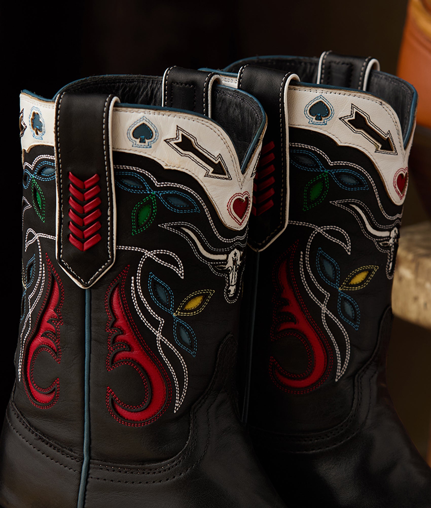 Don’t let her 9-inch quarters fool you—she may be short up top, but she stands tall with a 2-inch Fashion heel down low. Not Your Darlin’ is a spitfire, brimming with grit and crafted by the skilled hands of our artisans. She’s designed in bold tones and carries a hidden vibrancy, with reds, blues, and greens woven into the quarters. The May inlay on the upper and collar boasts a longhorn crest, an abstract interpretation of a spur and flowers, suits of cards, and a flying arrow—each motif striking a chord between hell-raising edge and high-brow sophistication. The vamps are dialed in to match the energy of the quarters. Available in two colorways of Bovine leather and one in exotic Caiman leather, each pair turns heads—she’s not for the faint of heart. Handmade in Texas.