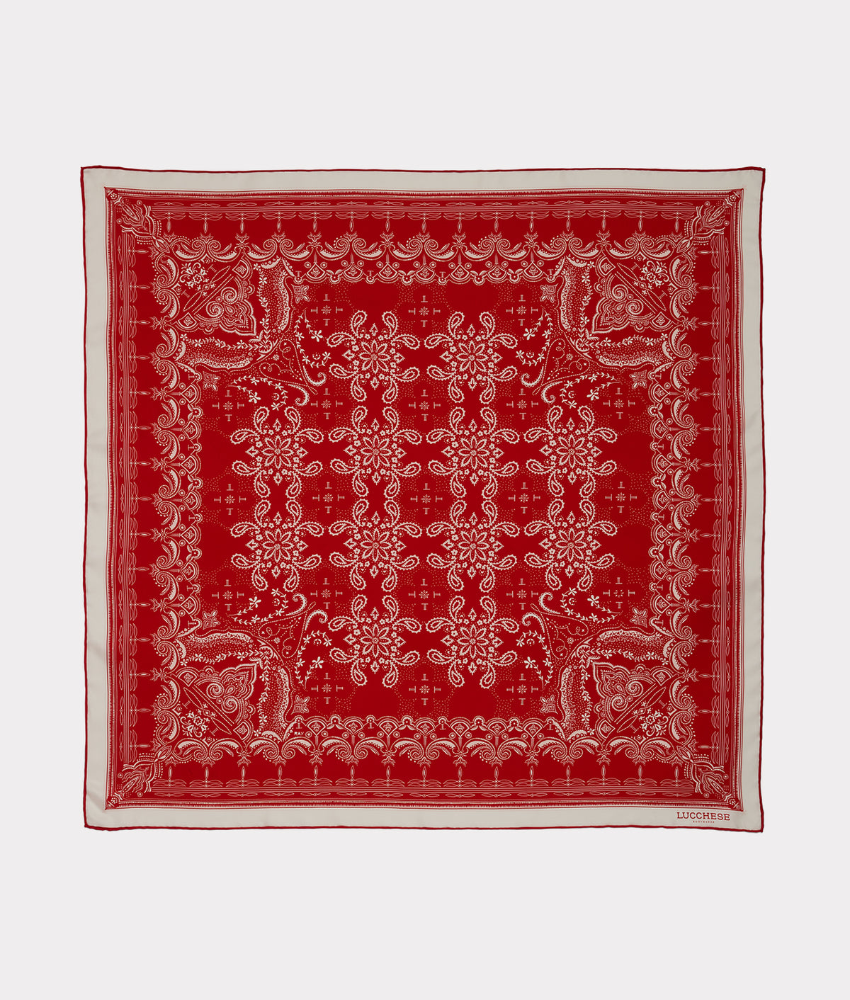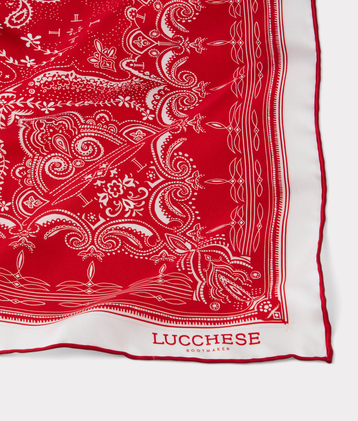Based on our iconic Mirrored-L logo, this piece showcases subtle nods of Lucchese. Adorned with intricate, hand-drawn patterns inspired by classic western motifs, each design is a work of art, reflecting the spirit and heritage of the American West. The rich colors are carefully chosen to complement any outfit, adding a touch of opulence and style whether worn around the neck, as a headscarf, or tied to a handbag
