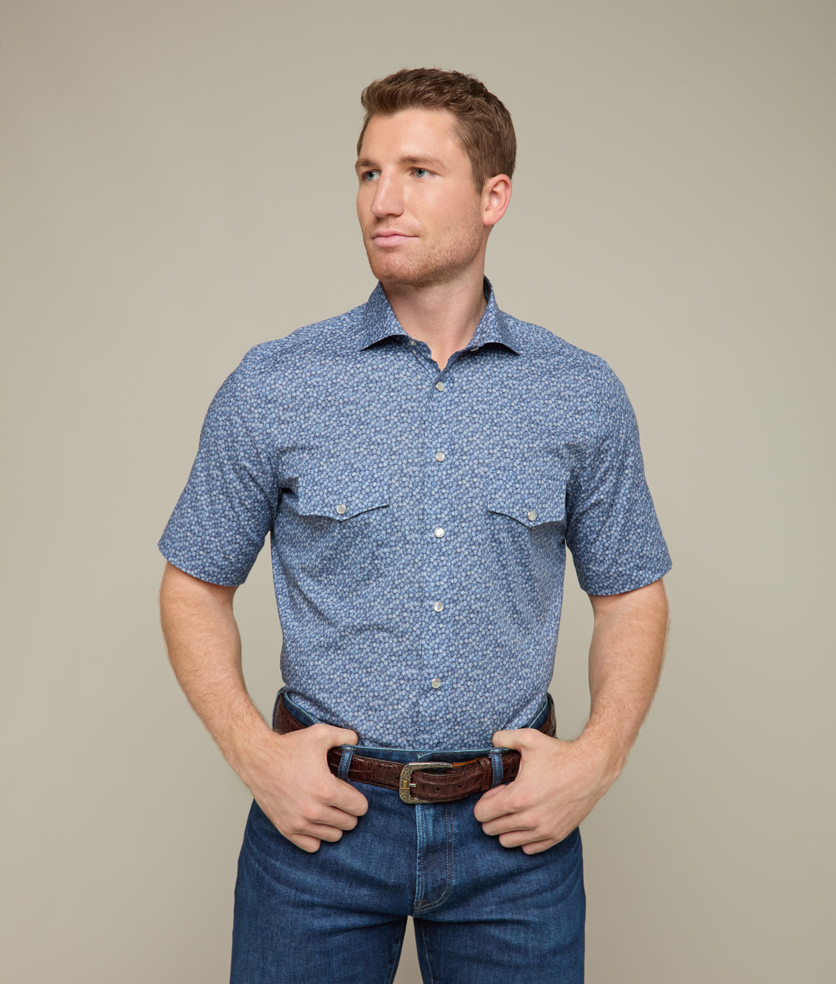 Named after the Texas city where our state capital stands, the Austin is a rugged, cotton Western shirt with snaps that features a cowboy yoke in front and back with a subtle, embroidered mirrored-L emblem on the left pocket and lower placket. Classic cowboy fit.