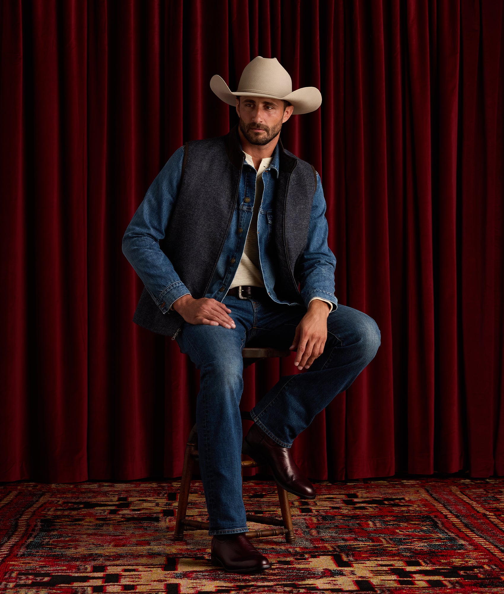 Earl is a classic Trucker Jacket with a few twists. A cross-grain front and back yoke boasts the character of the ring spun 100% Cotton fabric. Deep interior and exterior pockets pockets offer extra space for personal items. Earl is first stonewashed to a Saddleback Blue (dark wash), then highlighted at the front and back yoke, elbows, arm honeycomb, cuffs, and collar. The extended wash lends the high points to have that “lived-in” vintage aesthetic.
