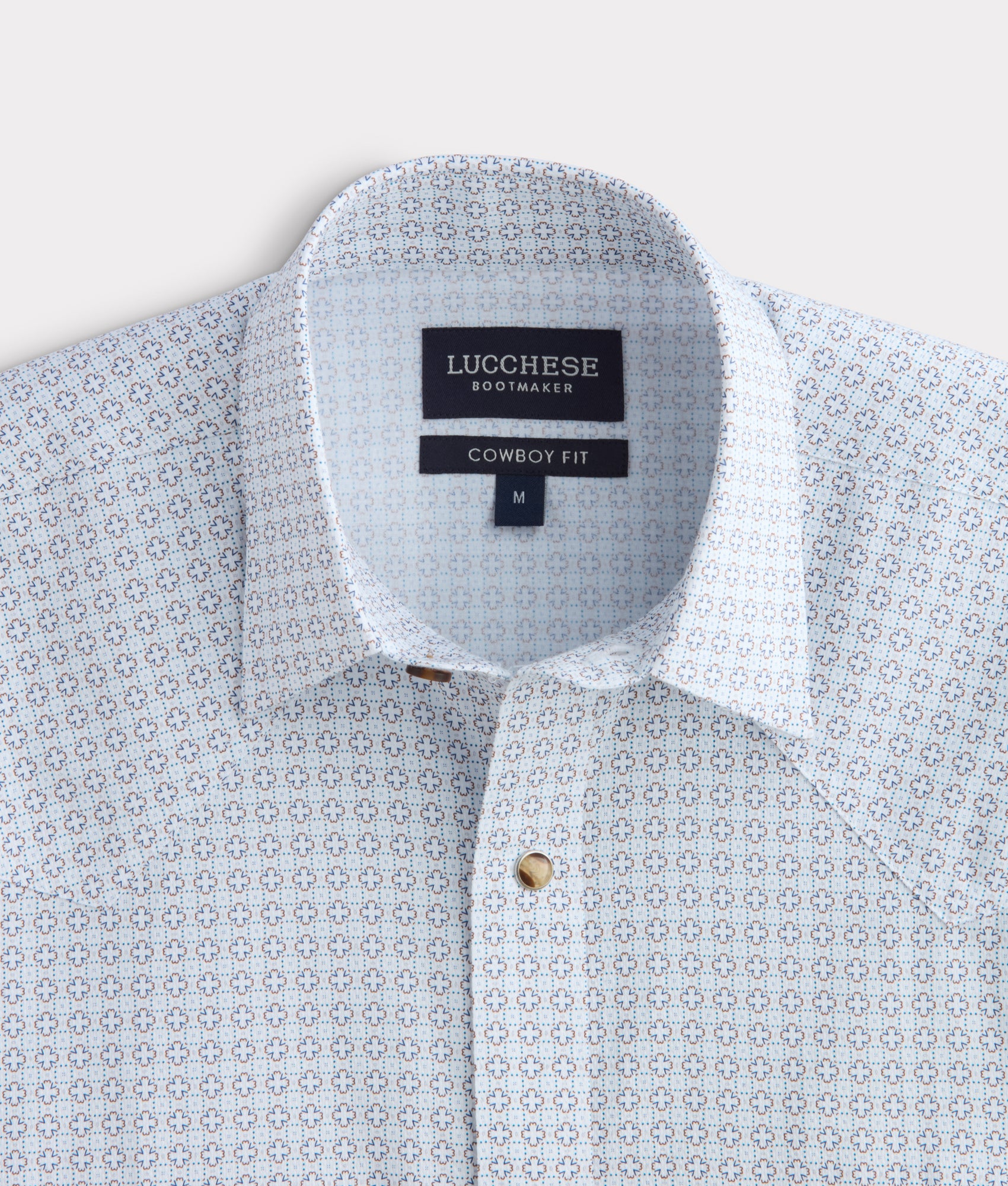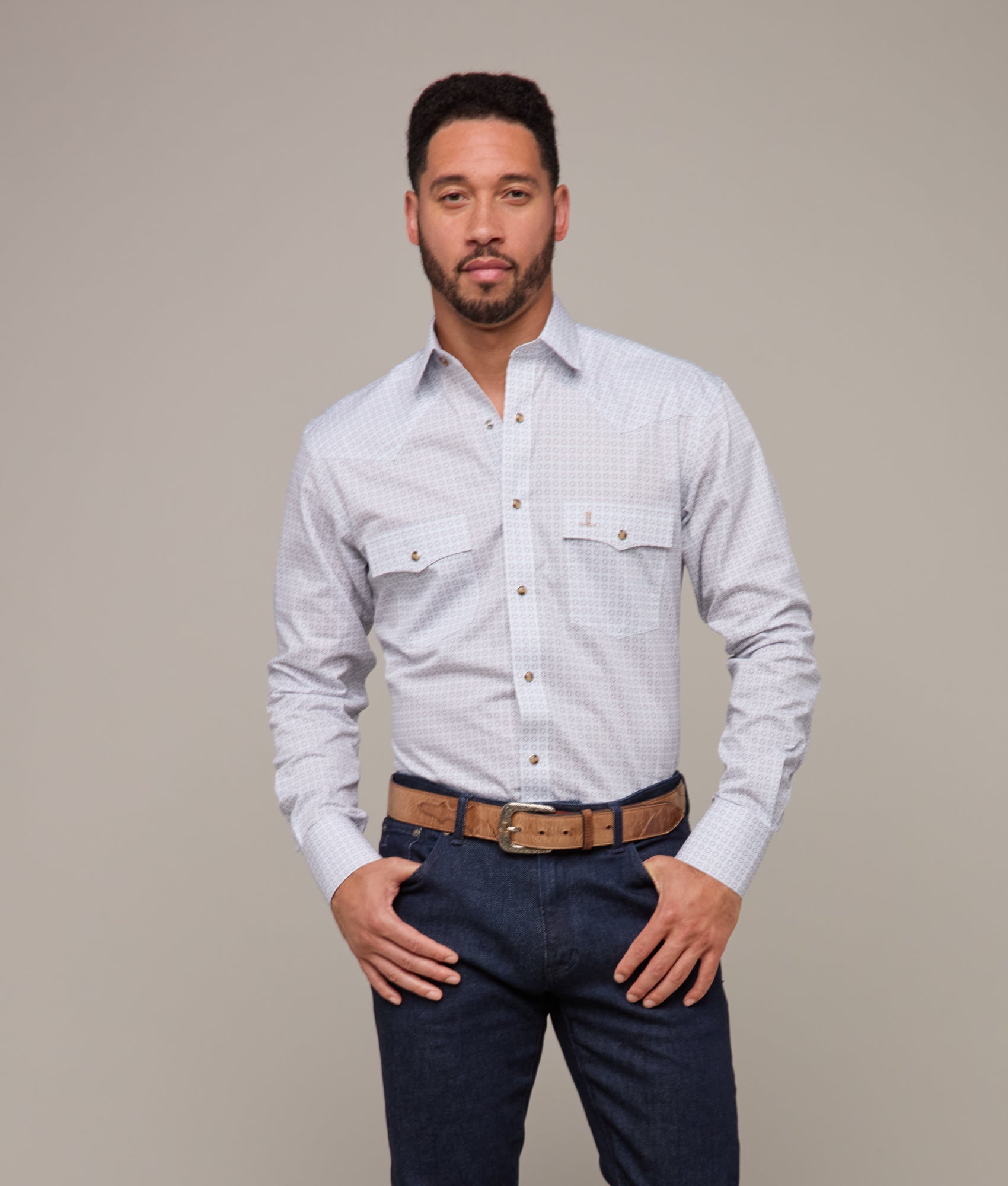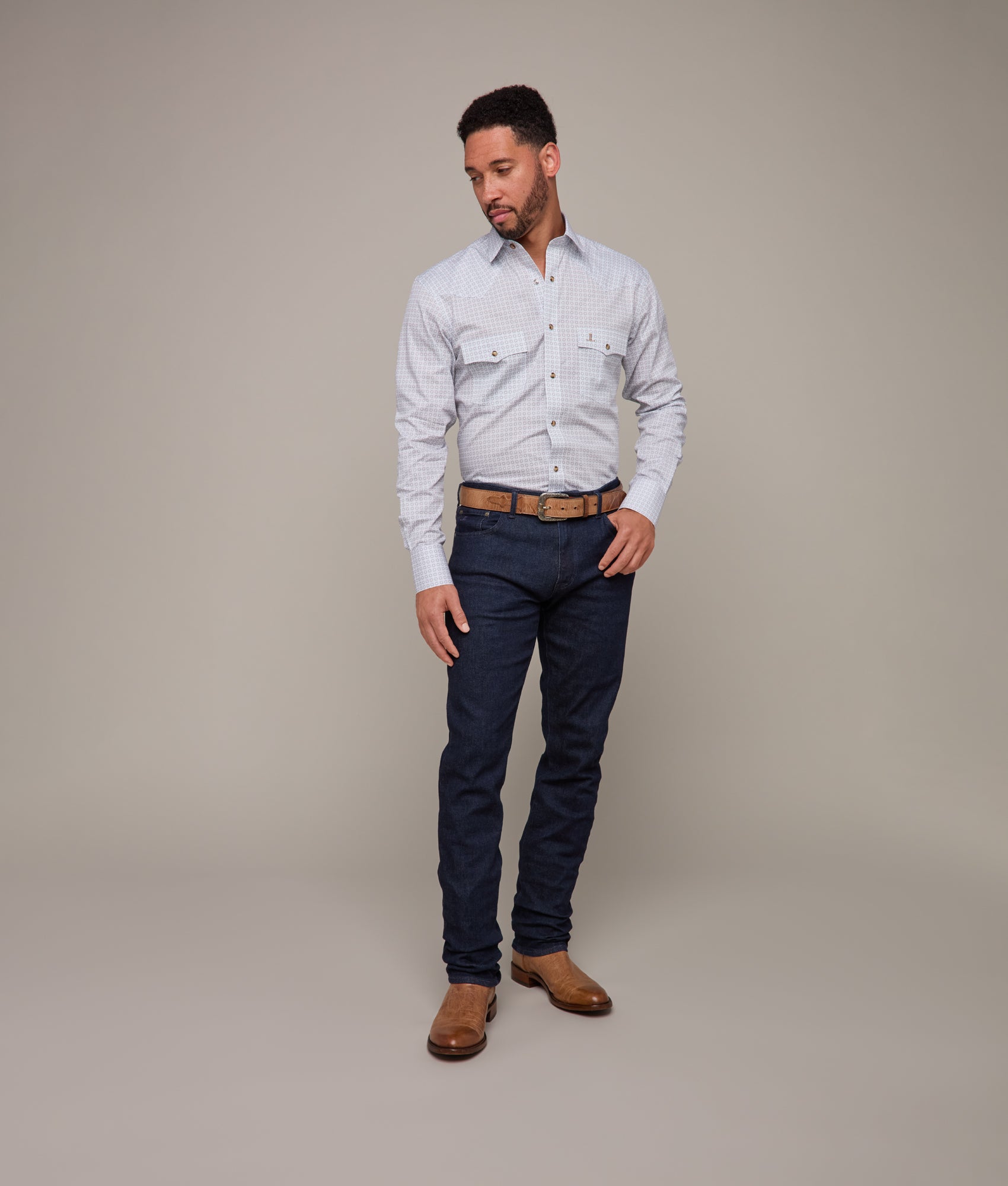 Named for the Texas city where Lucchese’s renowned bootmaking factory resides, the El Paso blends Western utility with refined design. Defined by its snap-front closure, dual chest pockets, and barrel cuffs, it embodies the character of its namesake. The cowboy fit is designed for a traditional Western build. It features a roomy chest, broad shoulders, and a longer torso for confident tucking. Extended sleeve length and a fuller bicep cut allow for ease of motion.