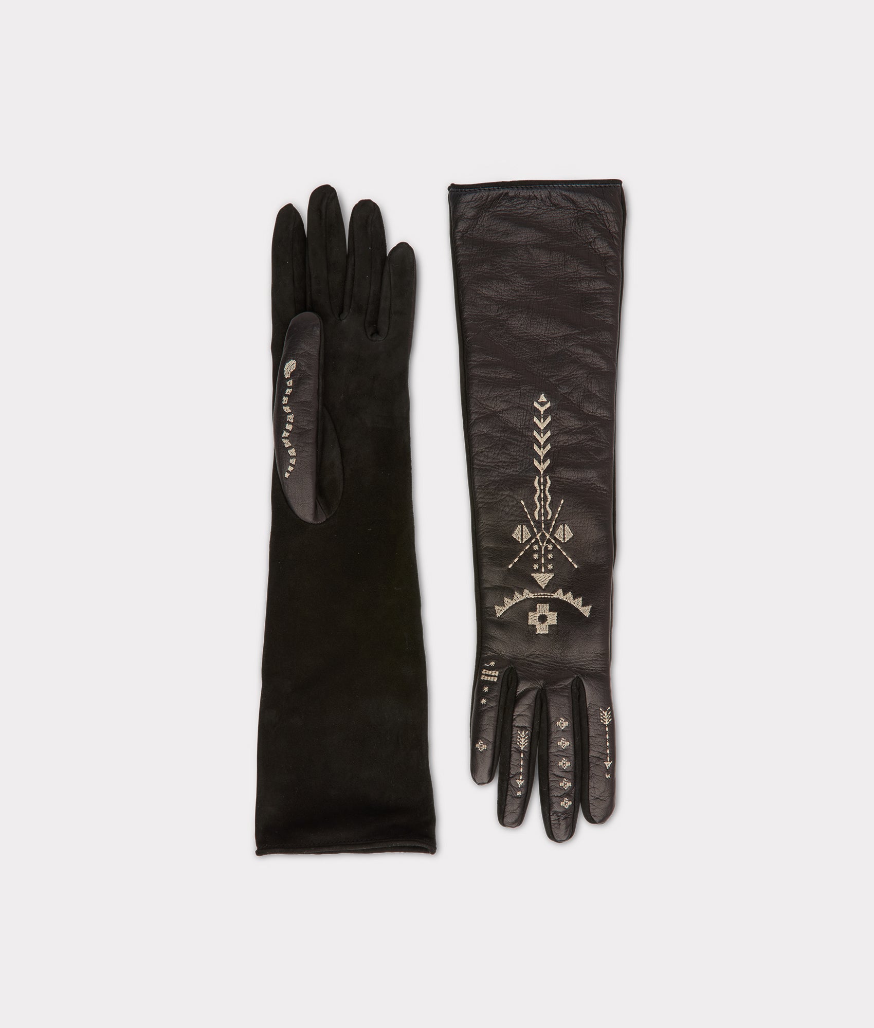 The Fancy Gloves are crafted from luxurious Italian Nappa and Lambskin. These gloves feature intricate petroglyph embroidery, showcasing stunning, ancient-inspired designs that tell a story with every stitch. The soft, supple texture of the nappa leather provides both comfort and durability, making them a perfect accessory for any elegant occasion. Ideal for formal events or a sophisticated everyday look, these gloves are a statement piece that beautifully blends artistry with refinement.