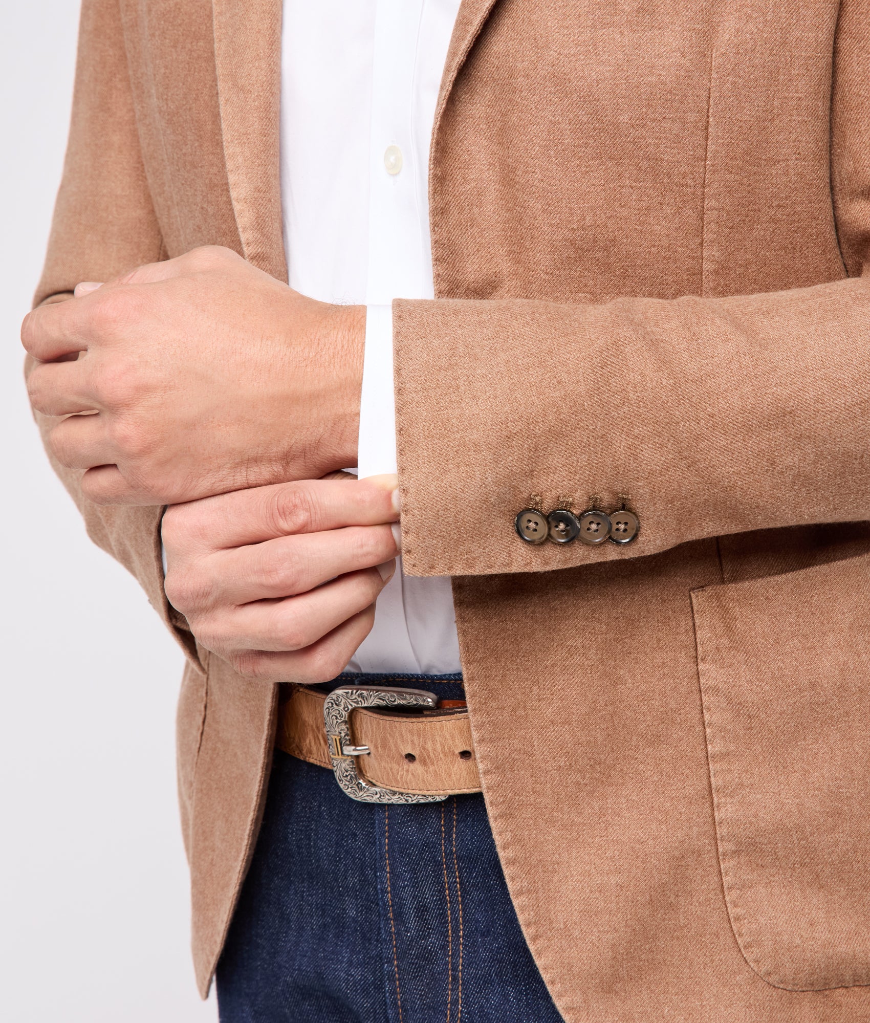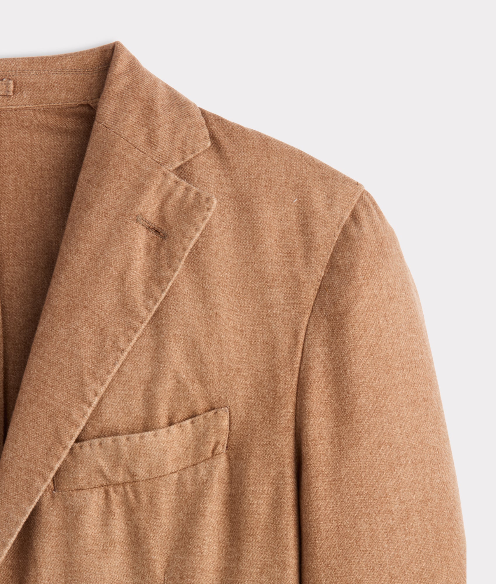 Crafted from a luxurious herringbone fabric of cashmere and silk, the garment reflects both tactile elegance and understated sophistication. It features a modern silhouette characterized by soft shoulders, a two-button closure, and large patch pockets—hallmarks of casual Italian tailoring.