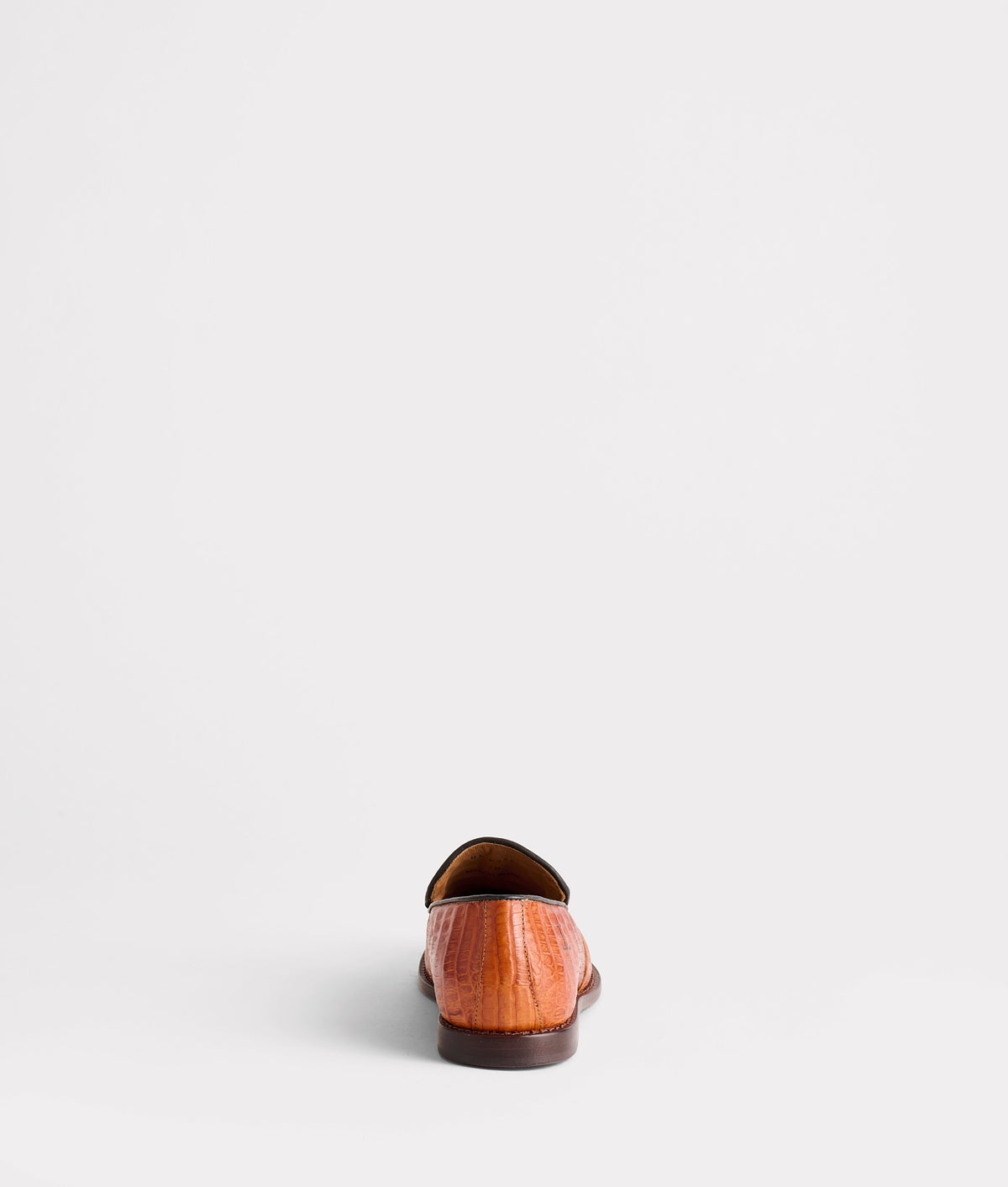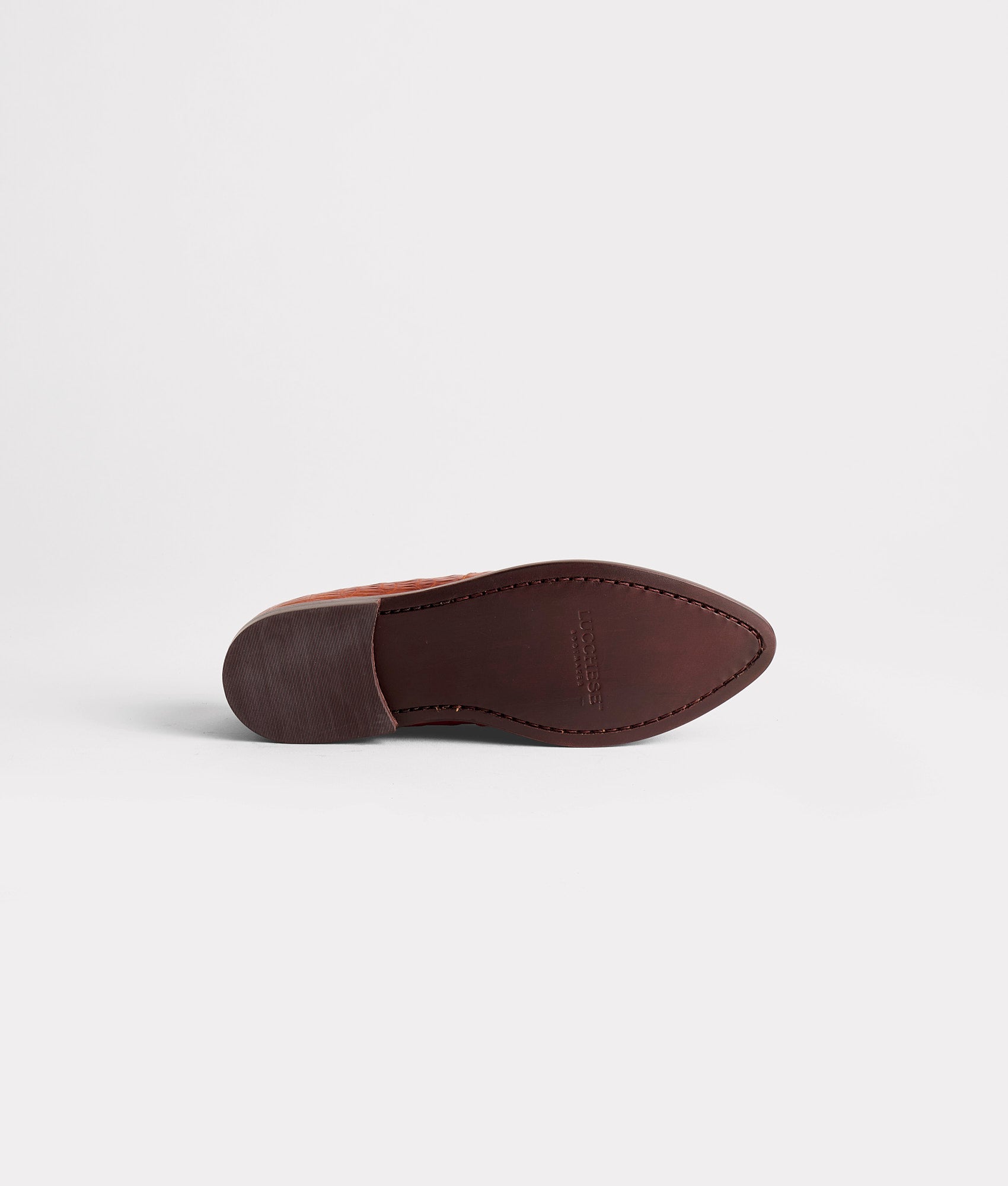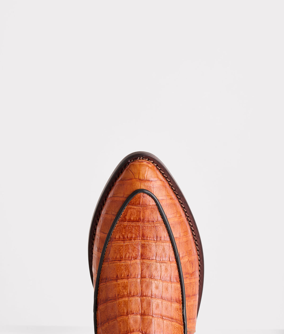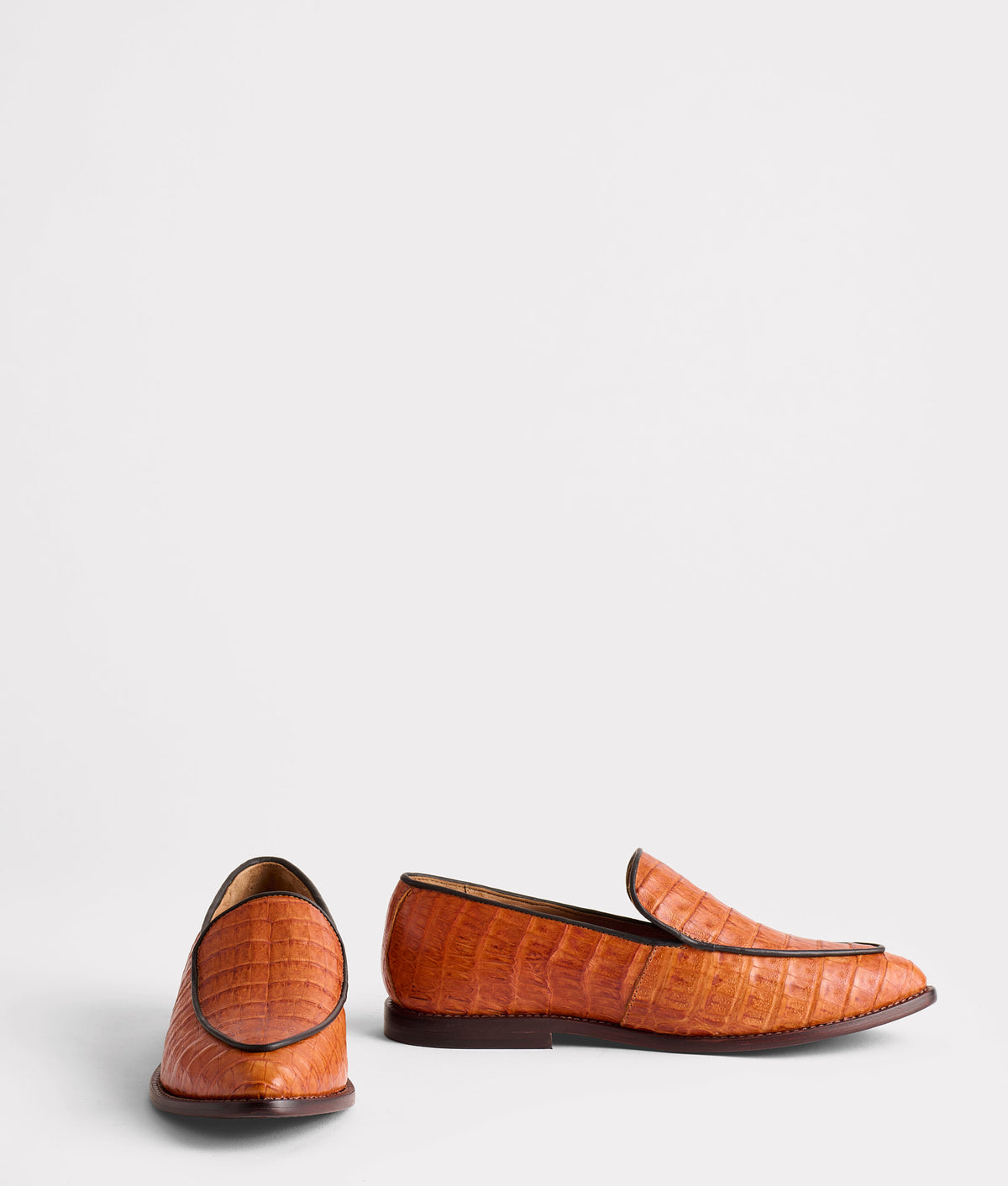 Karmen is a vintage-style loafer handmade from caiman leather. A Western look without the quarters, this shoe offers a seamless transition from saddle to city. Slip into Karmen after a long day in the pasture or before a quick trip to the store.