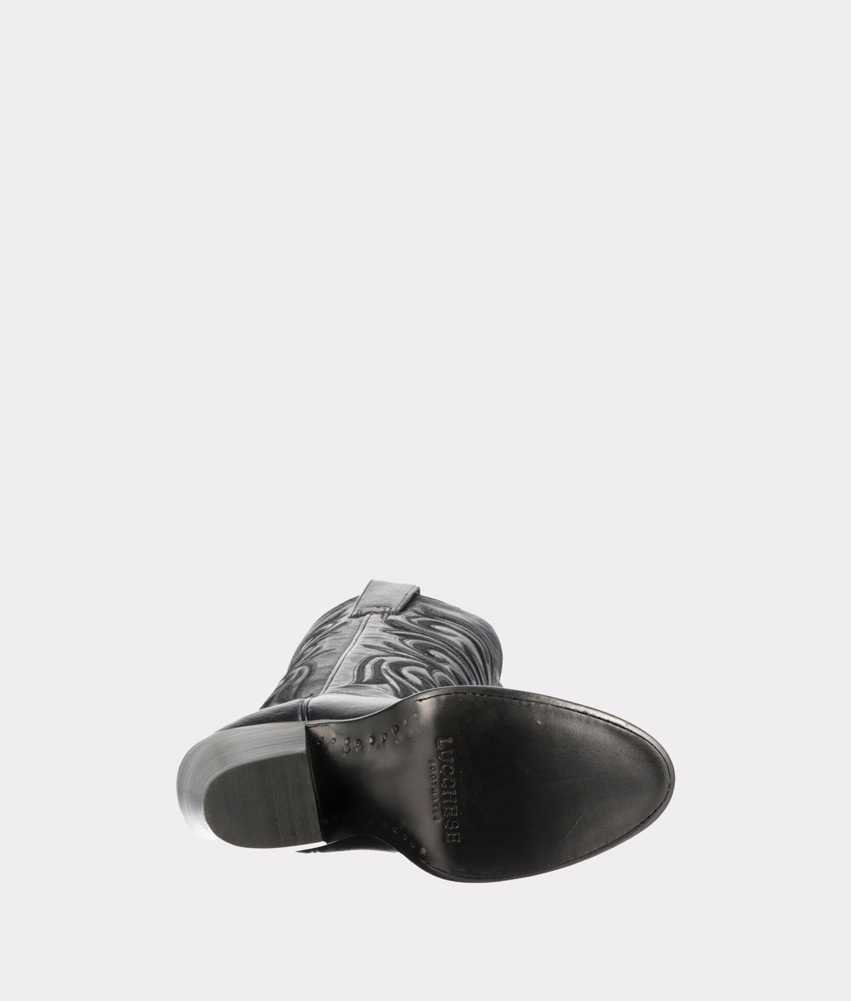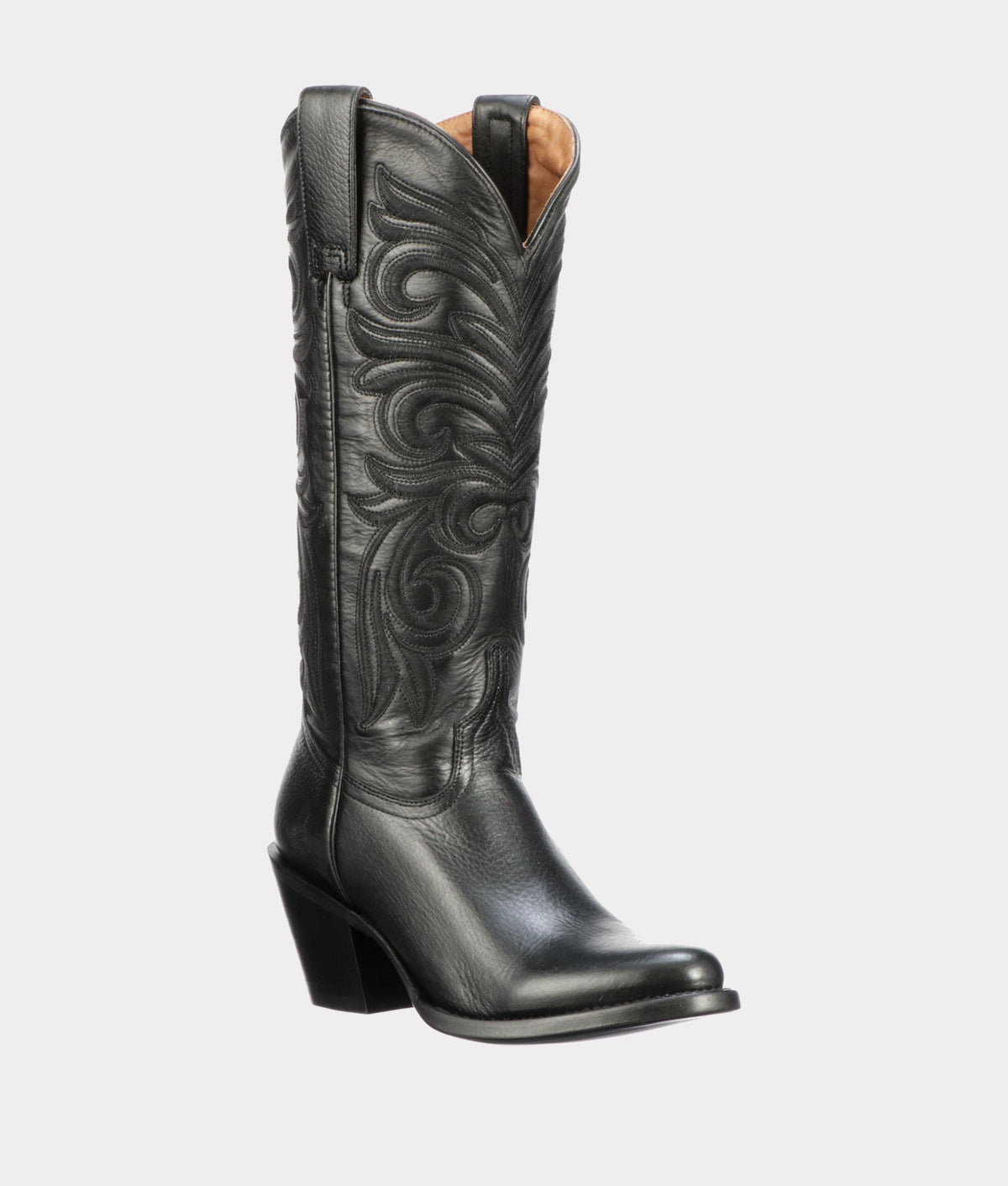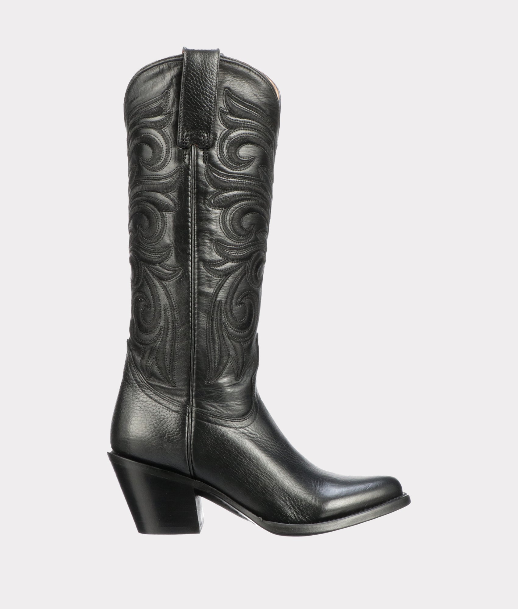 Carefully handcrafted, Laurelie is fashioned from Cowhide leather adorned with a beautiful hand-stitched quarter. Laurelie is a 13-inch tall stunner with quarters just a little taller than many cowgirl styles; a 3-inch heel lends a little extra height.