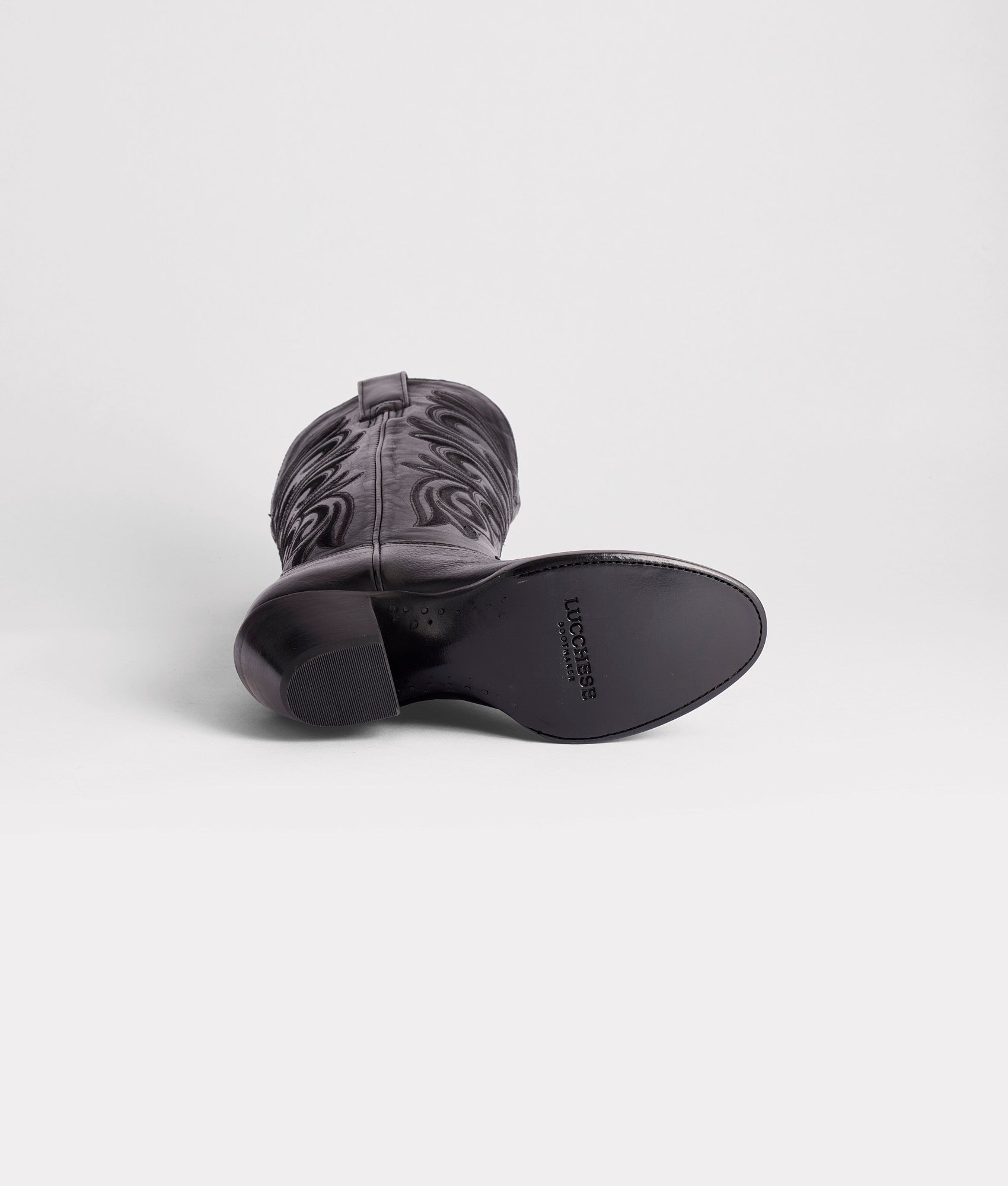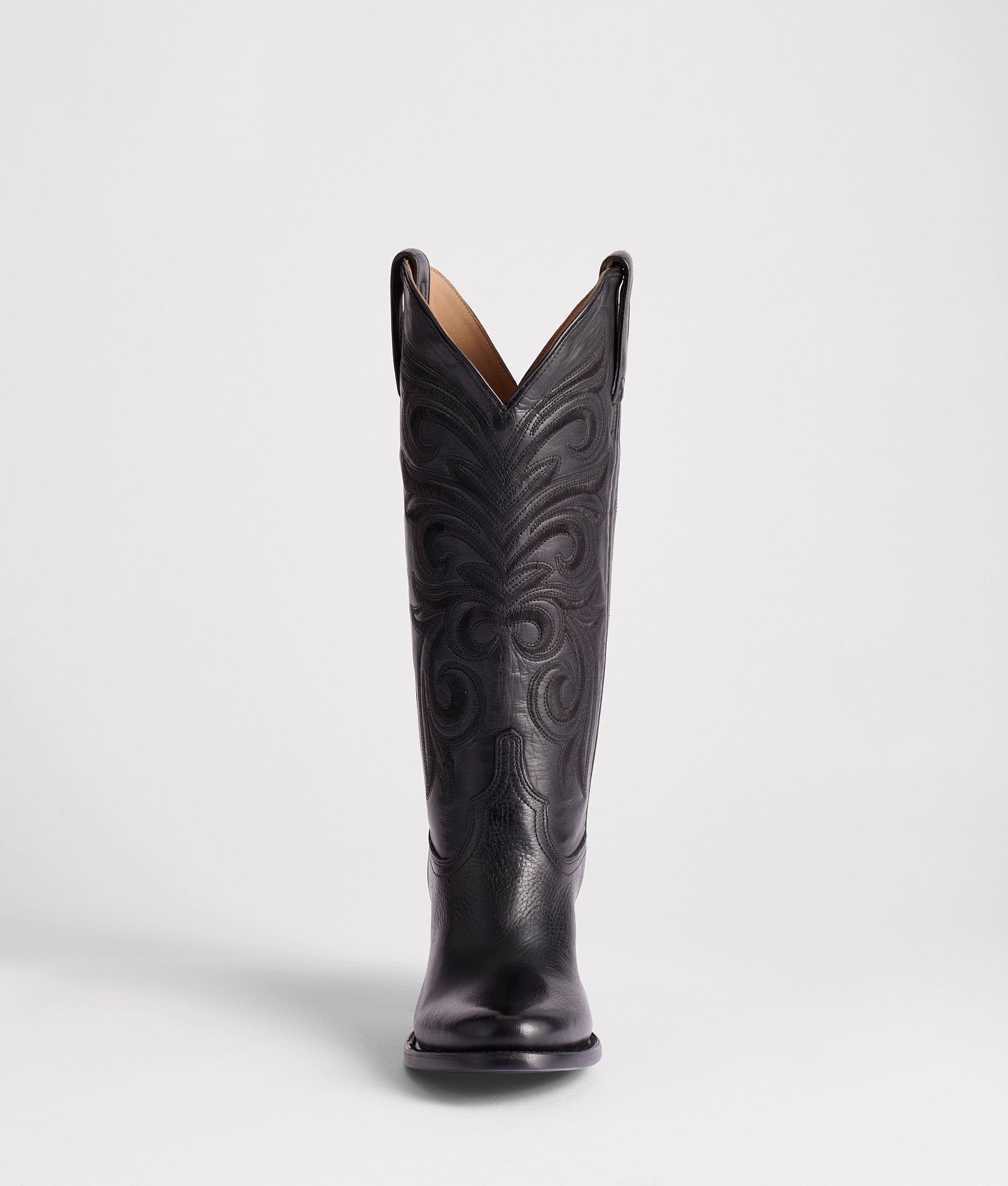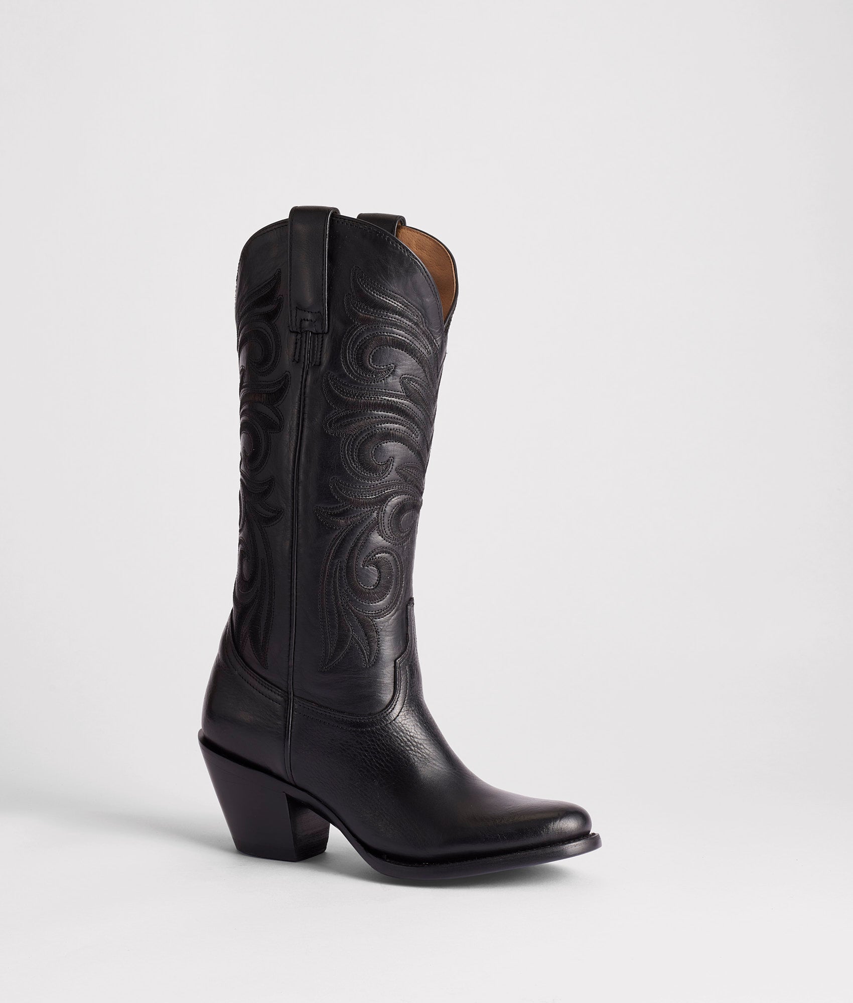 Carefully handcrafted, Laurelie is fashioned from Cowhide leather adorned with a beautiful hand-stitched quarter. Laurelie is a 13-inch tall stunner with quarters just a little taller than many cowgirl styles; a 3-inch heel lends a little extra height.