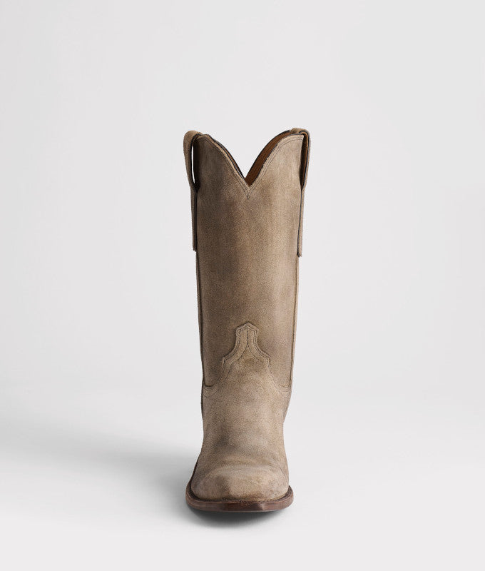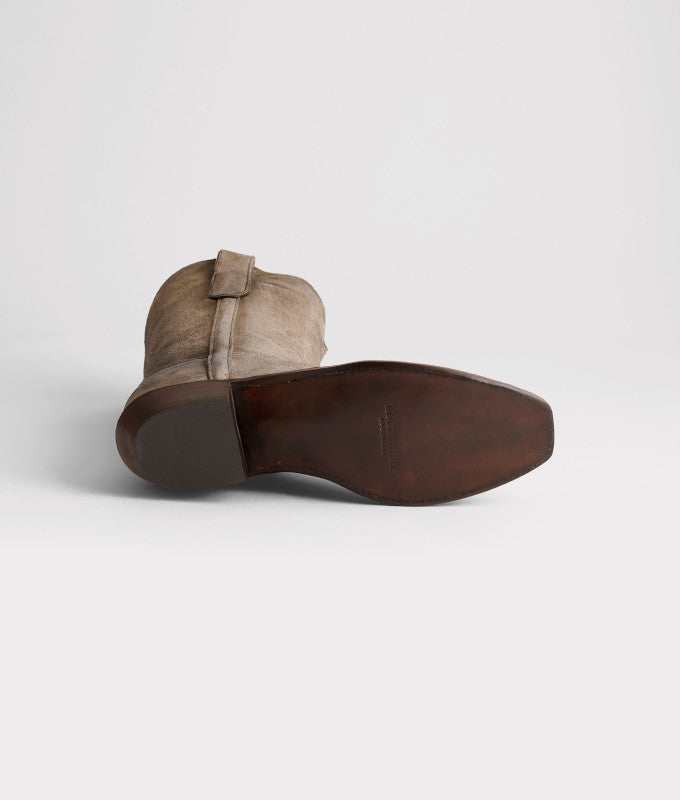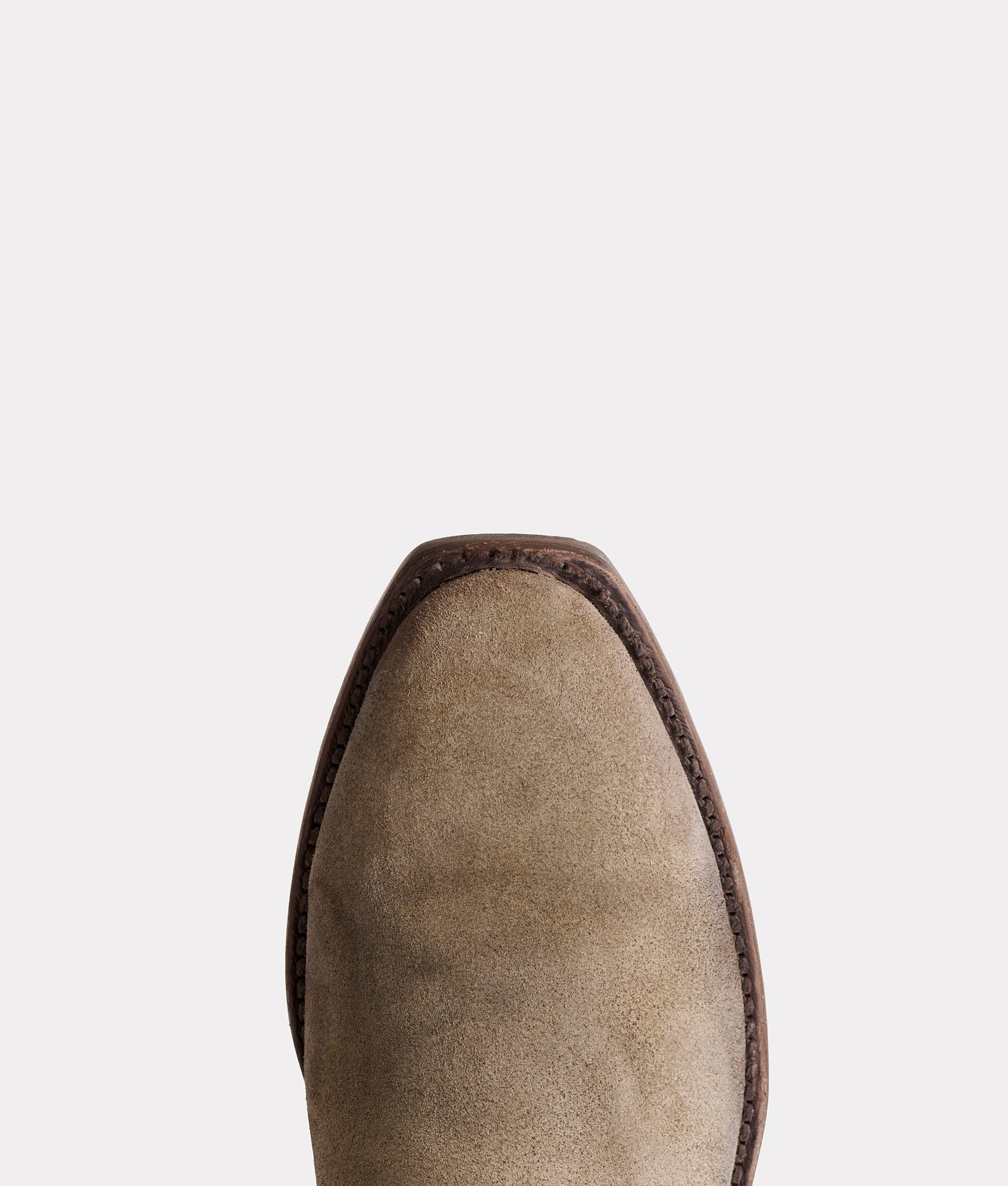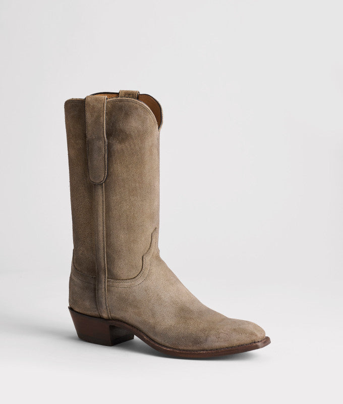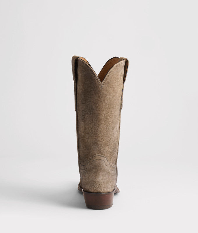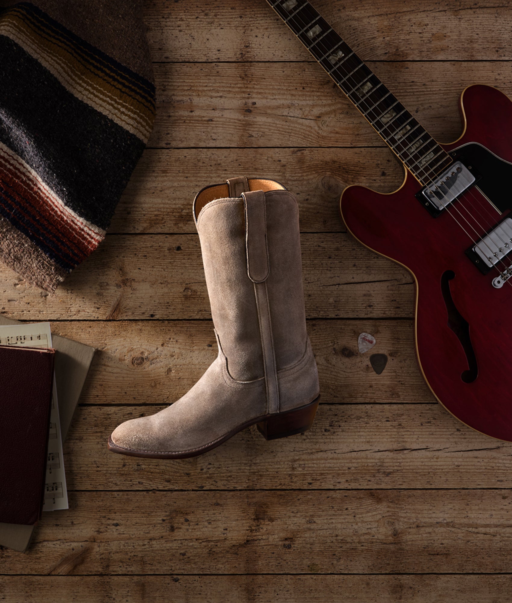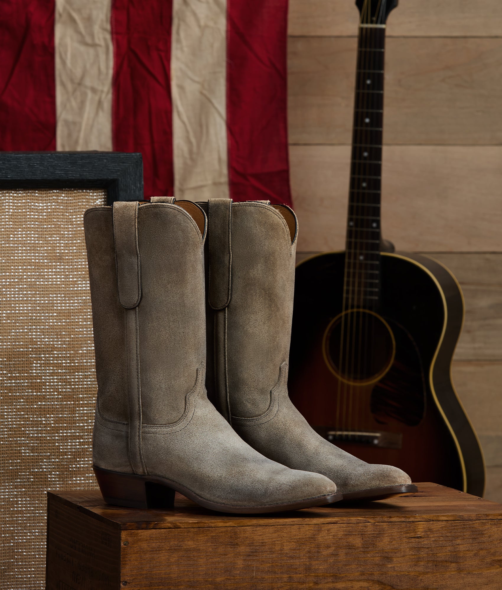 Part of Chris Stapleton's Volume II collection, the Old Friend pays homage to Chris' heroes. Rugged in nature and vintage in design, the Old Friend is a piece of the "songwriters’ uniform". This Western silhouette bridges the gap between grit and traditionalism with silky Italian suede and classic Mule Ear pull straps - a Torero side seam lends visual texture to a timeless boot. Handmade in Texas.