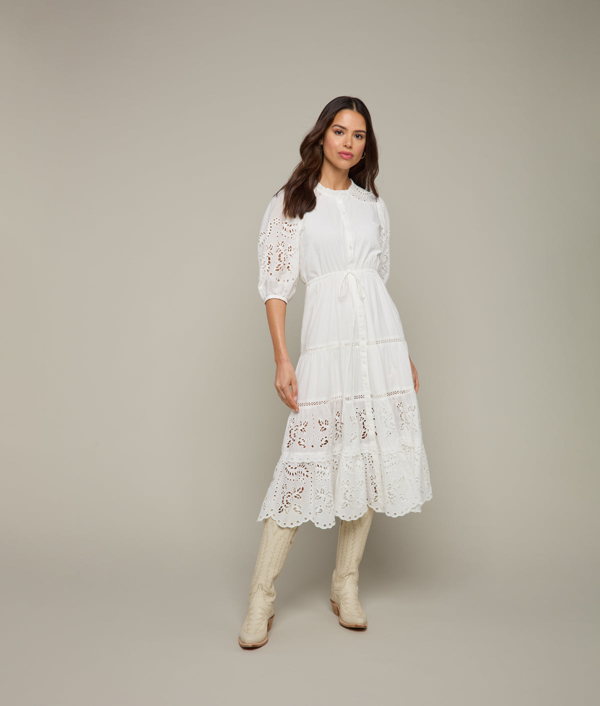 The Penelope Dress is perfect for those warm spring days. The ruffle stand collar adds a touch of delicate charm, while the bishop sleeves lend a refined, flowing silhouette. The dress features a button closure, offering both practicality and style and its contoured hem provides a flattering, feminine shape. A perfect addition to any wardrobe, the Penelope Dress embodies effortless grace with modern sensibility.