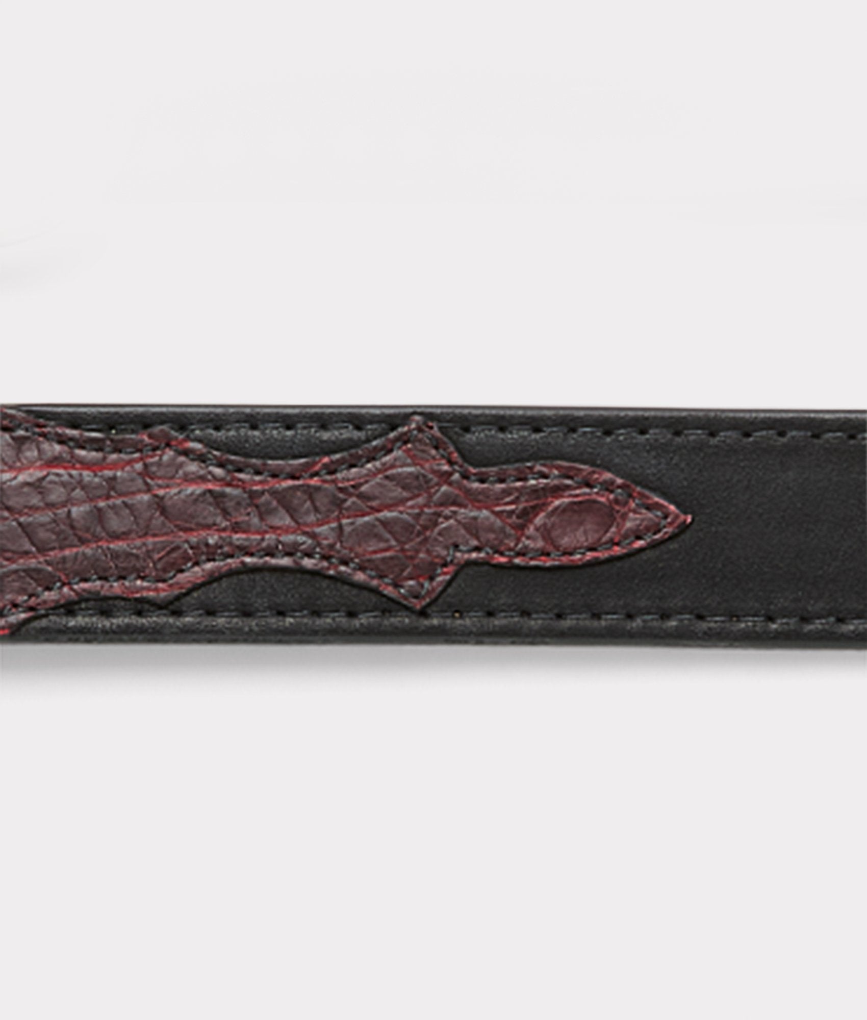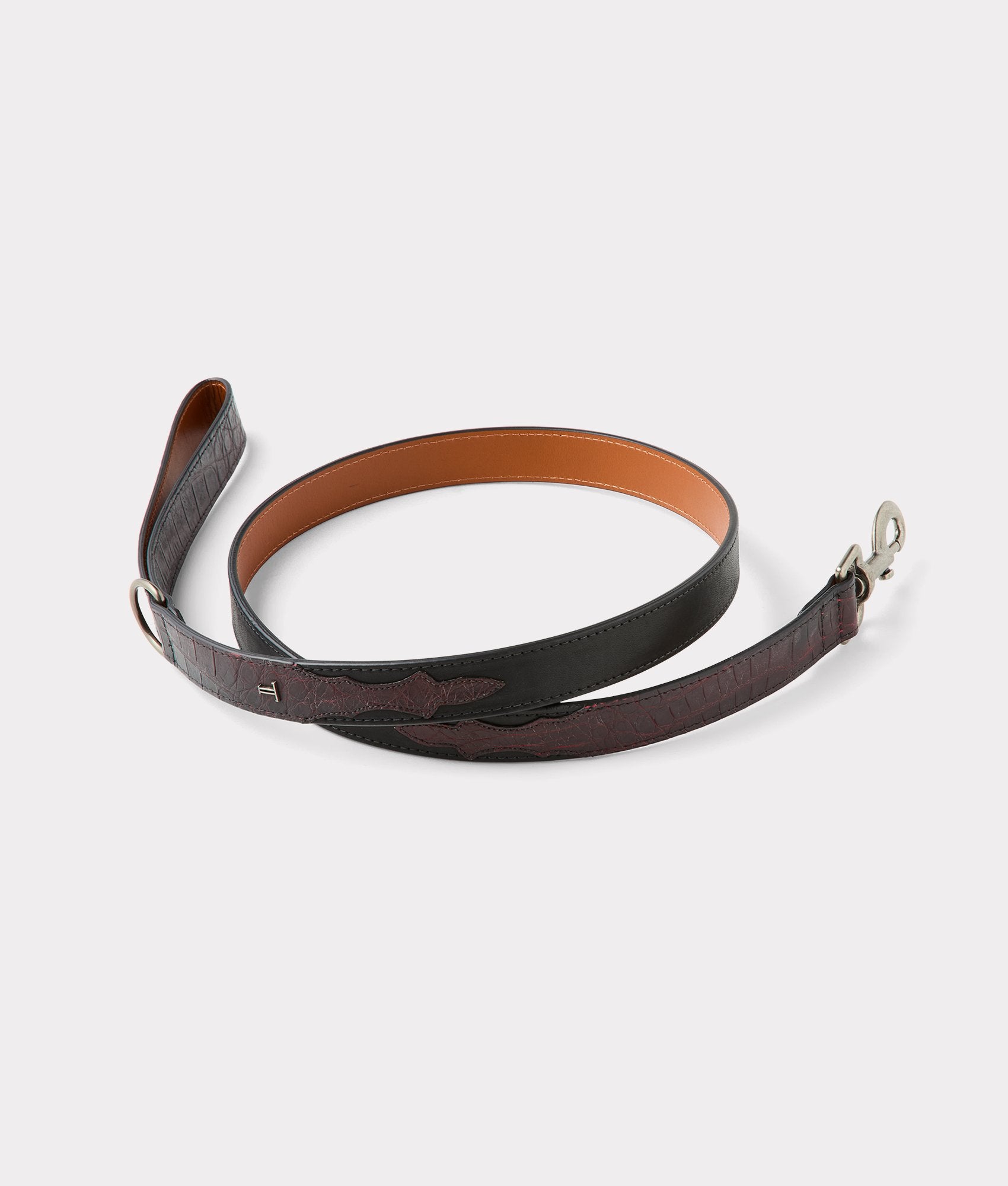 This dog leash is crafted from premium black Cowhide with black cherry Caiman accents for an elevated Lucchese look. Finished with antiqued nickel hardware, it offers durability with a refined, luxurious touch. Go to the nearest Lucchese Store to get a custom embossing with your pup's name.