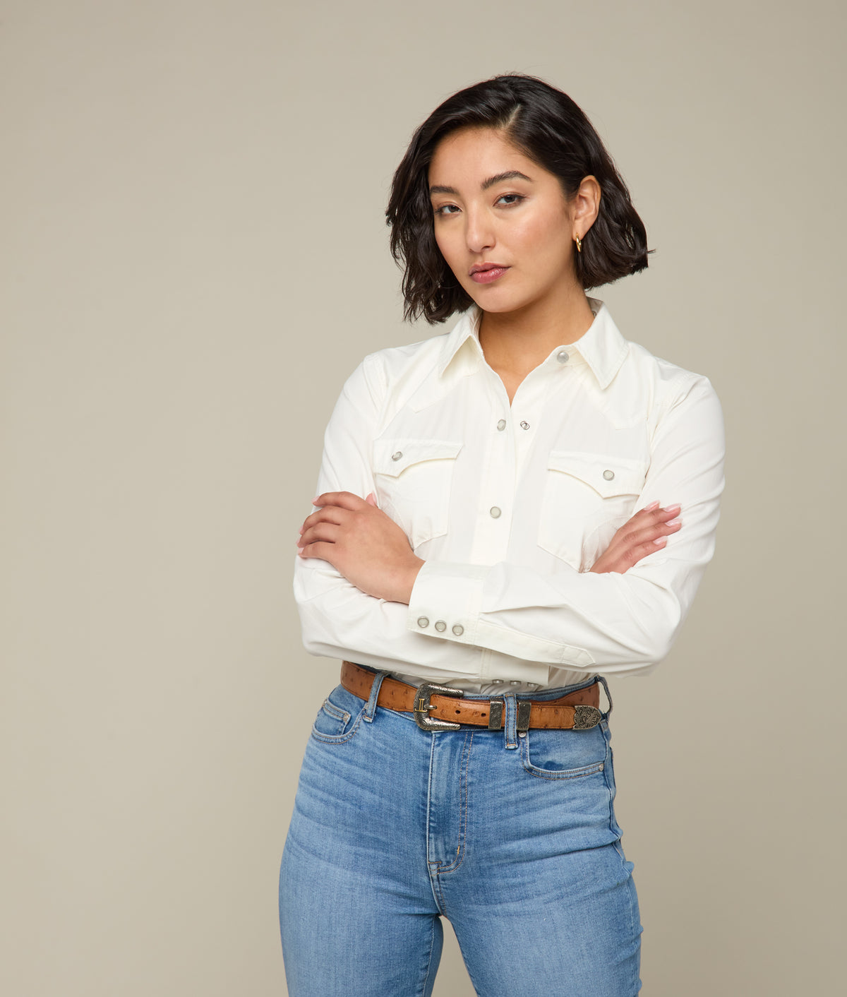 Reese is the quintessential Western snap shirt for the cowgirl. Its slim silhouette offers maximum comfort when out and about. Stonewashed or gently handled, this shirt offers that ”snappy” clean feel. Reese is adorned with our iconic boot toe medallion embroidered on the front pockets, nodding to our one-of-a-kind boots.