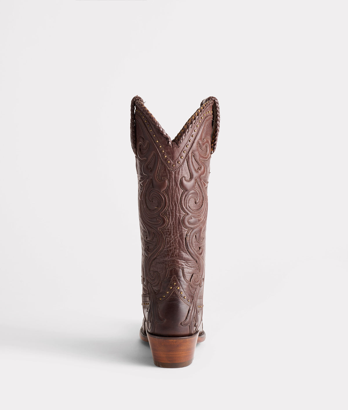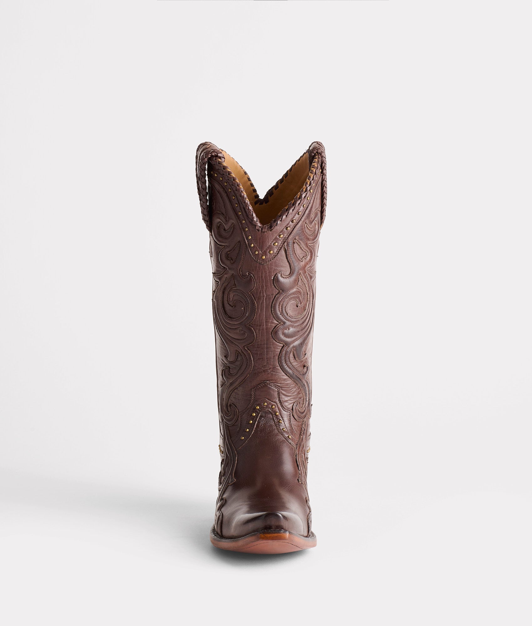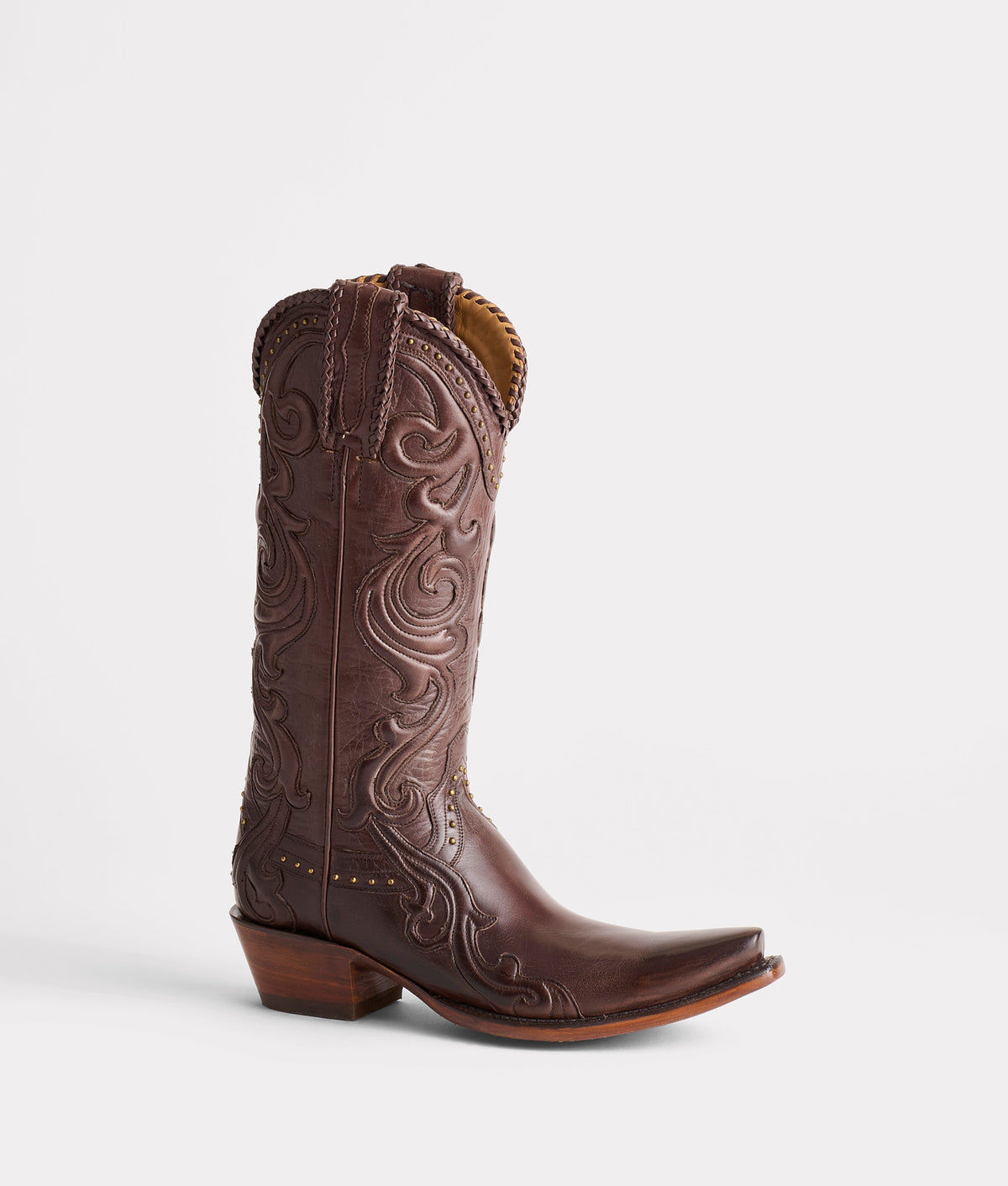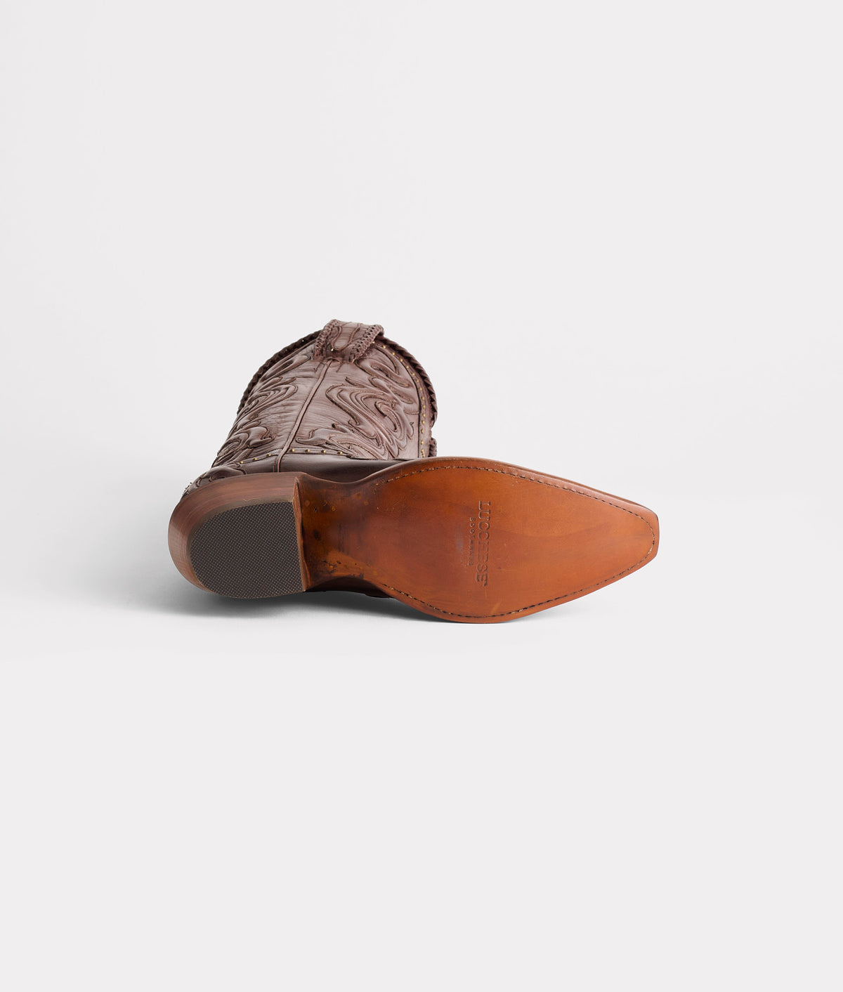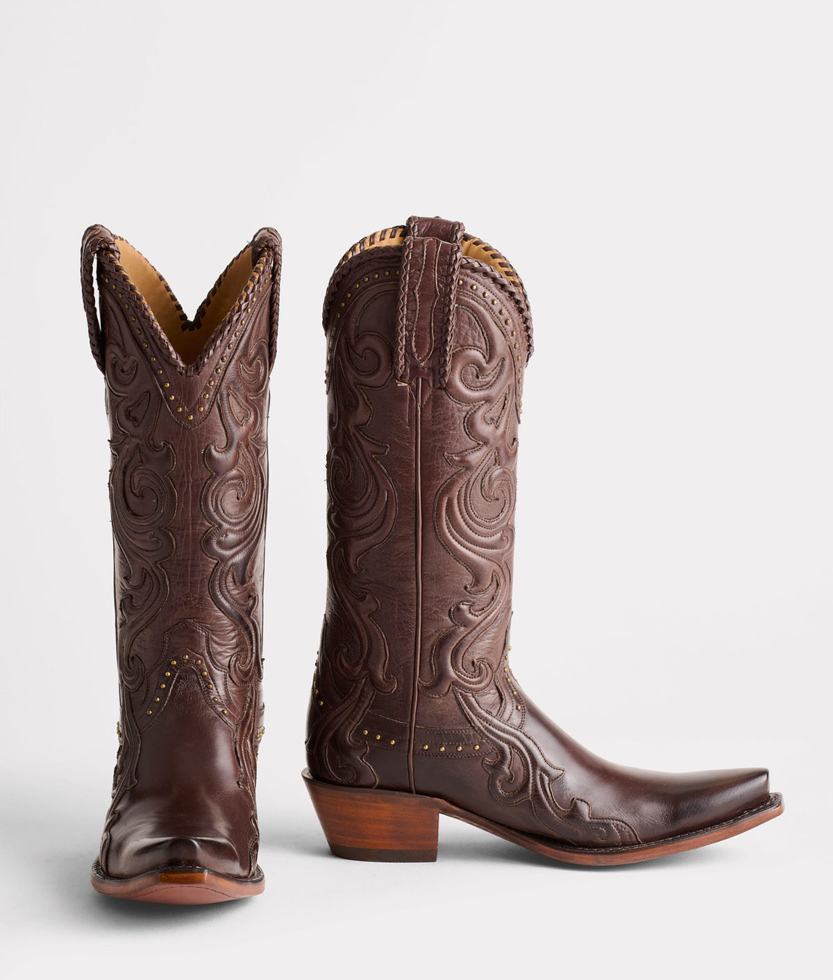 The Buffalo version of sister boot Sheridan, Saratoga’s supple leather is silken to the touch. Small golden studs run beneath the hand braided collar and along the crown, and the French Calf scroll overlay stands out proudly against the tops for an exceedingly elegant Western aesthetic. Handmade in Texas.