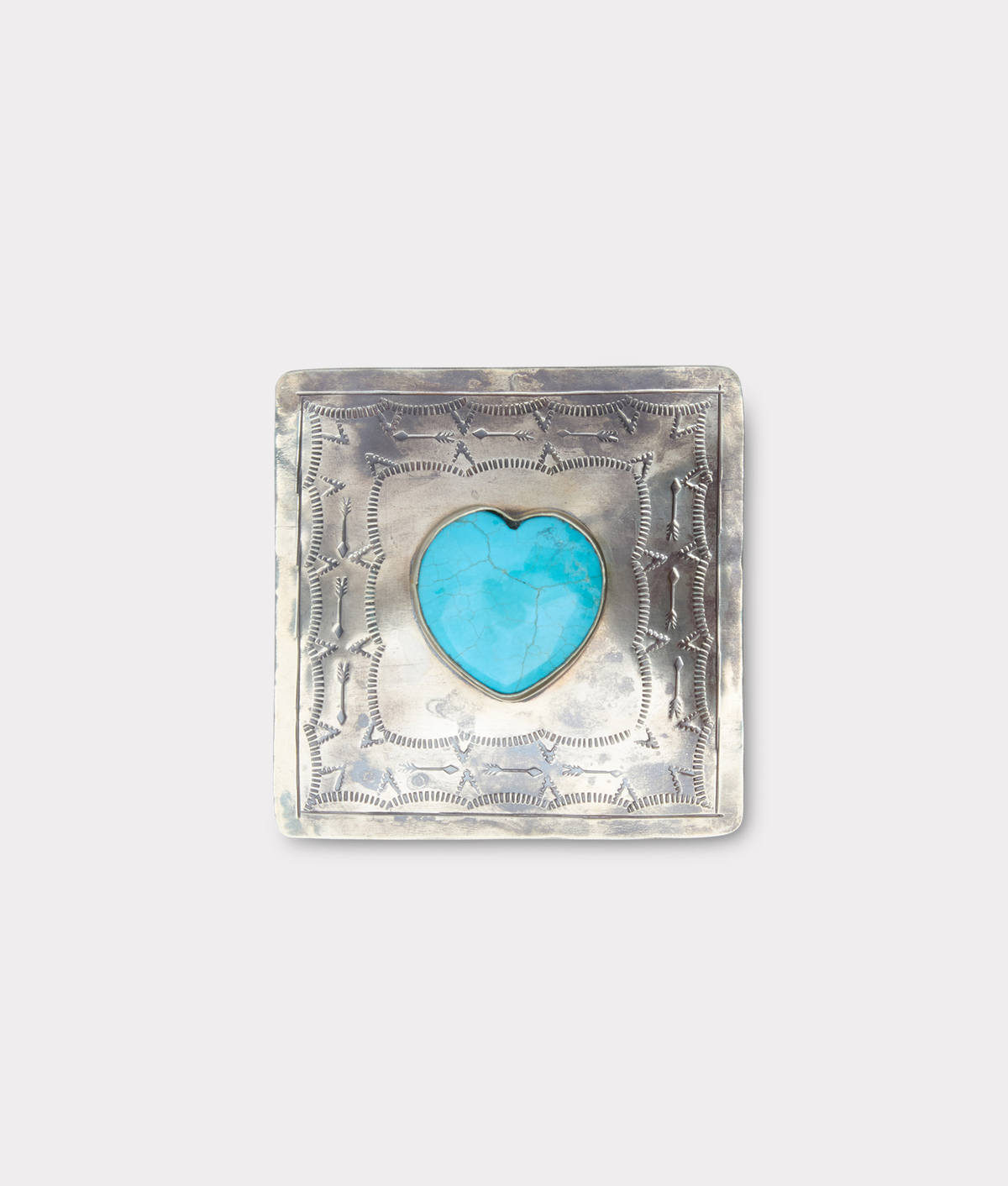 The Silver Heart Box tips its hat to the Southwest. Intricate engravings showcase the beauty of Southerwestern style, while the hand-picked turquoise heart gives this beautiful box its pulse. A refreshingly vintage exterior finish nods to the artisan who so carefully made this piece. Lined with silky velvet, your personal items are safe and protected from damage when stowed away.