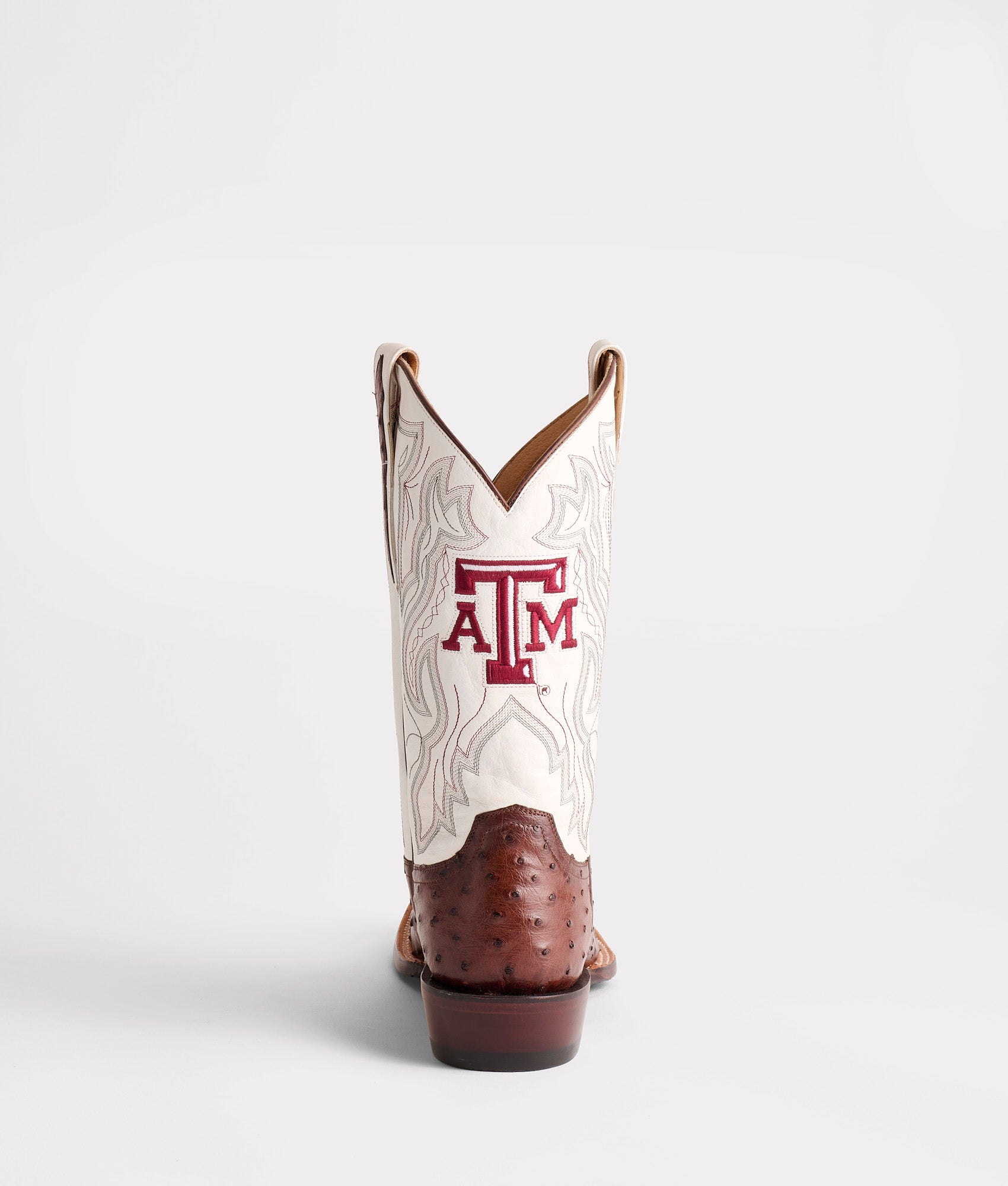 A tribute to the heart of Aggie Baseball since 1978, The Olsen is named after Texas A&M’s beloved baseball field and honors hard work and dedication that define the 12th Man. This handcrafted chocolate Full Quill Ostrich boot embodies tradition and grit. Featuring the iconic Texas A&M Block logo on the quarters, The Olsen pays bold homage to Aggieland’s legacy.