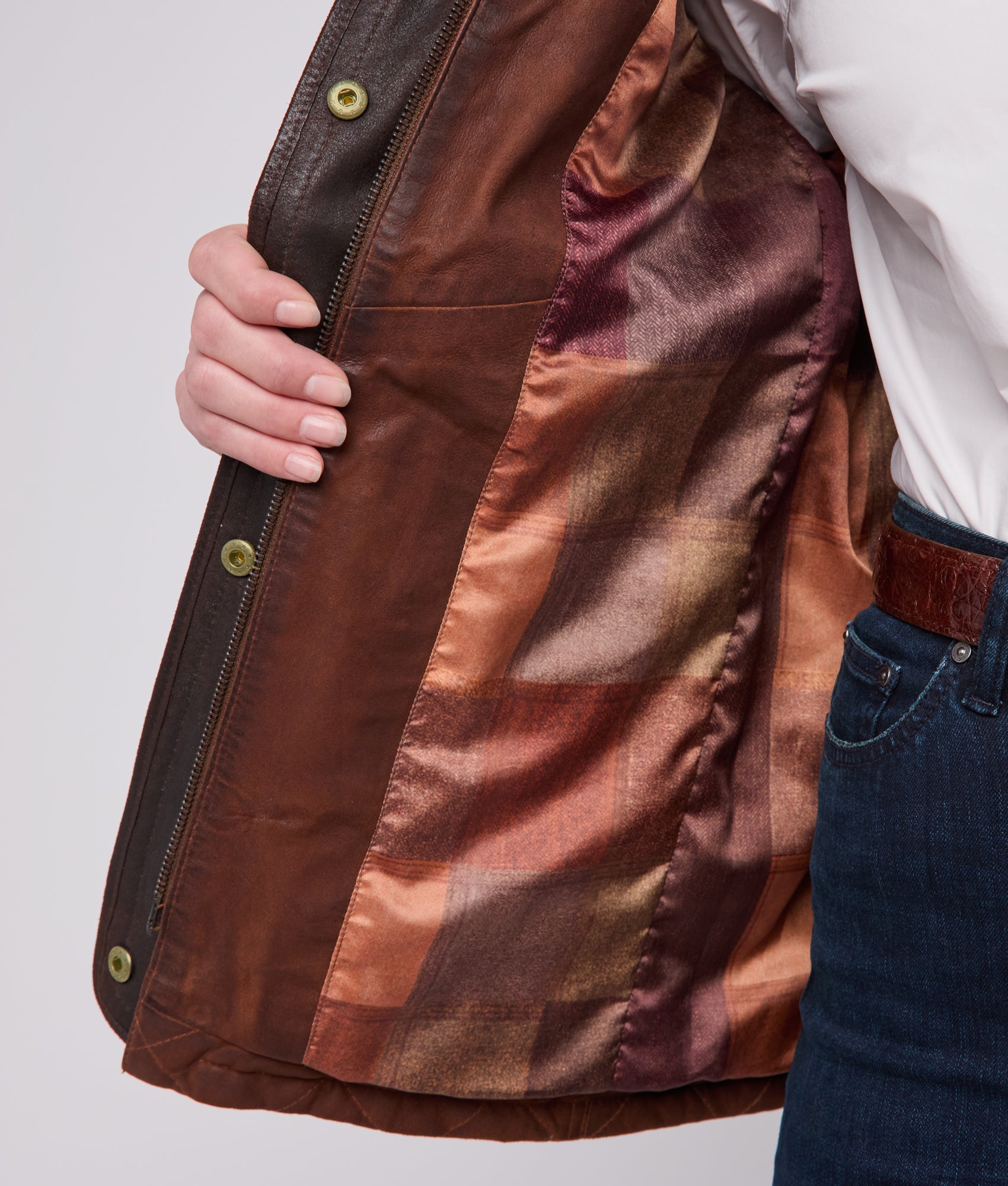 - Front snap and zip closure
