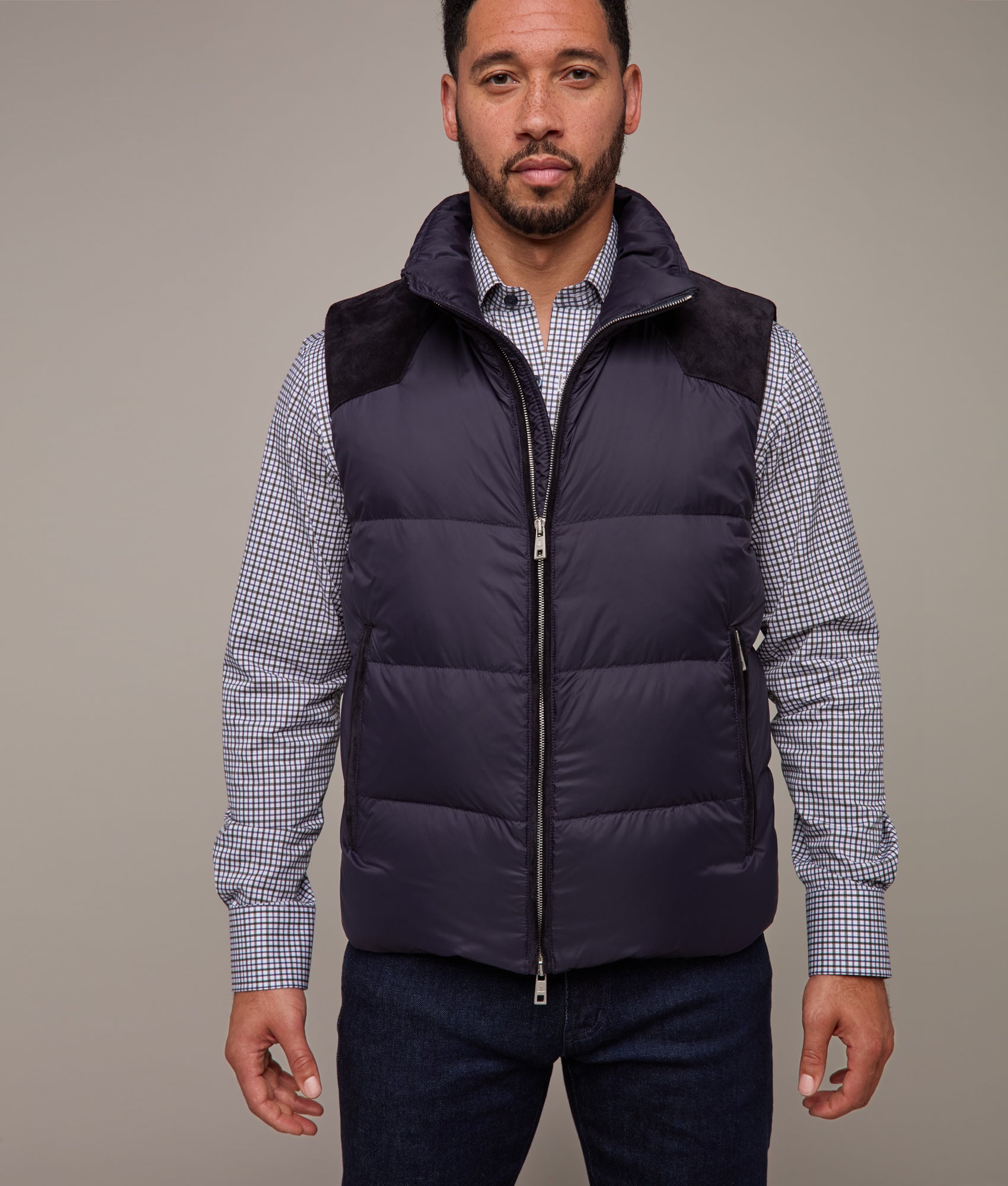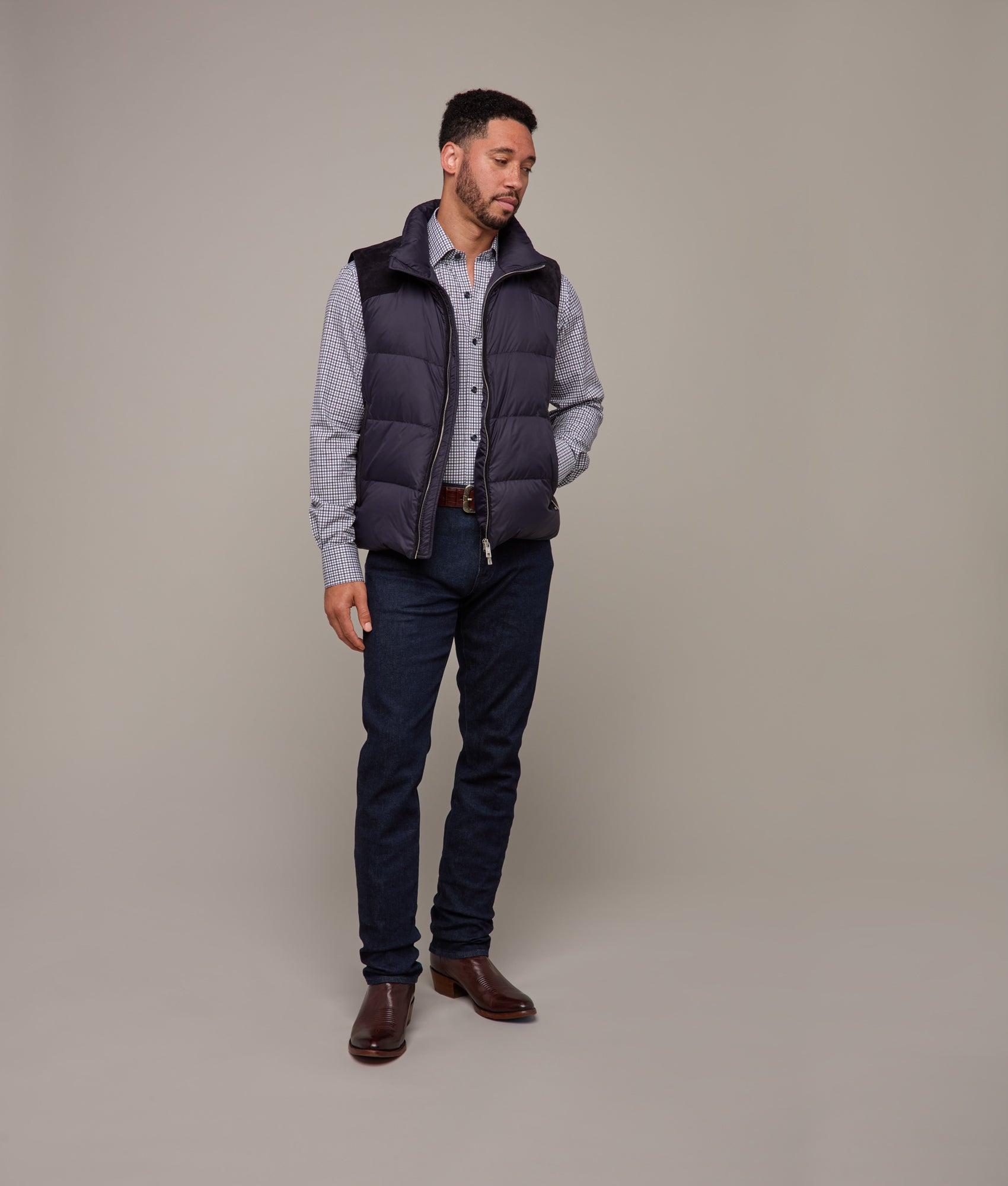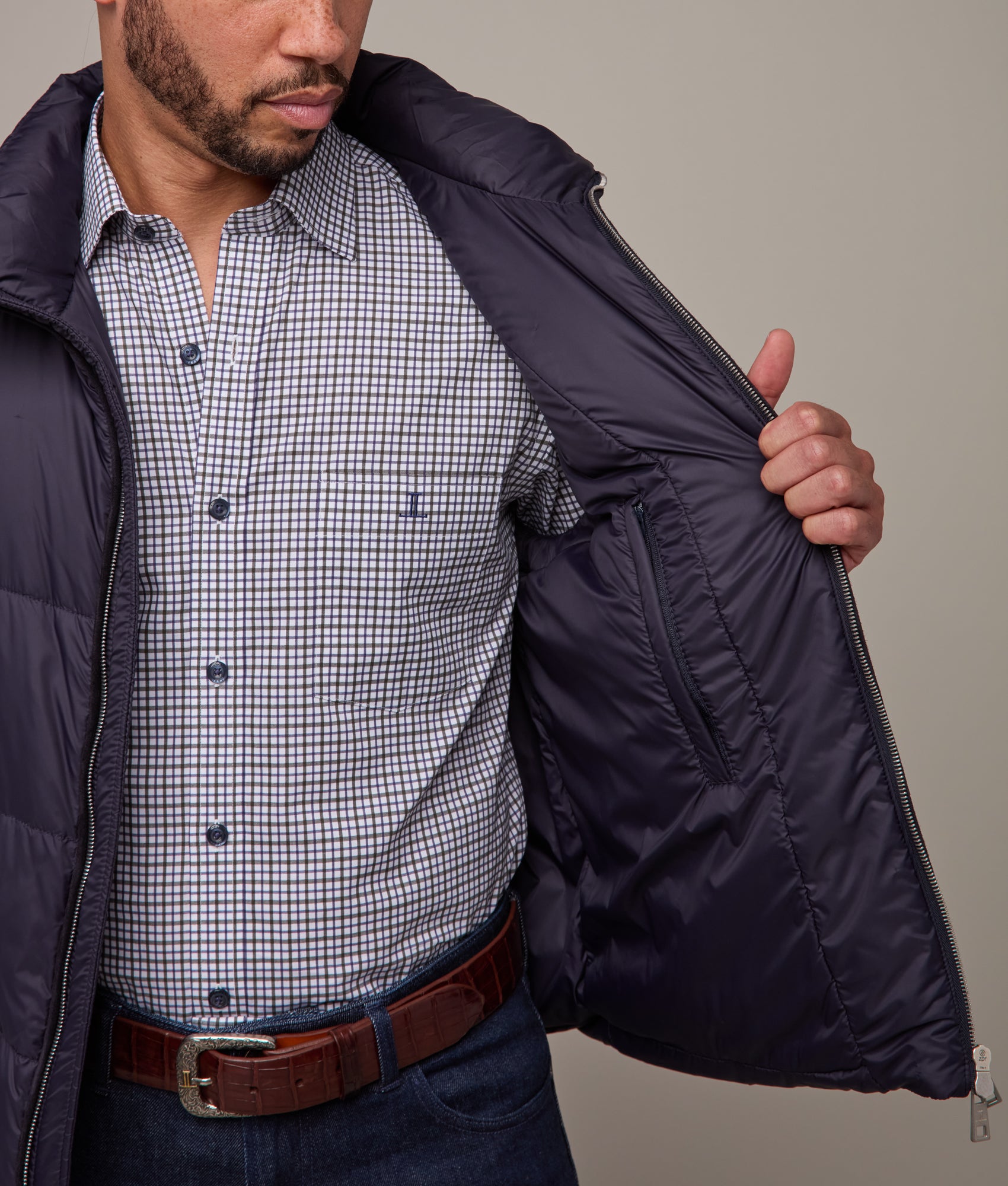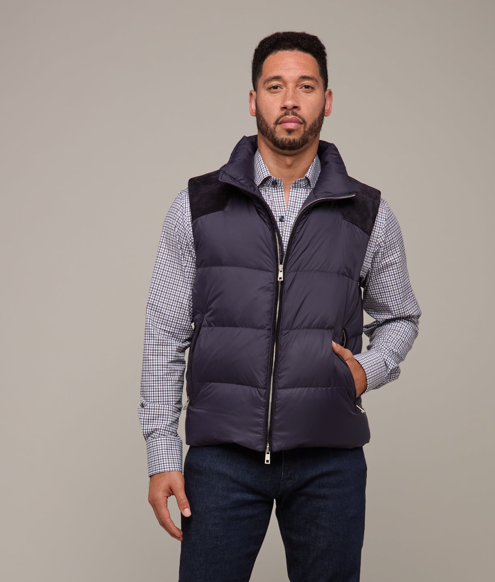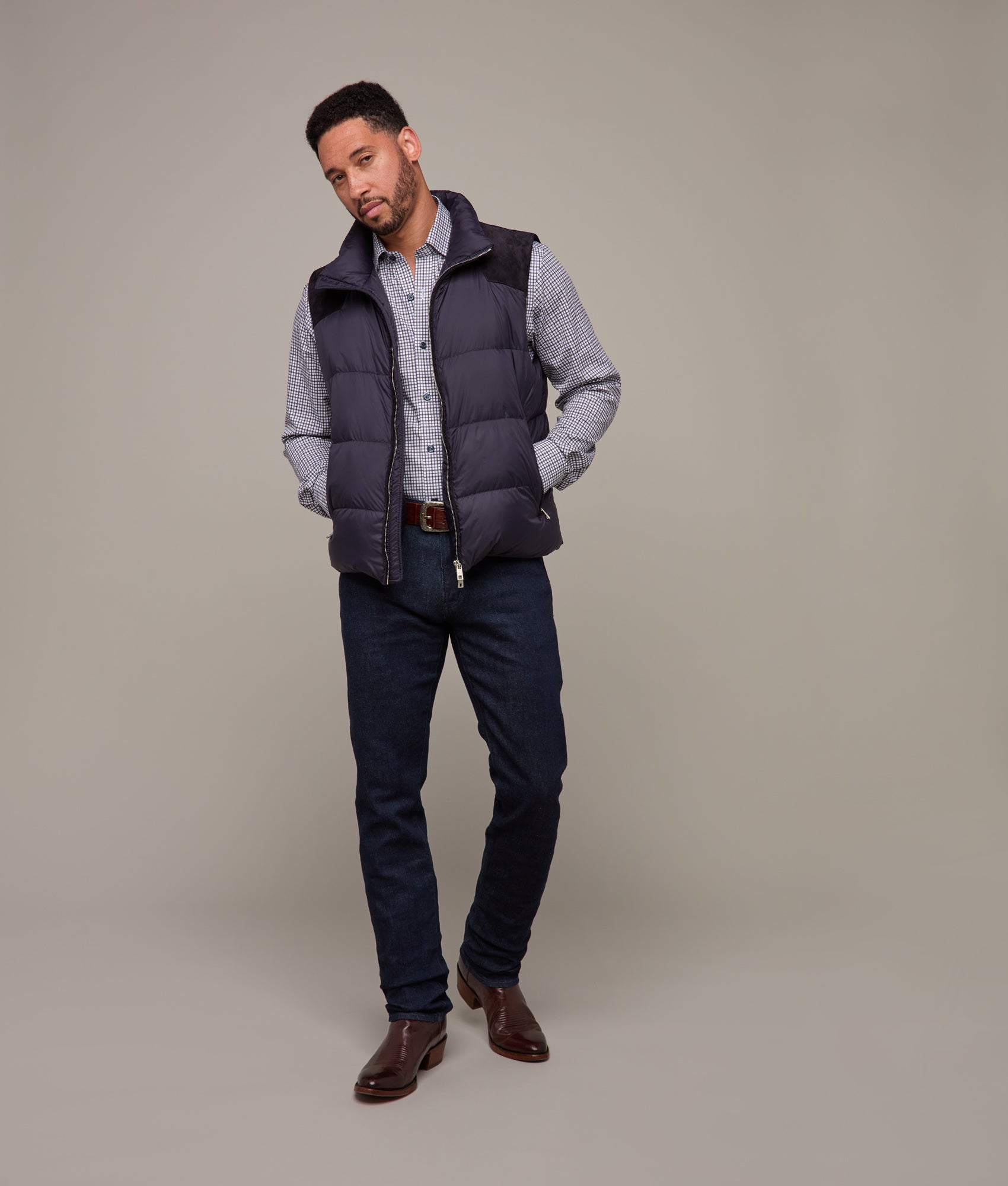 The Vaquero Puffer Vest provides warmth without bulk, while rich calf leather trim nods to classic cowboy craftsmanship. A 100% polyamide shell and natural down fill are lightweight and easy to pack. Lined in tonal polyamide for ease and comfort, it’s built for range and city alike. Made in Italy.
